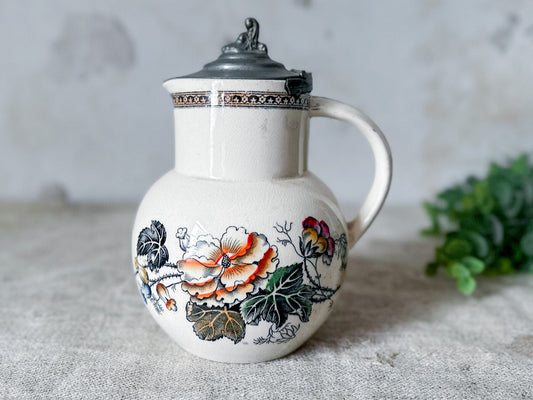 Antique Ironstone Polychrome Floral Syrup Jug with Pewter Lid