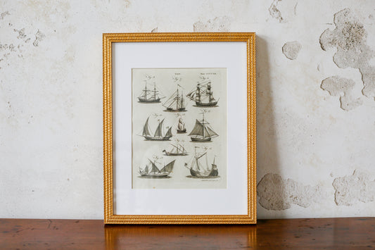 18th Century Copper Plate Engraving of Sailing Ships | Contemporary Textured Gilt Frame