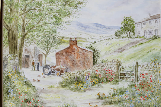 Original English Watercolor Painting of Farmyard in Spring