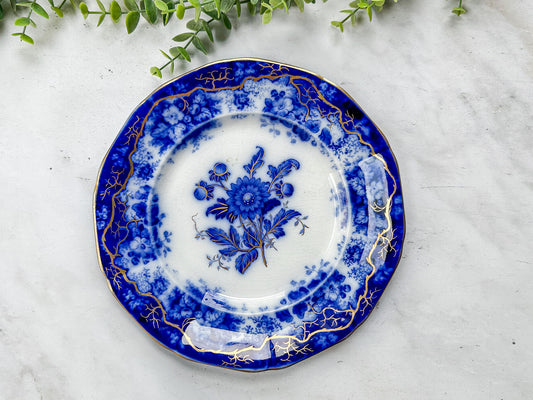 Antique Gilt Flow Blue Floral Ironstone 8” Plate