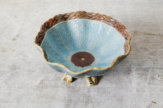 Joseph Holdcroft Majolica Basketweave Teal Bowl with Faux Bois Branch Base