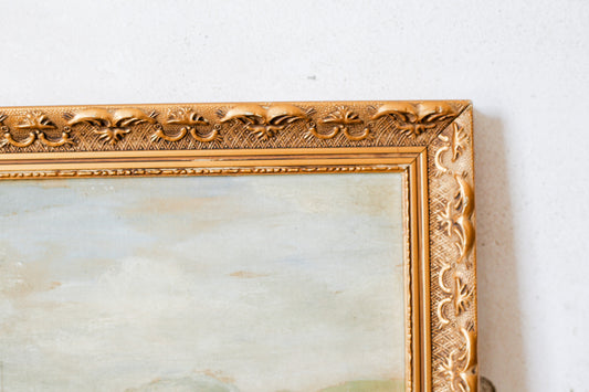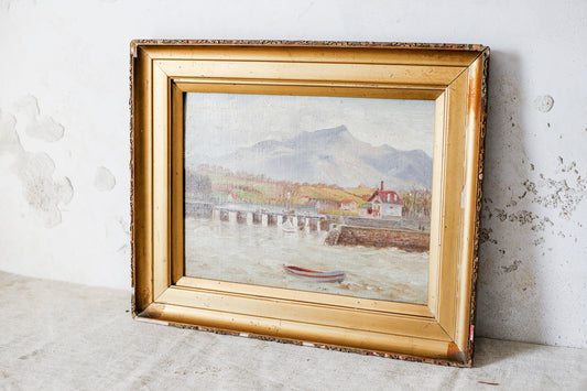 Antique Oil Landscape of Mountains and Lake Harbor