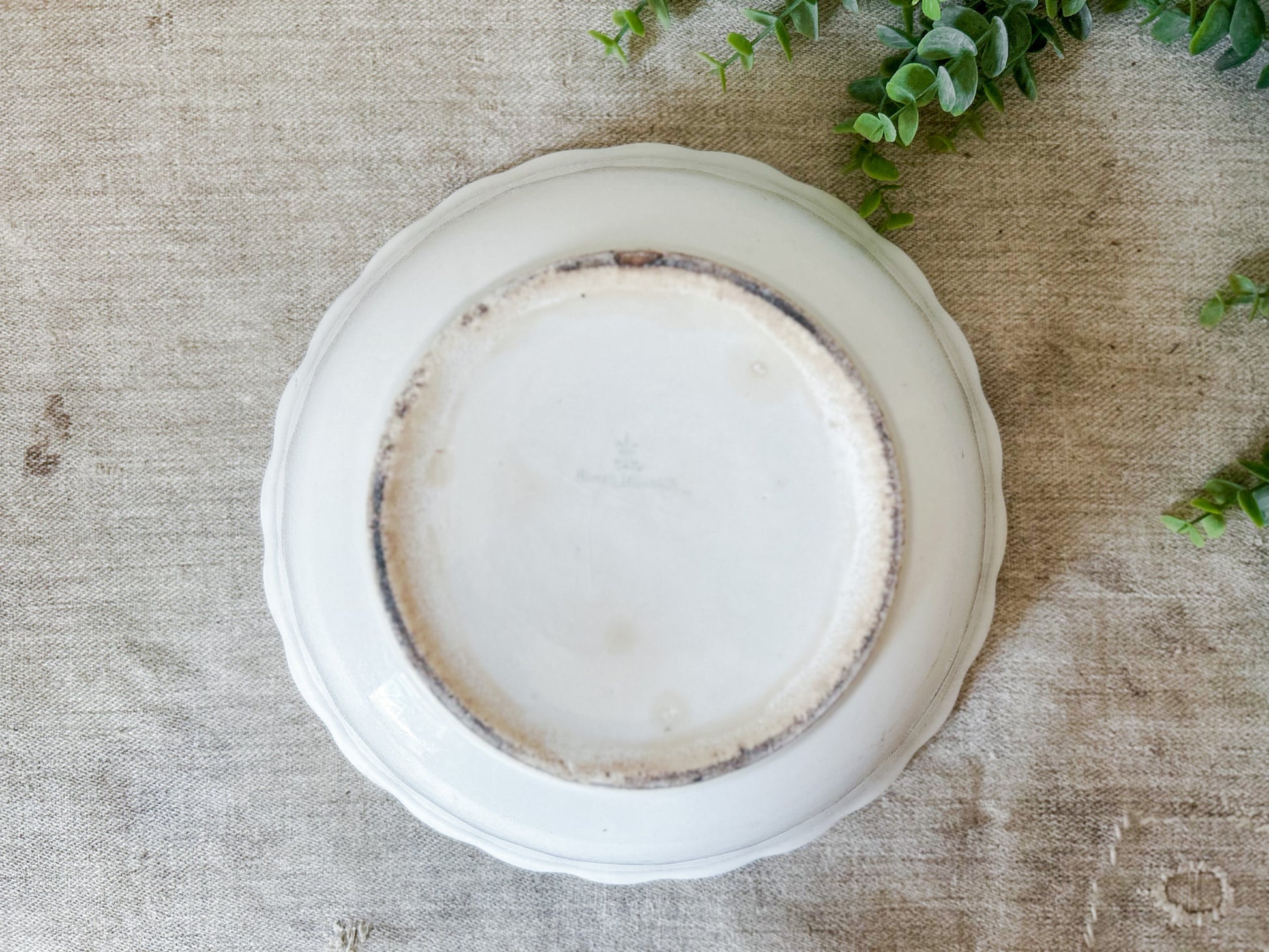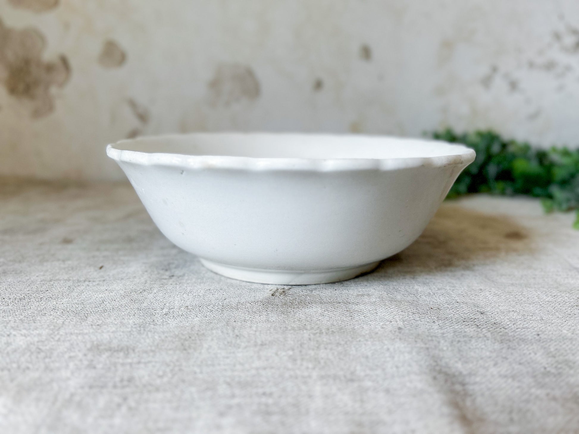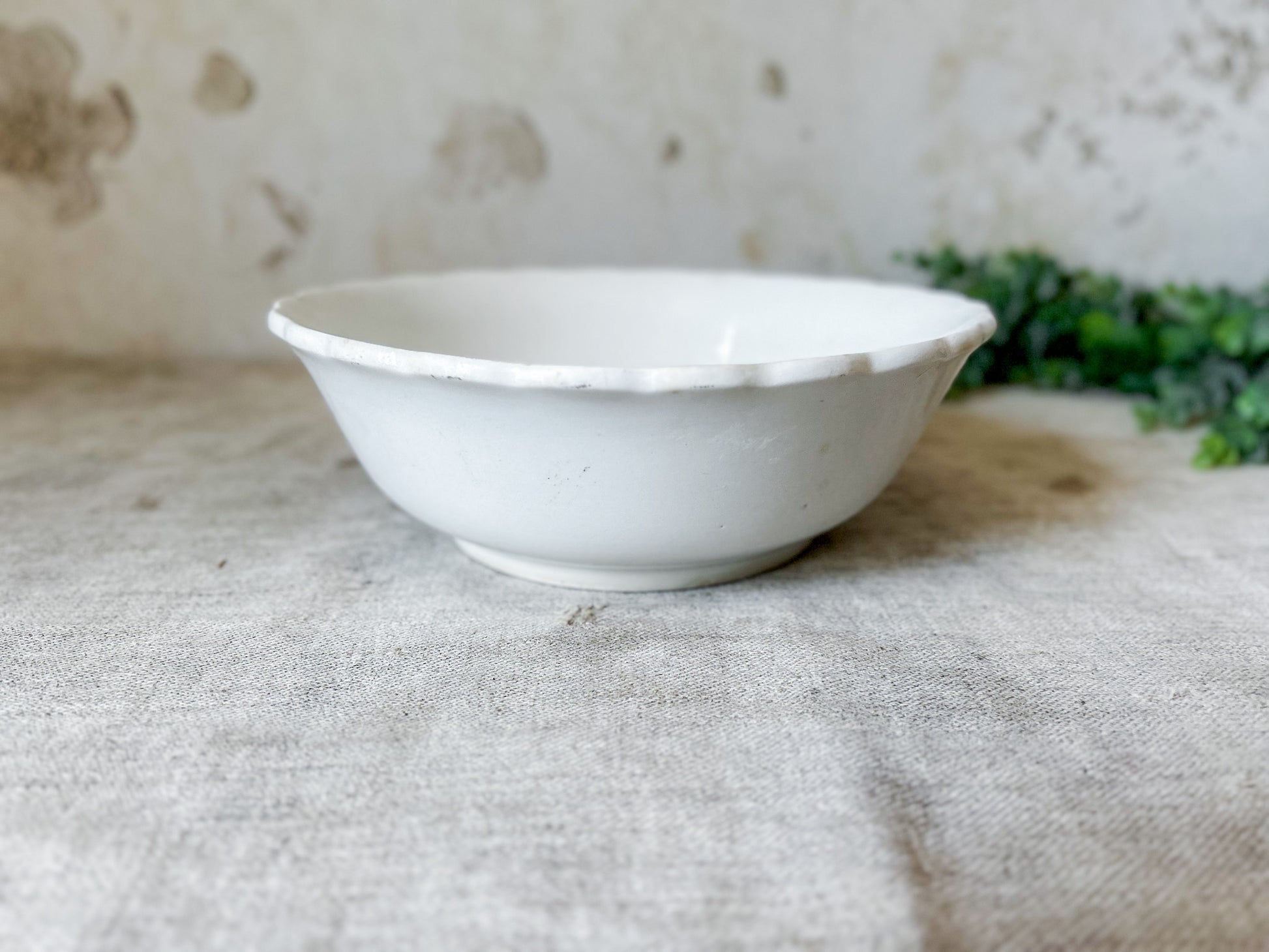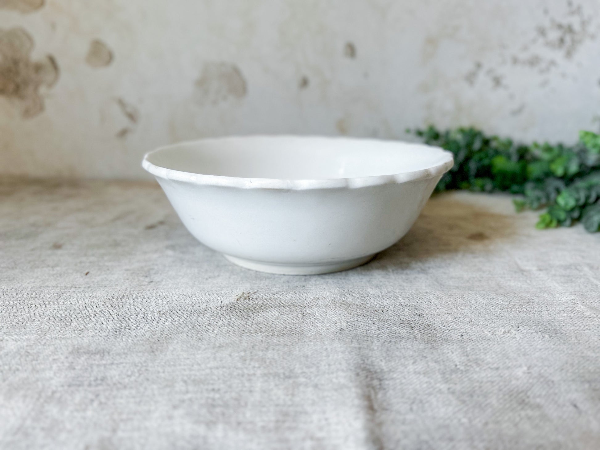 Available is a vintage ironstone serving bowl by Homer Laughlin. The attractive scalloped rim accentuates the white stoneware. There is discoloration on the base of the bowl and on the interior glazing marks. Base has a printed stamp that reads "Homer Laughlin." Design dates this piece to c1900.