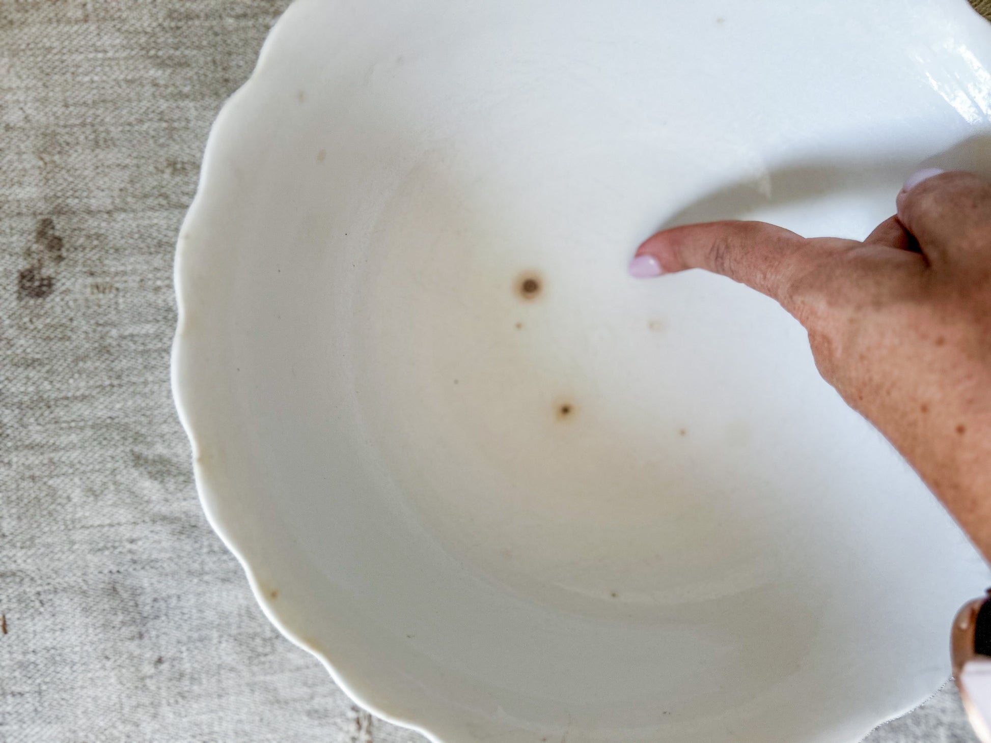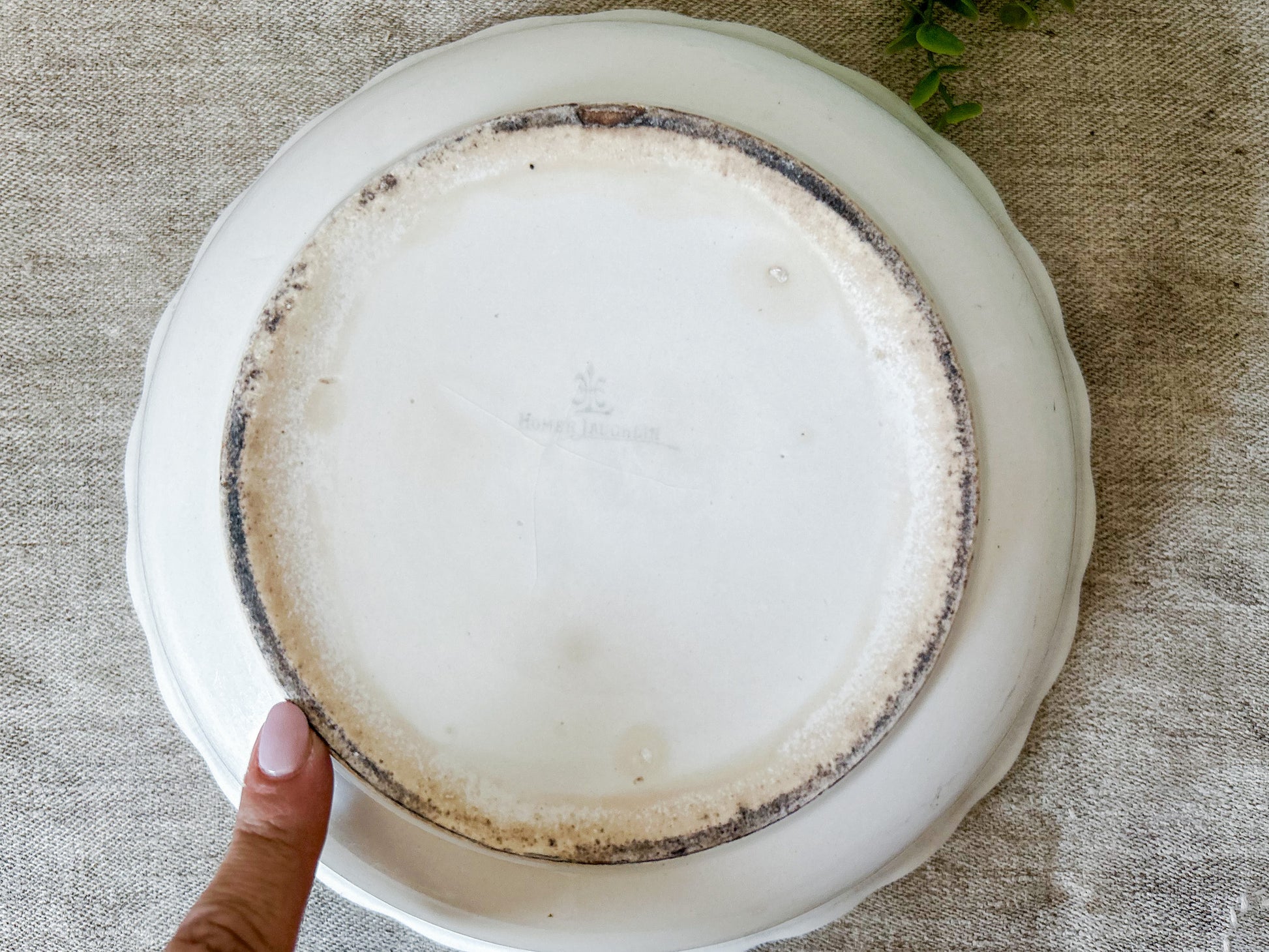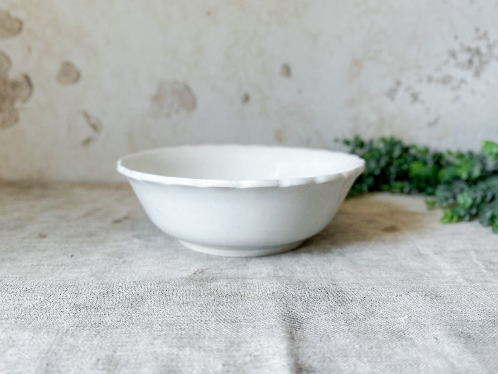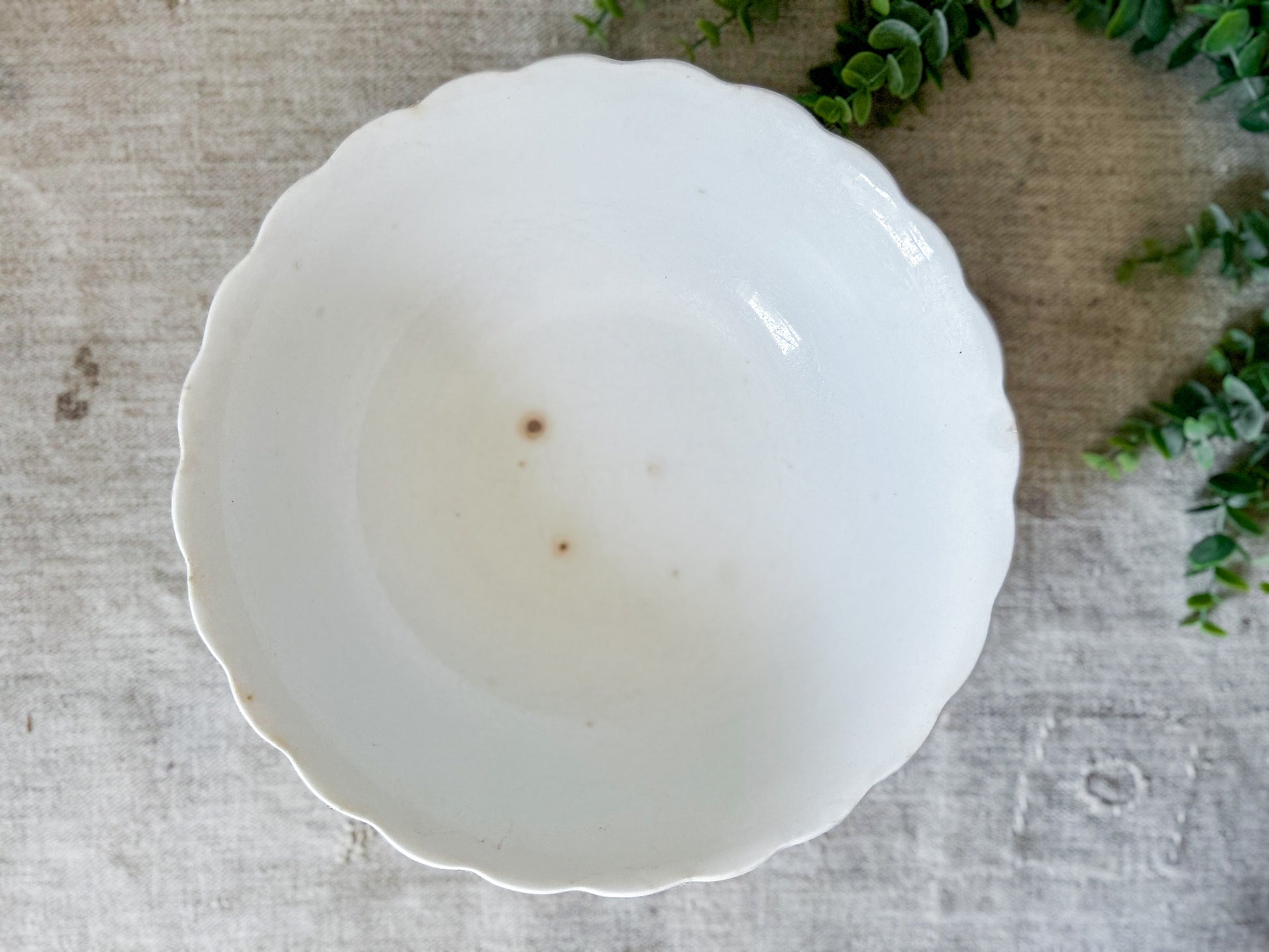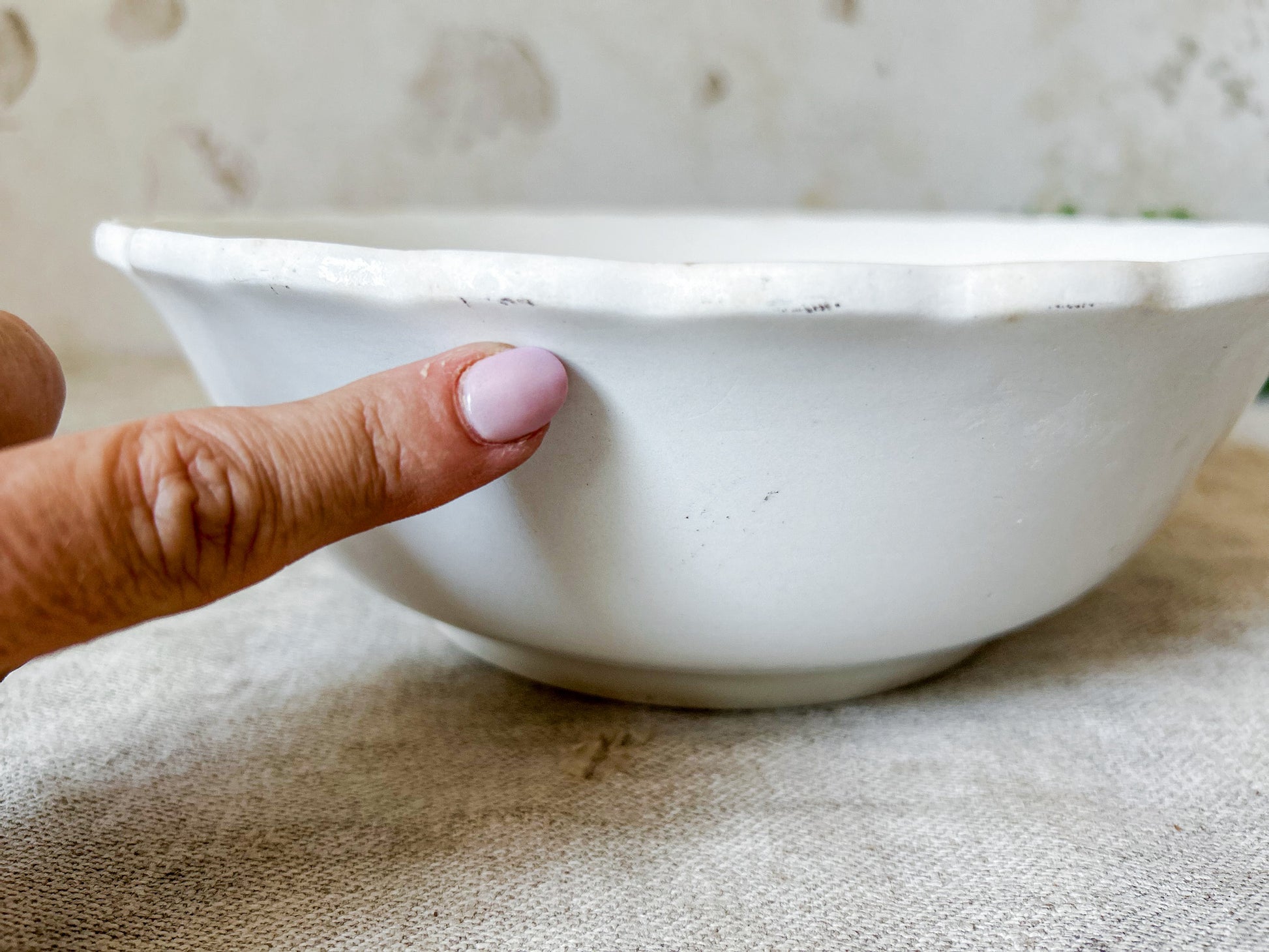 Available is a vintage ironstone serving bowl by Homer Laughlin. The attractive scalloped rim accentuates the white stoneware. There is discoloration on the base of the bowl and on the interior glazing marks. Base has a printed stamp that reads "Homer Laughlin." Design dates this piece to c1900.