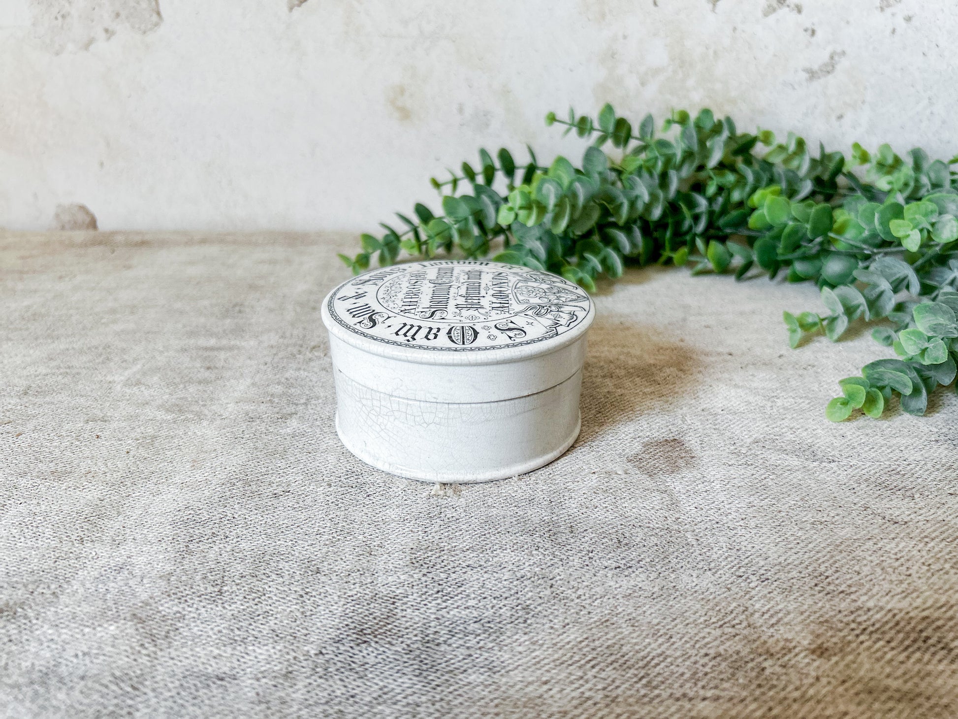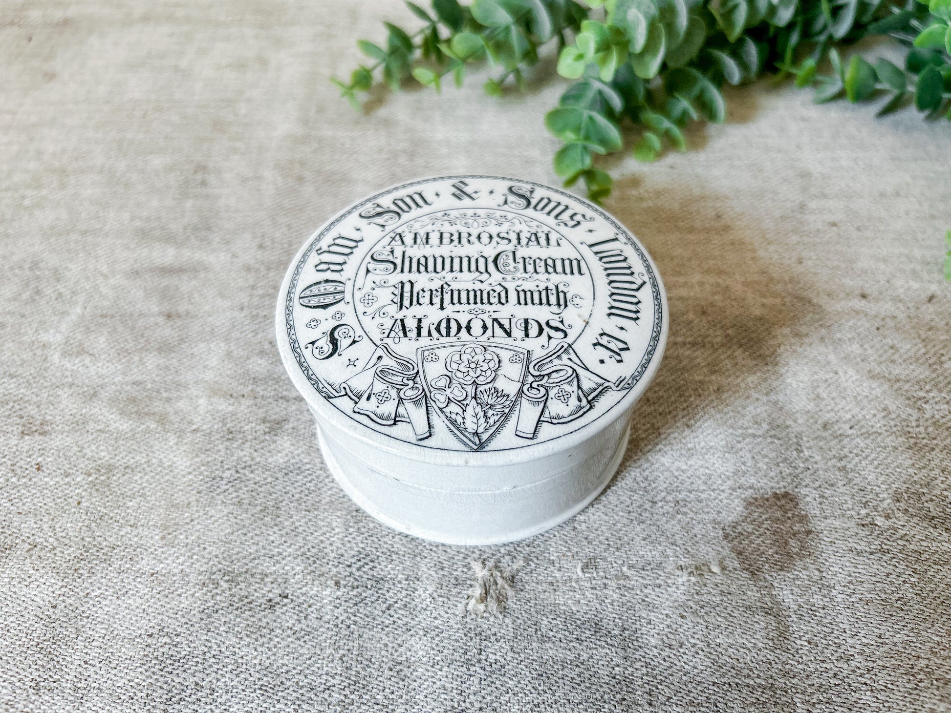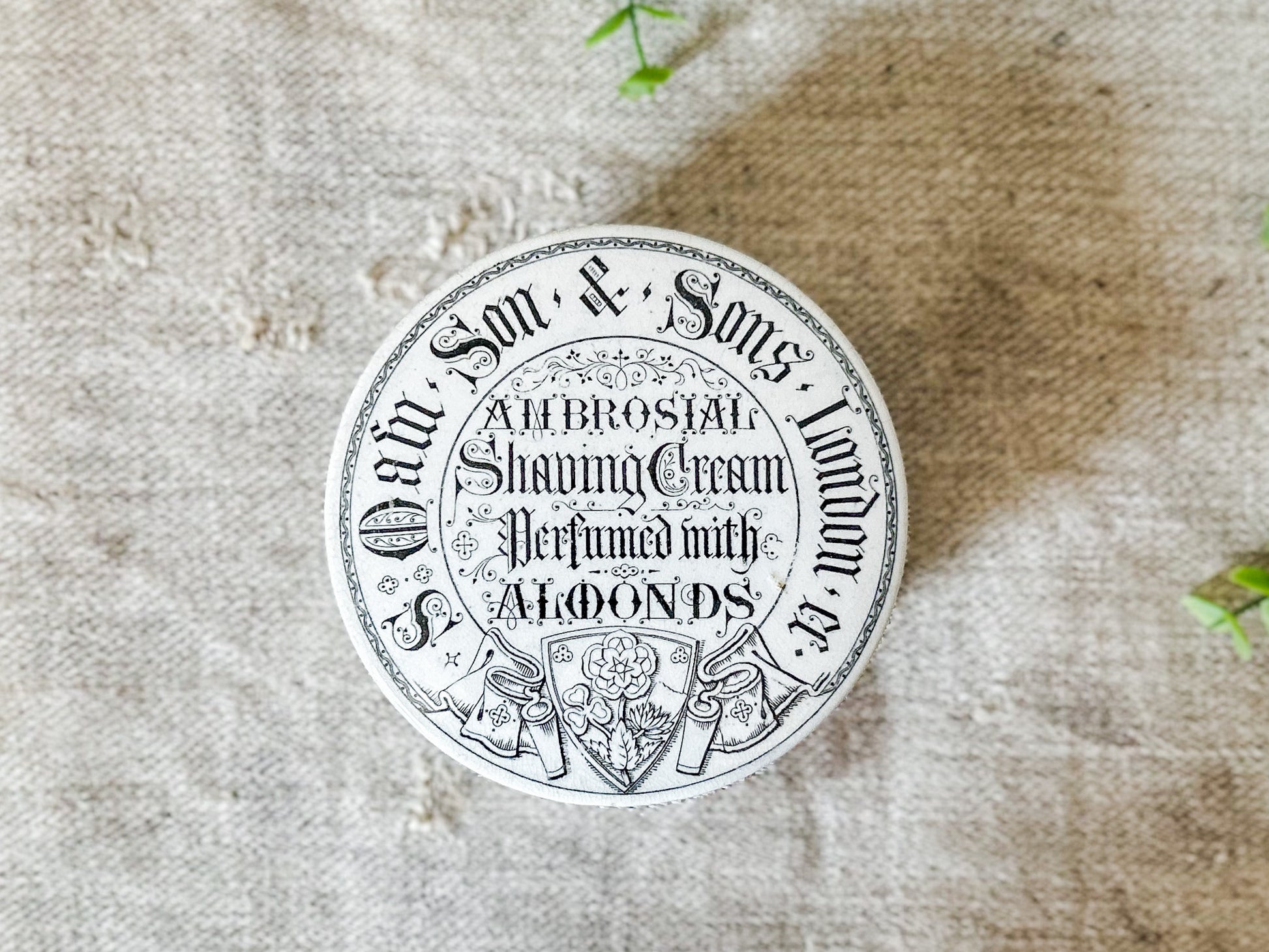 The lid has strong black graphics and lettering that reads "S. Maw Son & Sons London..Ambrosial Shaving Cream Perfumed with Almonds." Detailed coat of arms below.