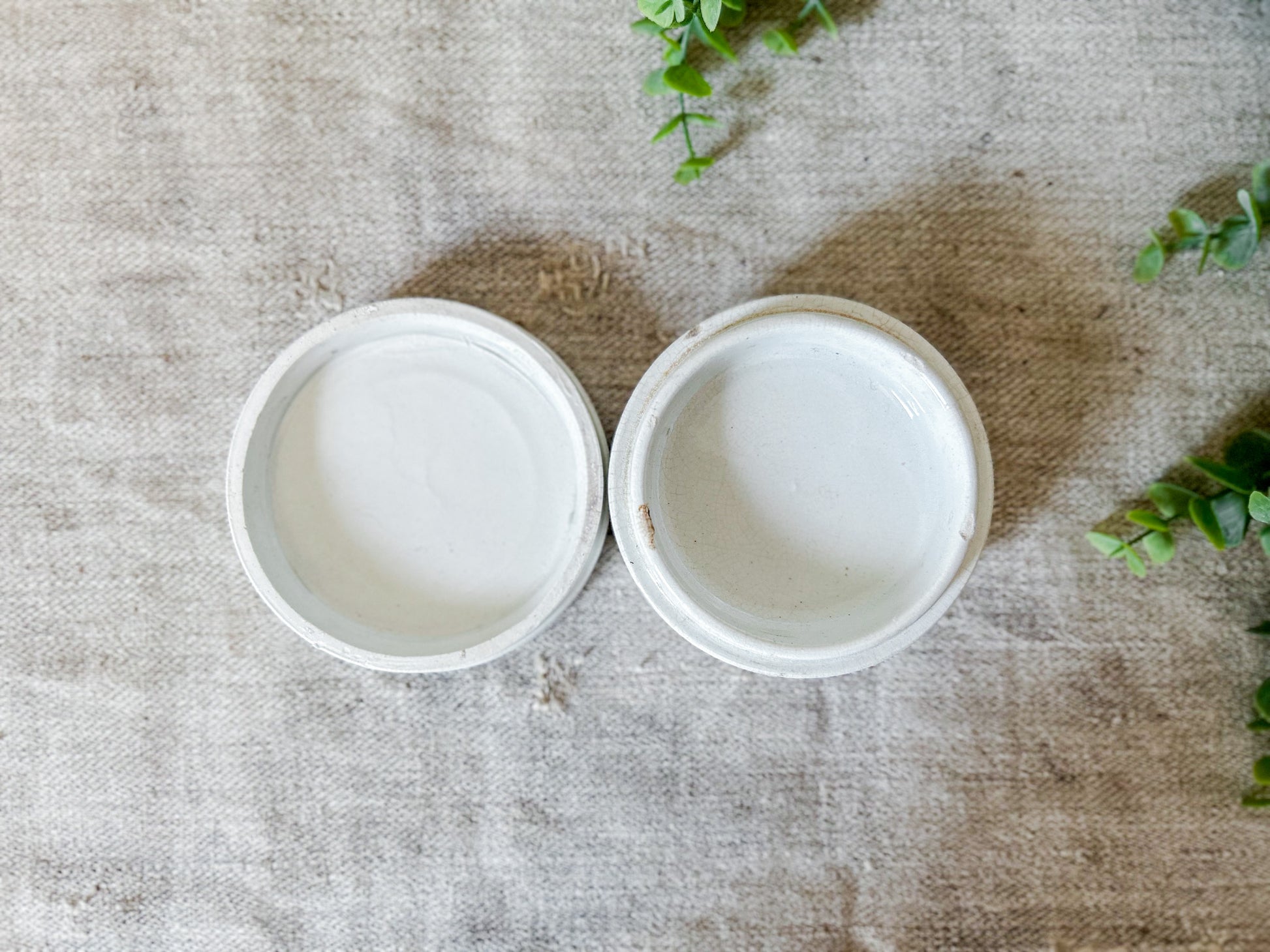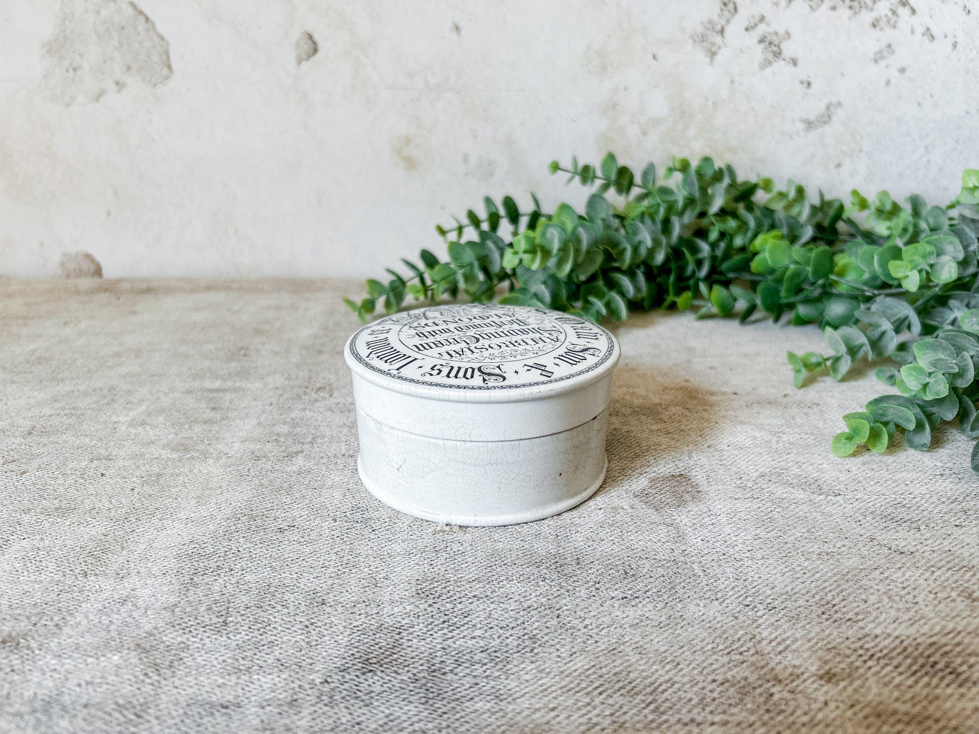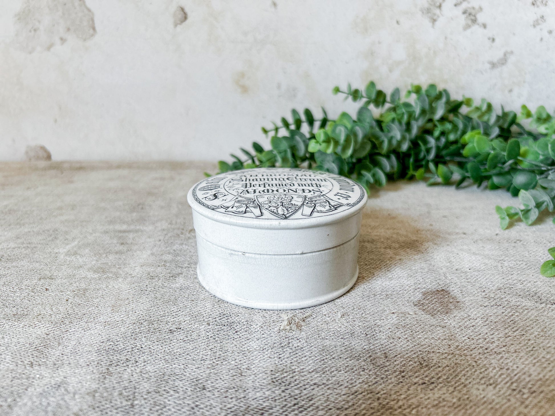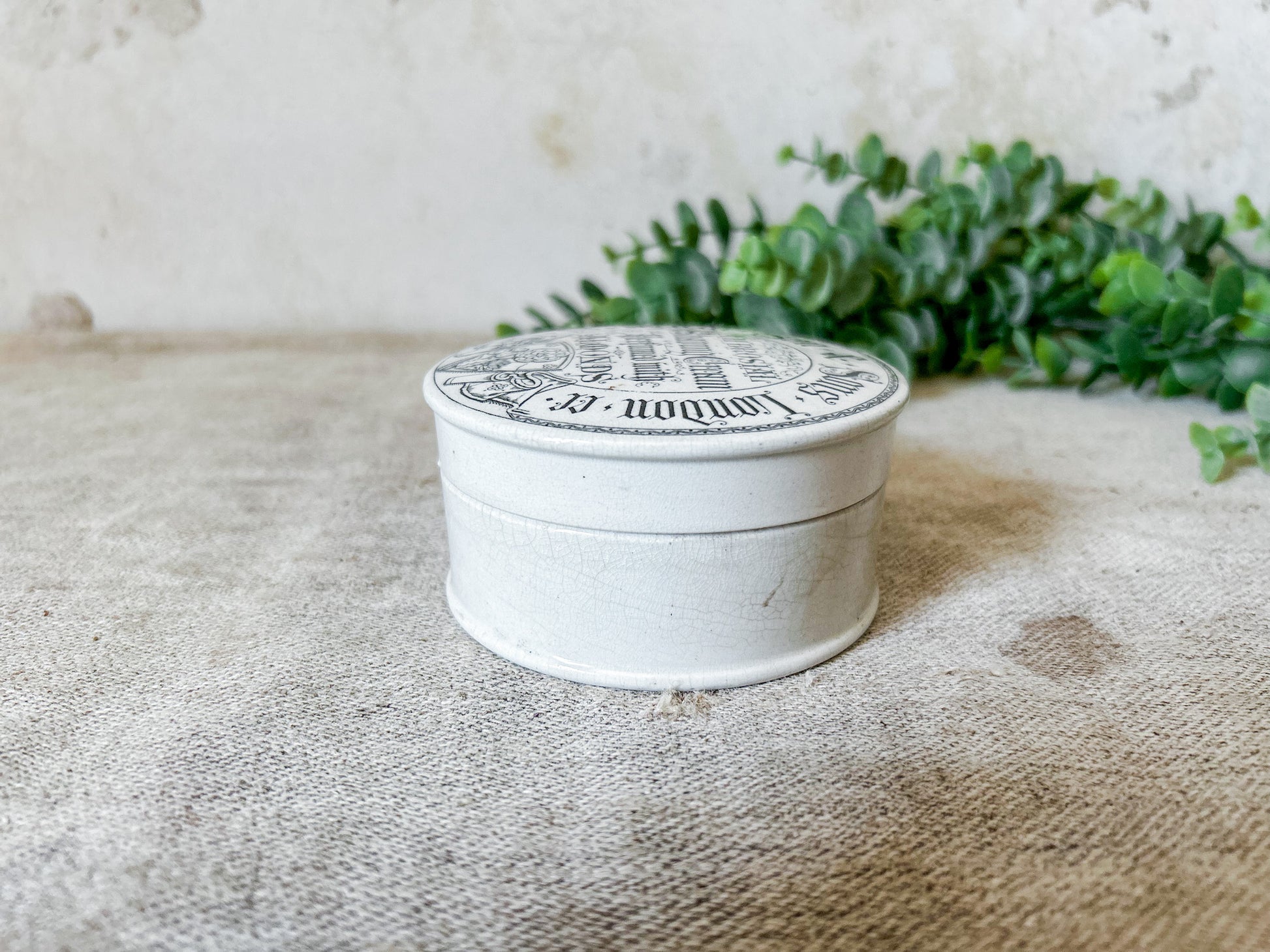 Available is an antique shaving cream pot and lid with ornate Gothic script and beautiful design. This English jar is one of the more rare designs and in very good antique condition.
