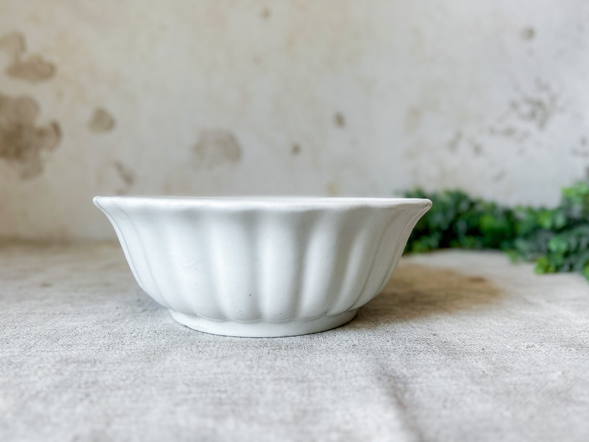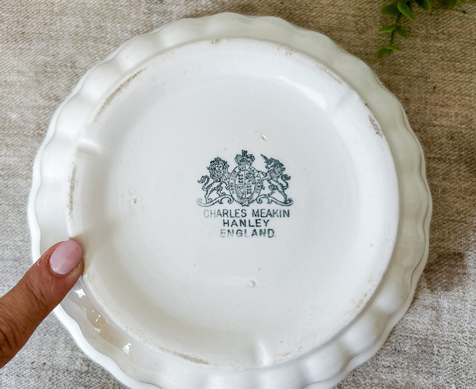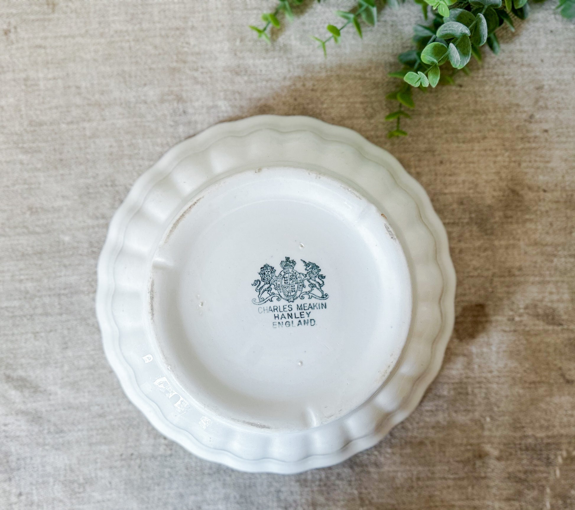 Available is a beautiful ironstone ladyfinger bowl, with fluted sides and flared rim. The base has a printed stamp with royal coat of arms and reads "Charles Meakin, Hanley, England." Overall great clean condition, with little discoloration and no crazing.