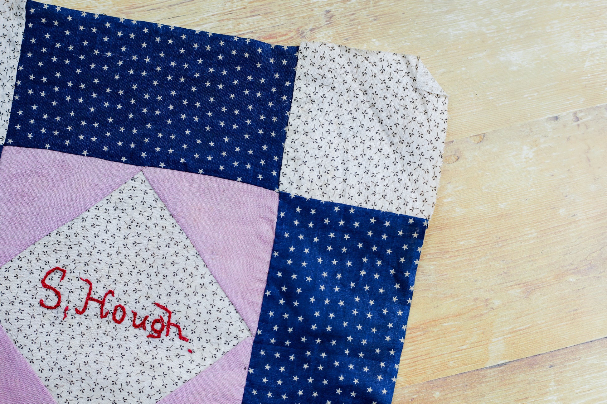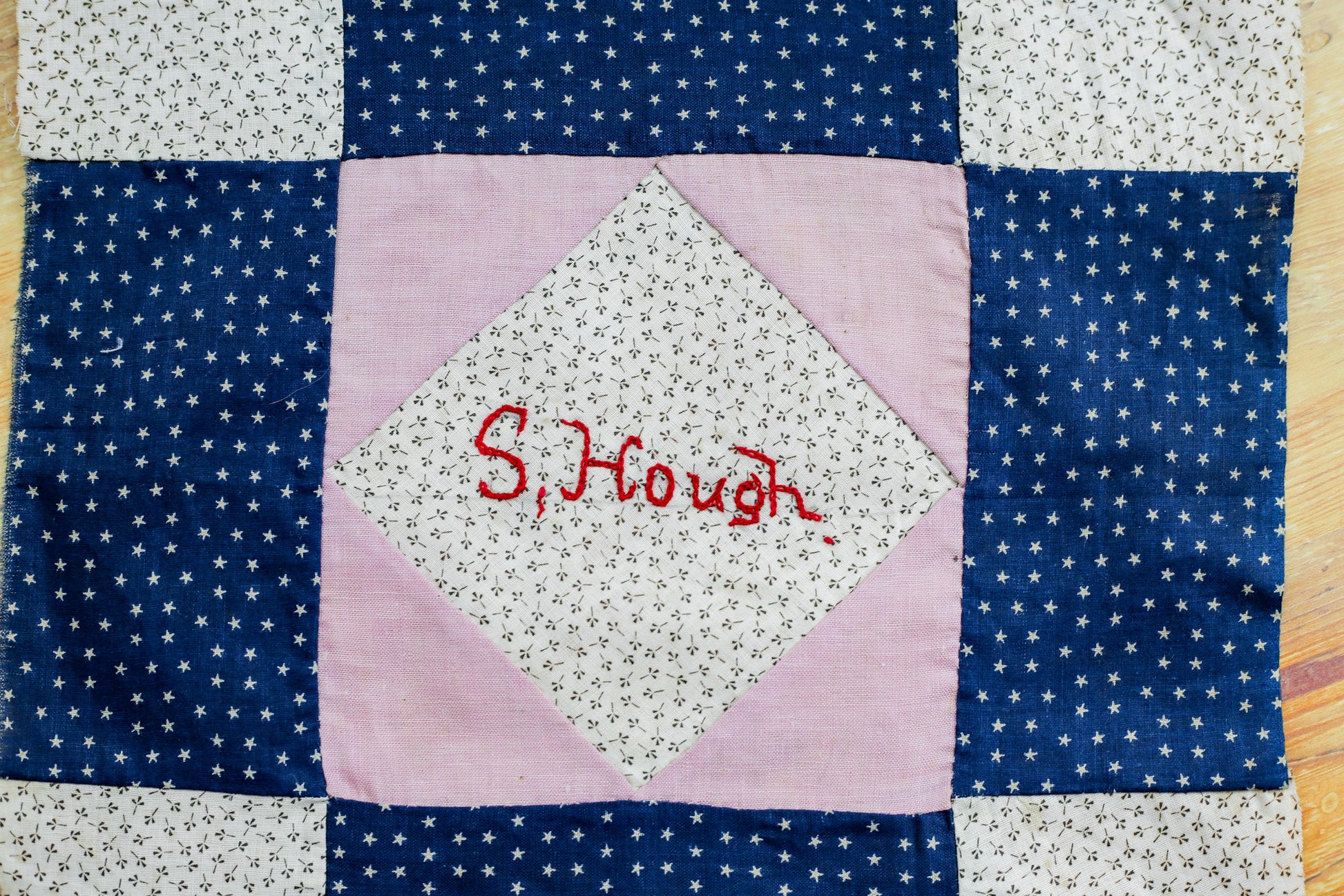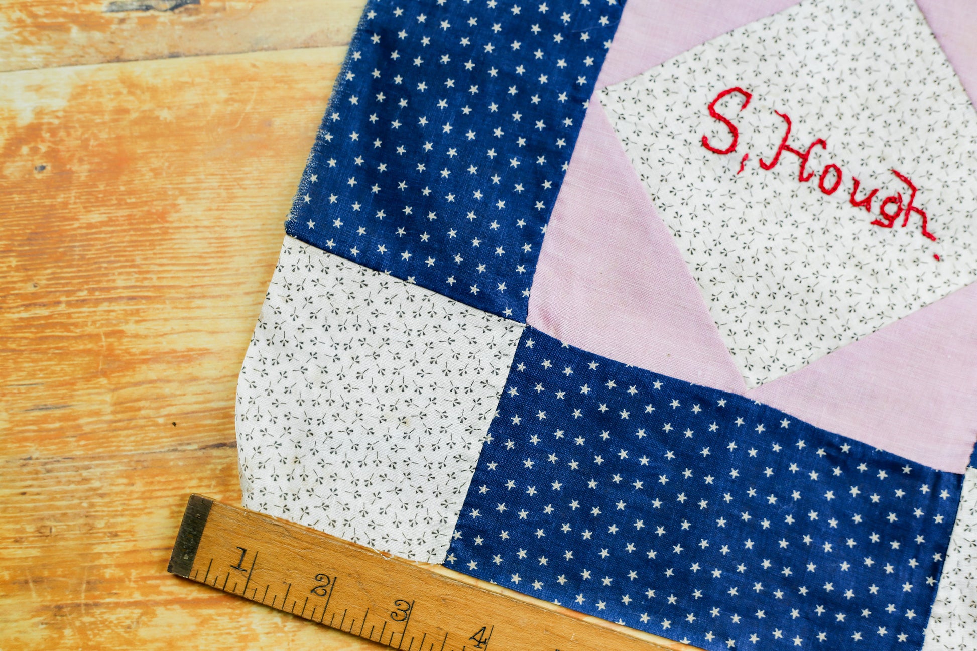 Antique Blue and Pink “S. Hough” Signed Quilt Block, c1910