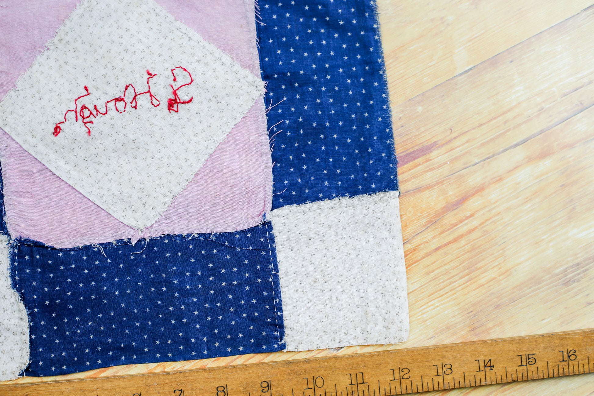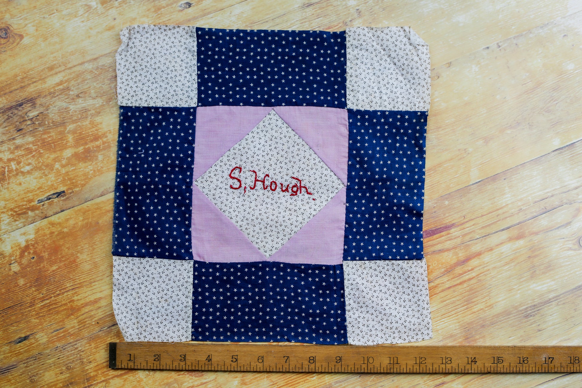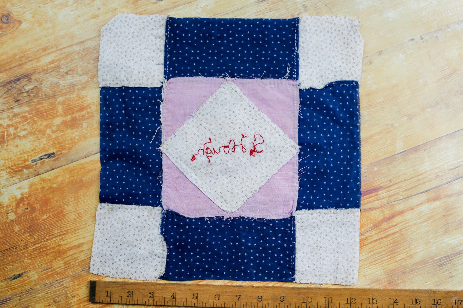 Antique Blue and Pink “S. Hough” Signed Quilt Block, c1910