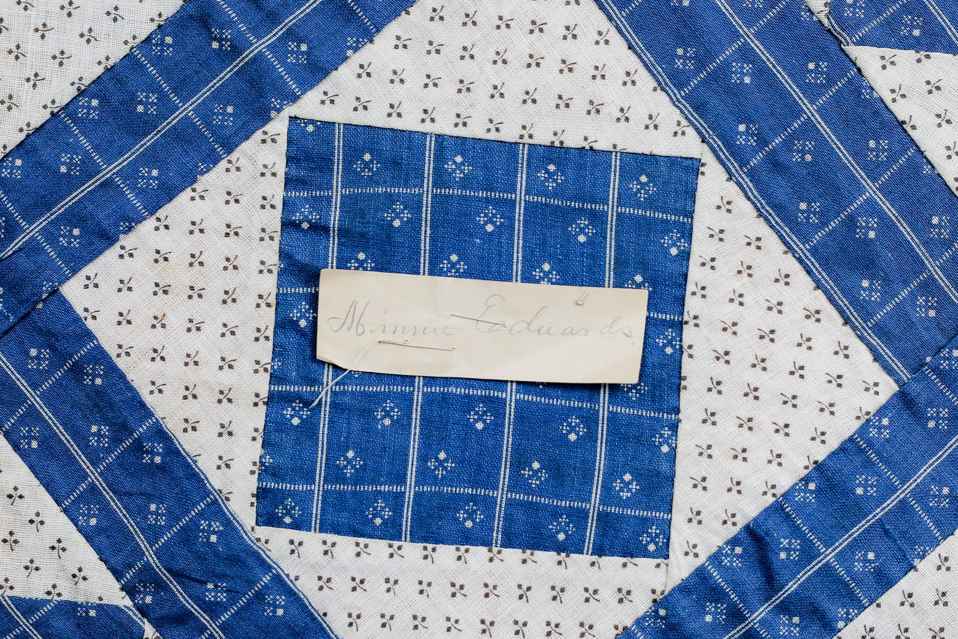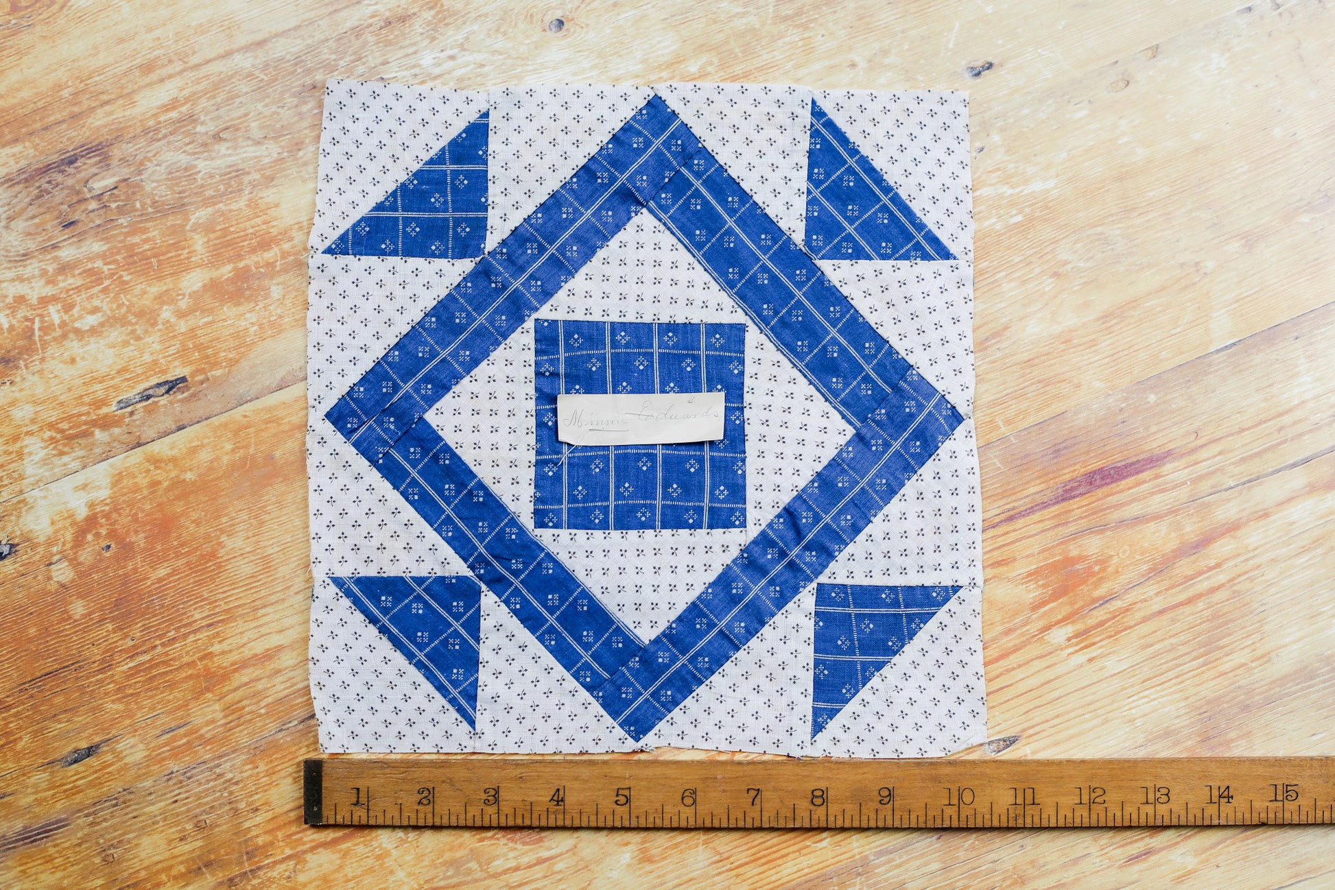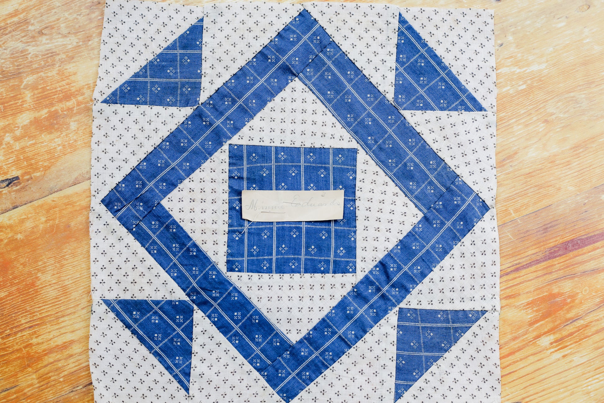 Antique Blue and White “Minnie Edwards” Signed Double Square Quilt Block, c1910