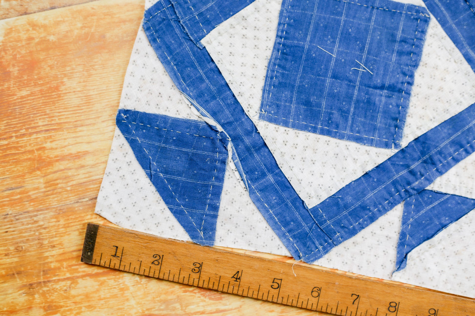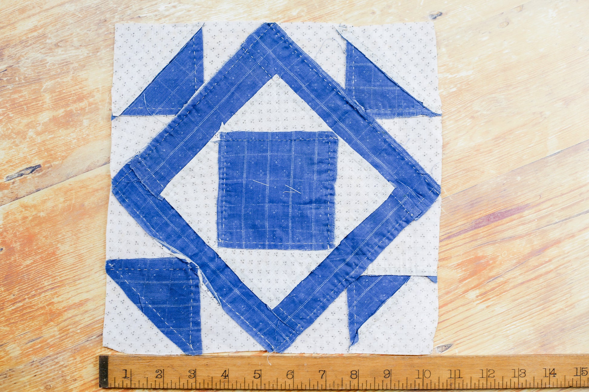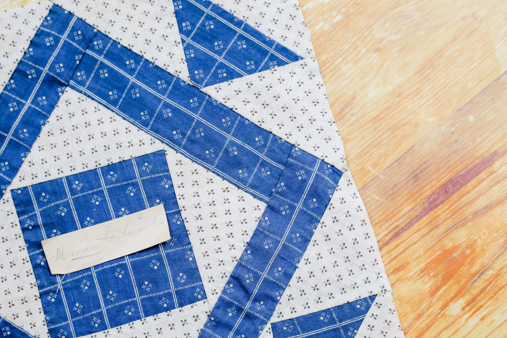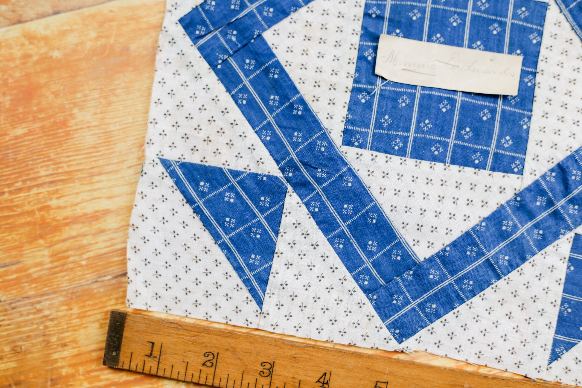 Antique Blue and White “Minnie Edwards” Signed Double Square Quilt Block, c1910
