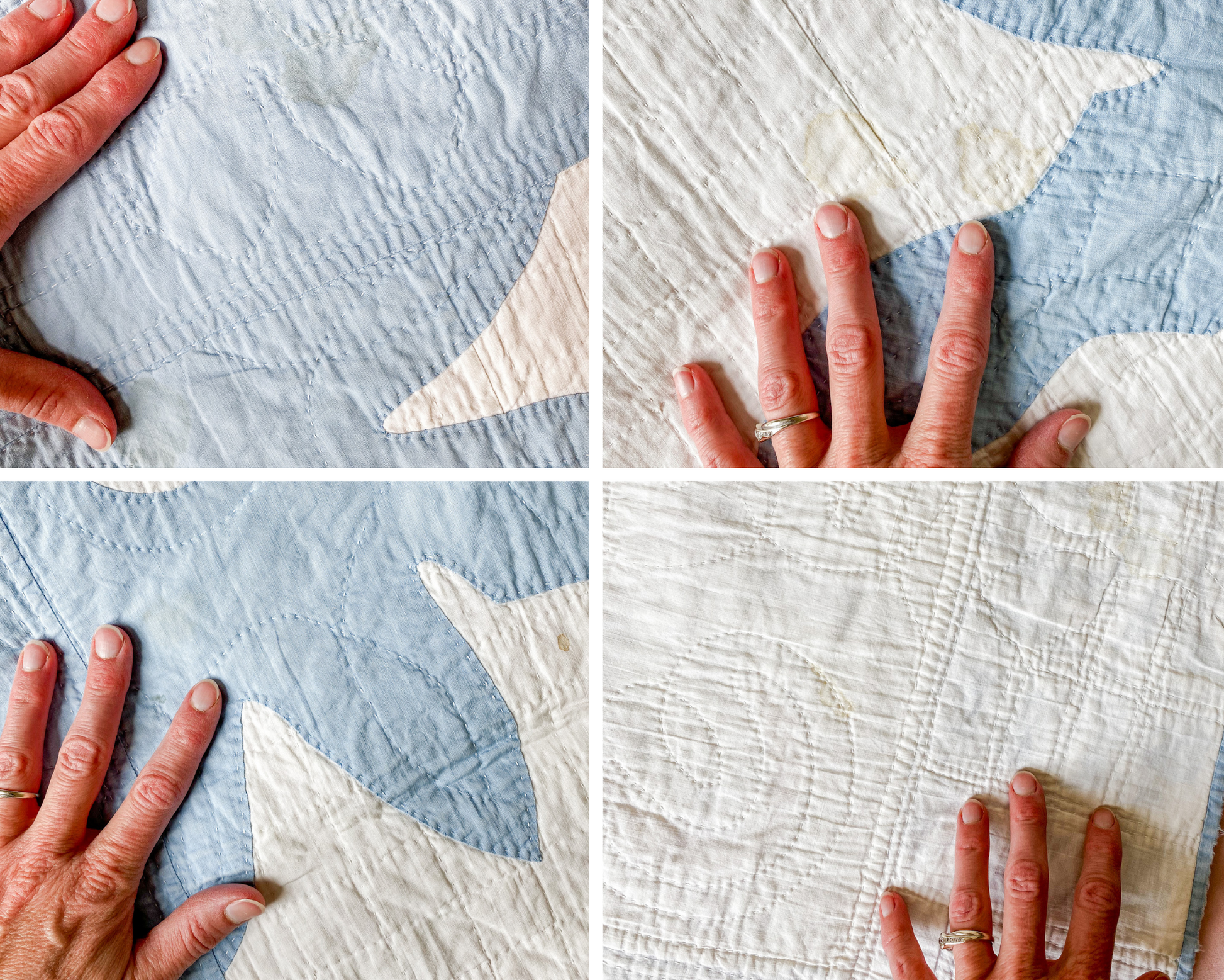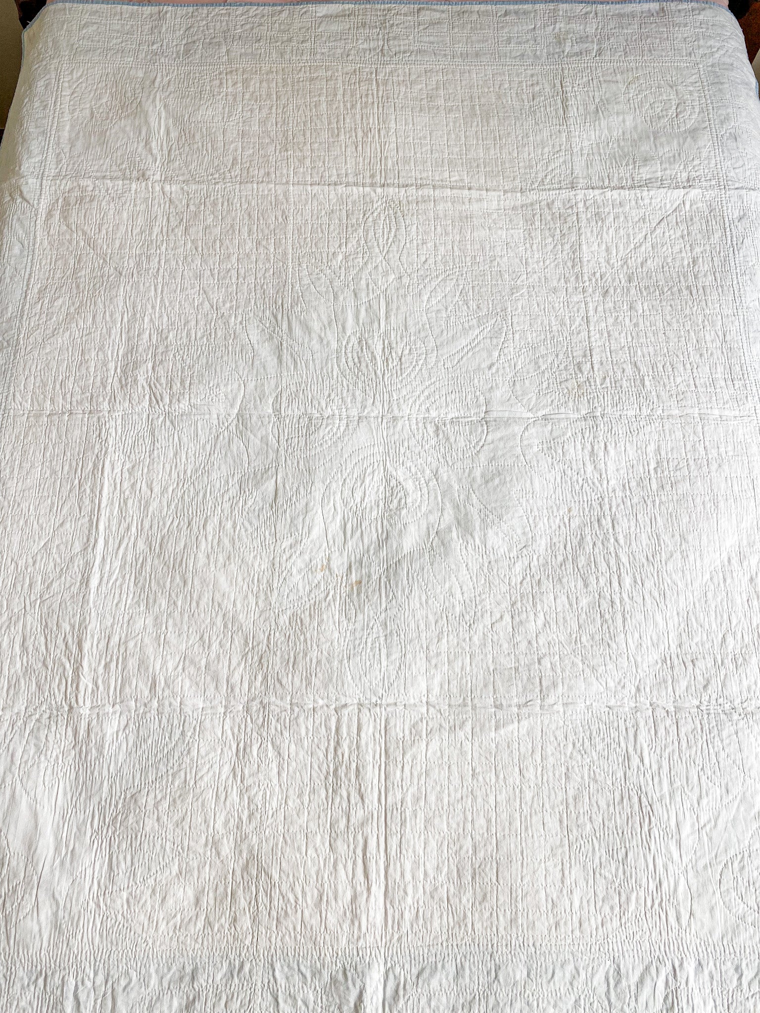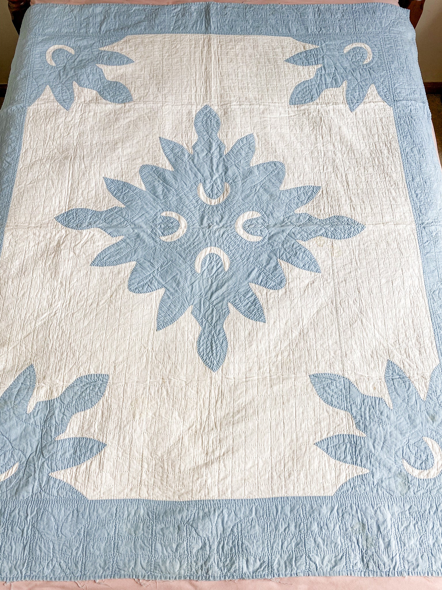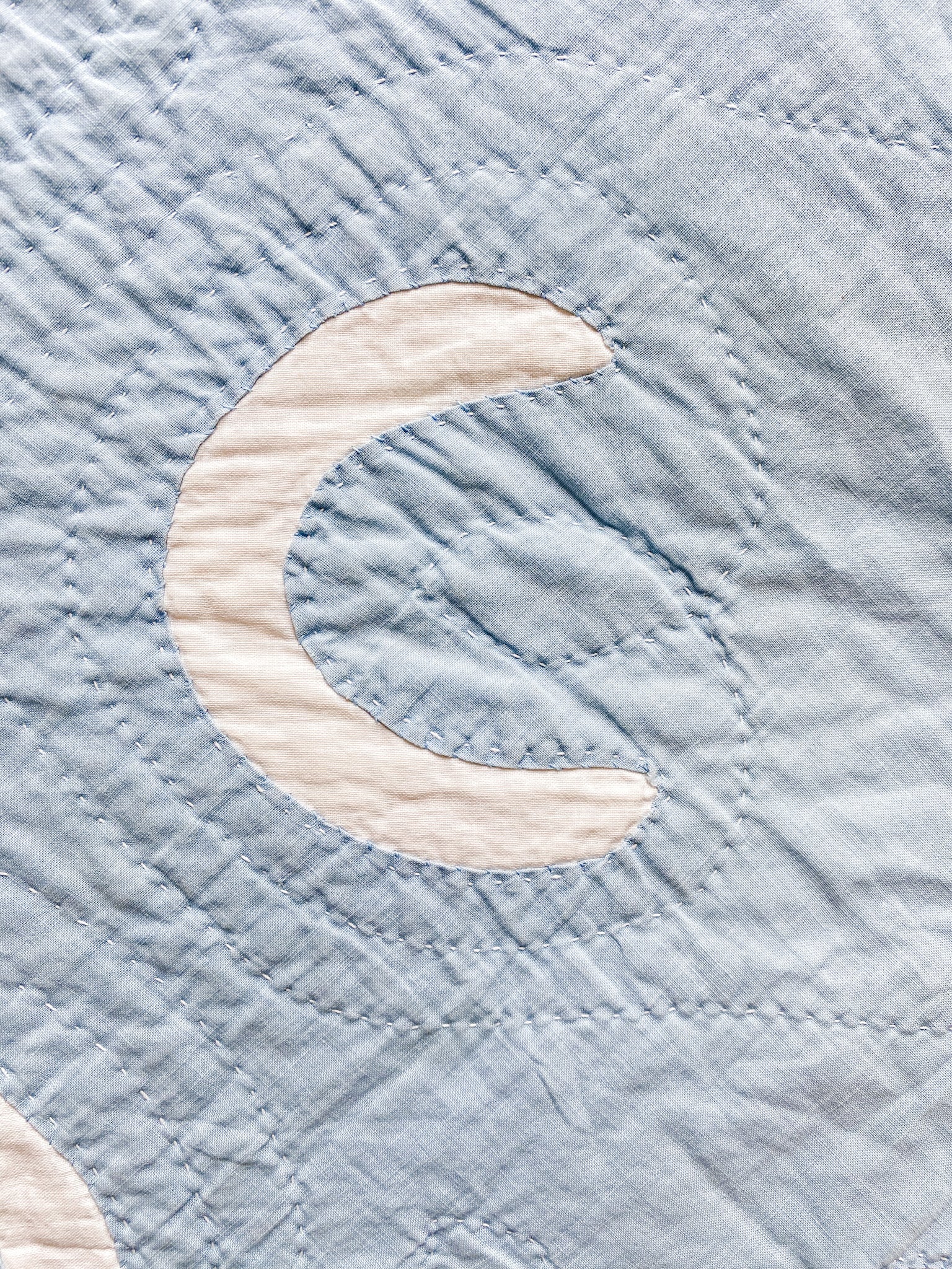 Quilt is made with solid white and blue fabrics. The appliqued blue pieces appear to be papercut, where patterns were made similar to paper snowflakes - cut on folded paper for a mirrored template. The crescent shapes are cut out of the blue fabric to show the white underneath. White backing, lightweight cotton batting.
