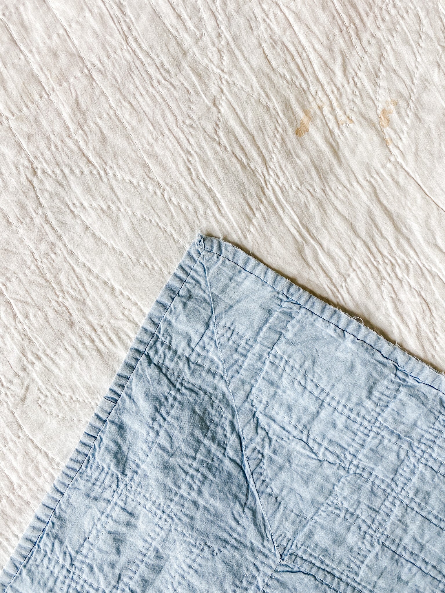 Good vintage condition. Wear along binding. Some batting shift noted. Light stains that remain after washing. It has been hand washed and air dried. See photos.