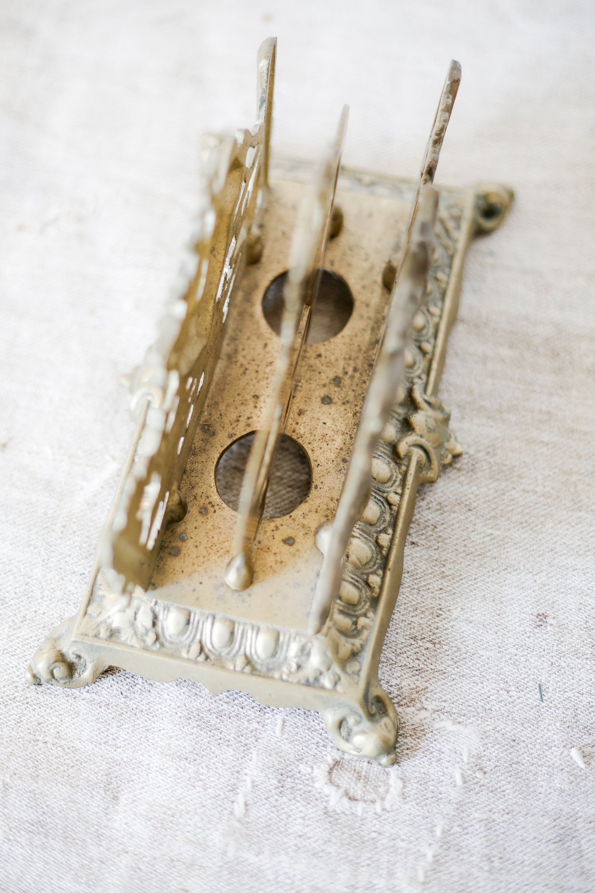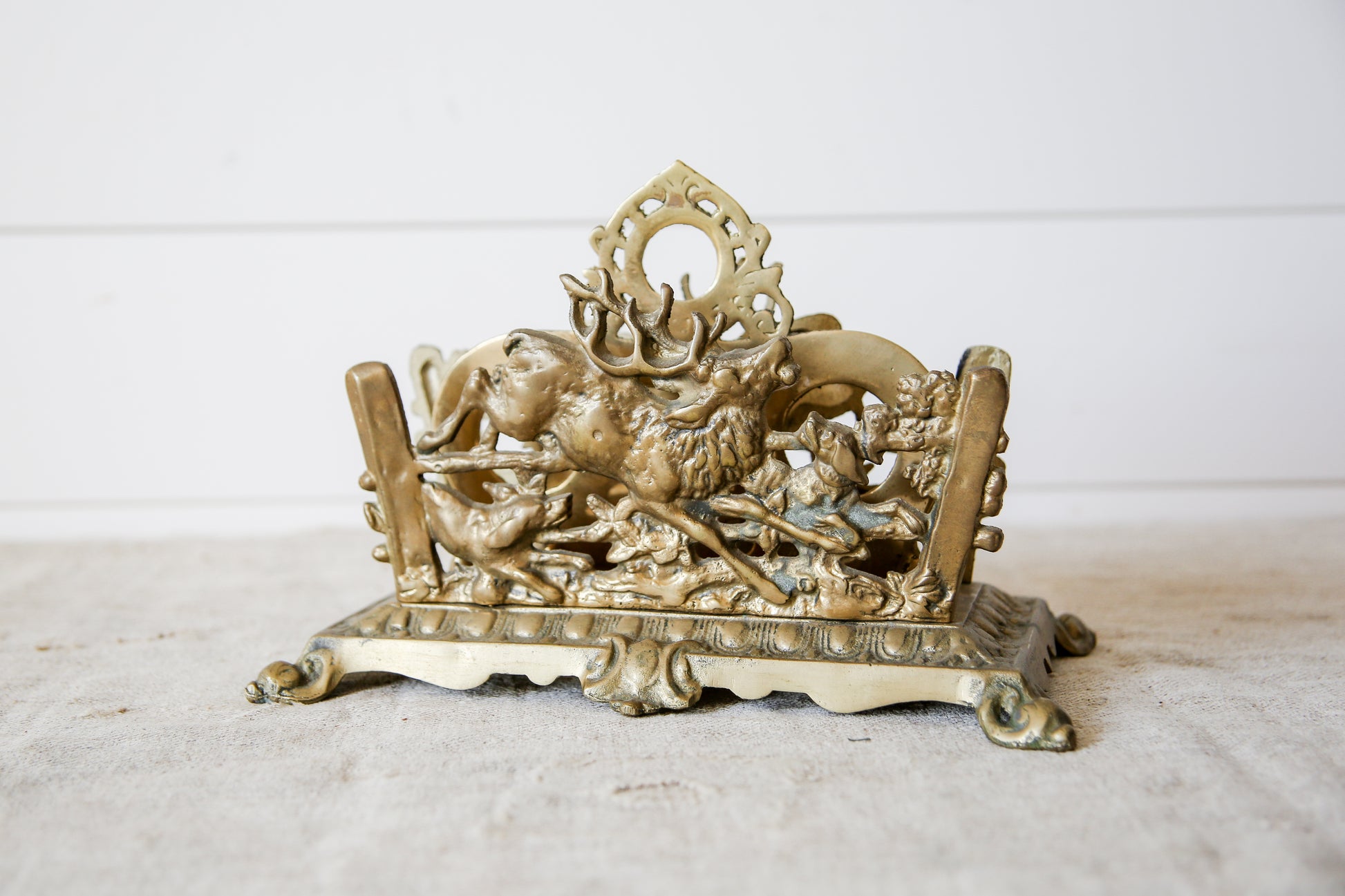 Available is a brass-plated cast iron letter stand, showing hounds hunting a stag on front and.