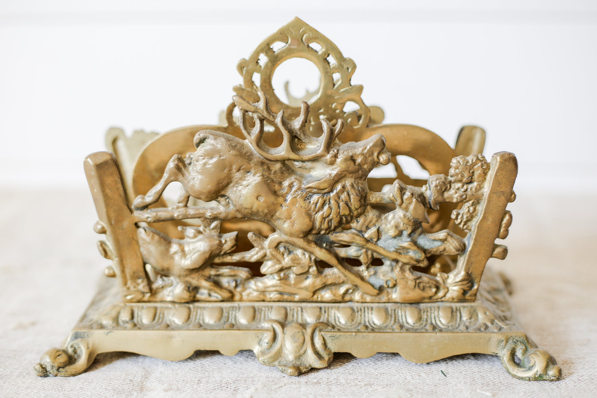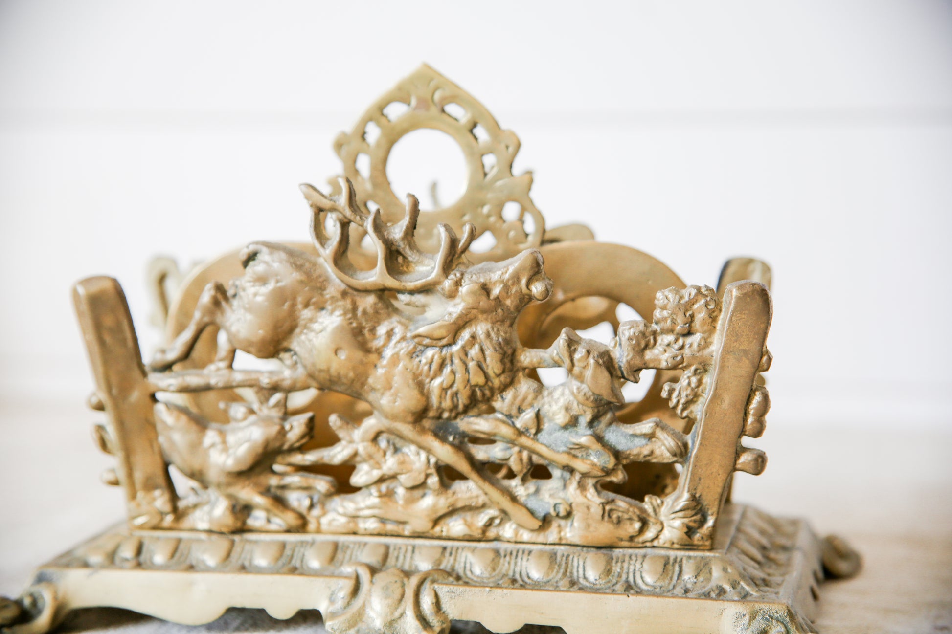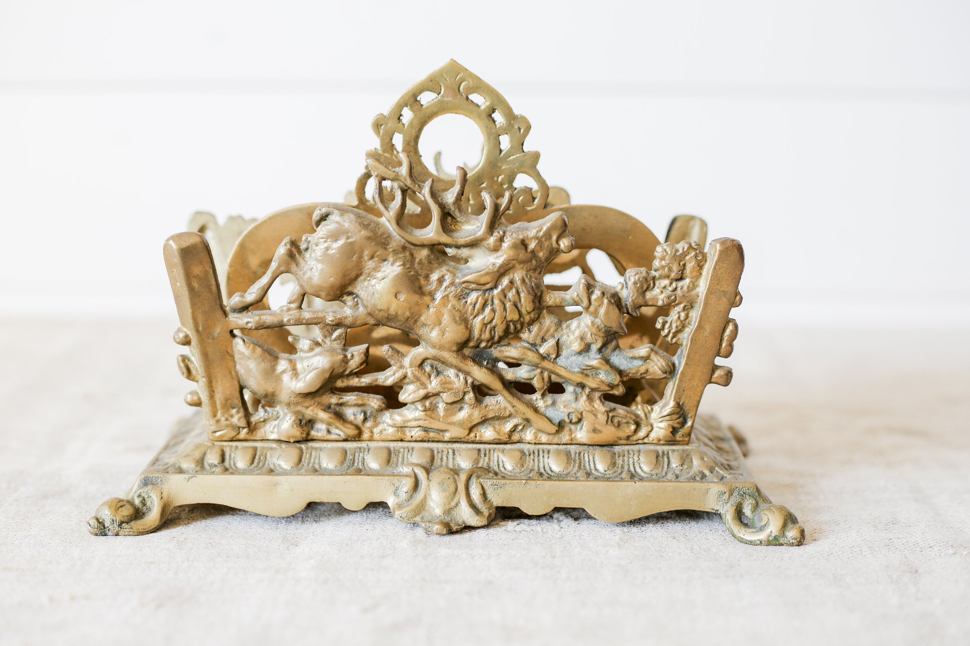Antique Brass Hounds Hunting Stag Letter Holder by Bradley & Hubbard, c1885