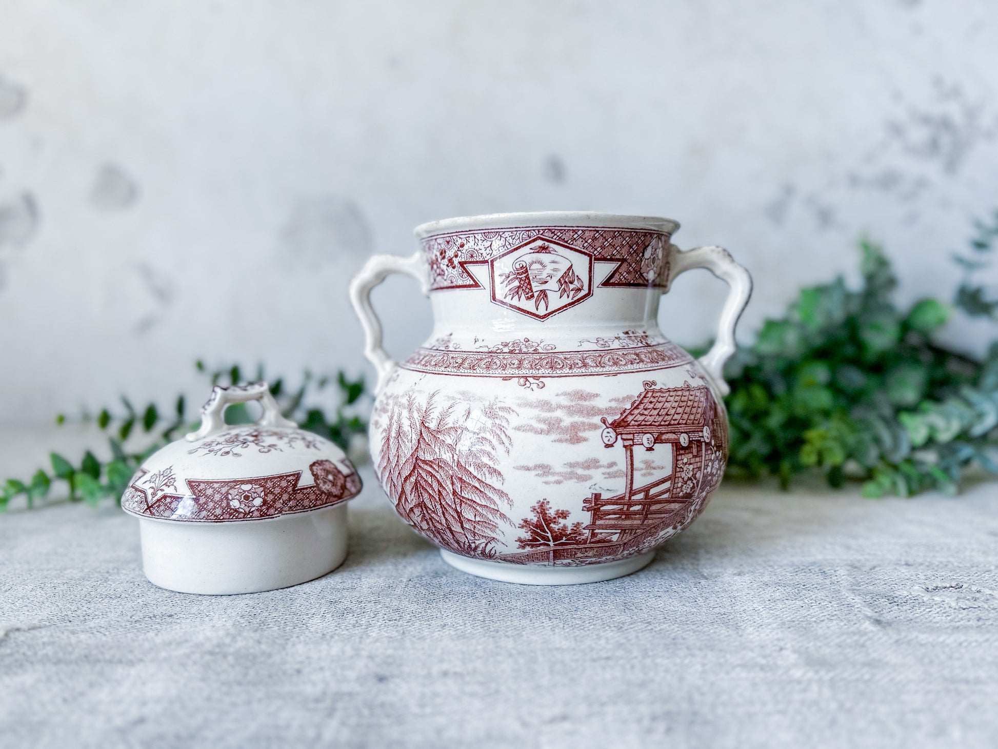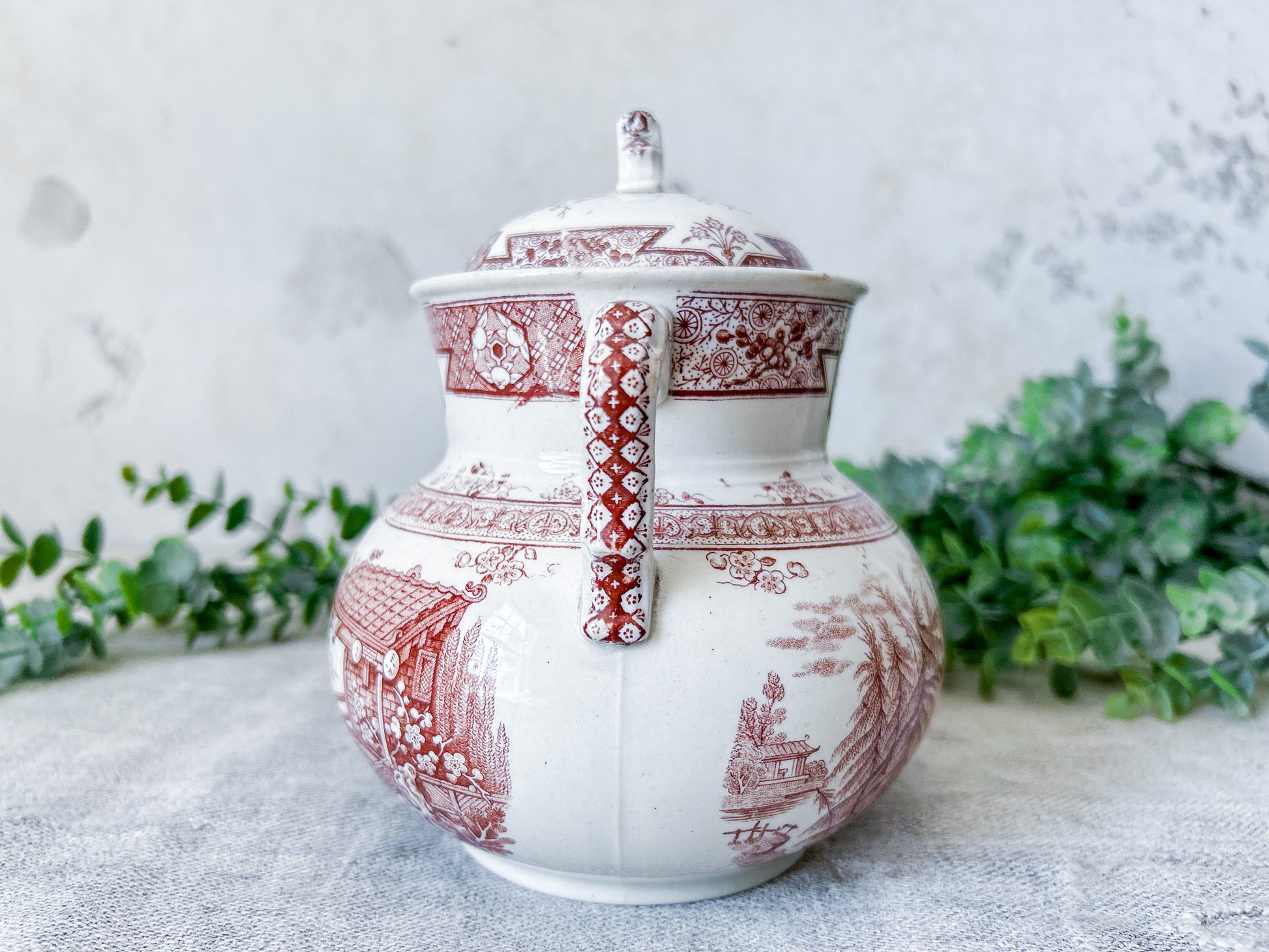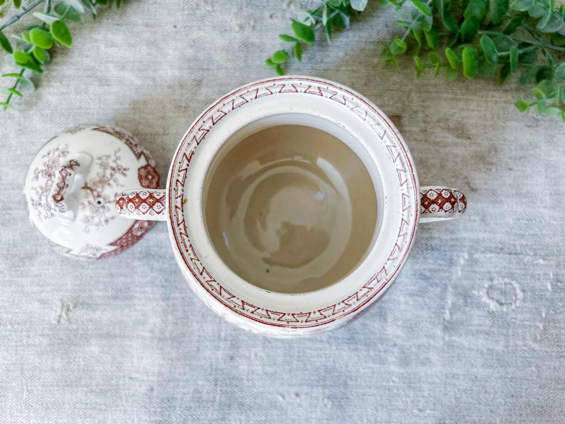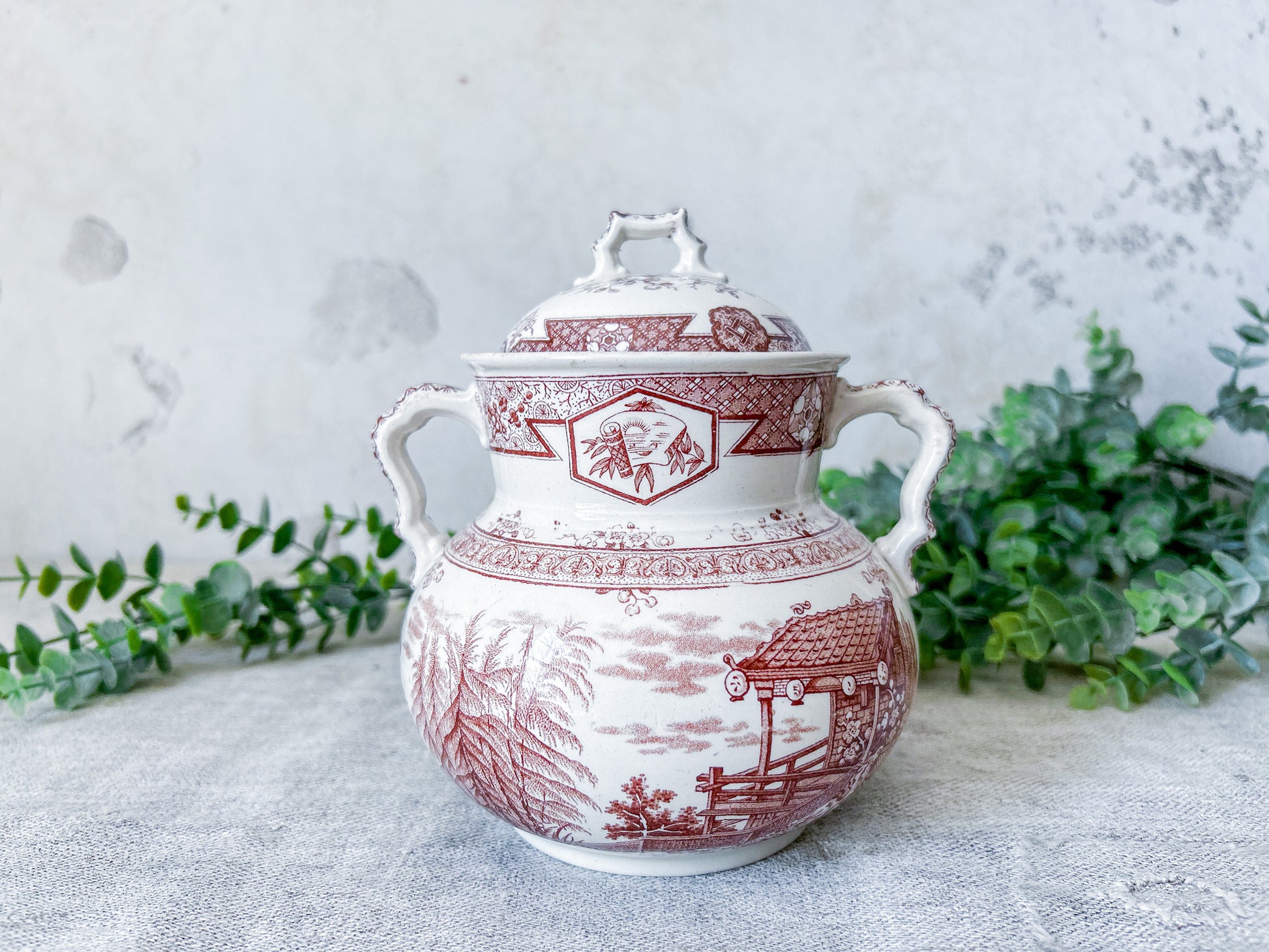 Available is an attractive ironstone sugar bowl with a detailed transferware pattern in brown. The design leans heavily on Aesthetic Movement motifs, with nature scenes and cherry blossom details throughout. The Asiatic hut with bamboo featured are also a nod to chinoiserie.