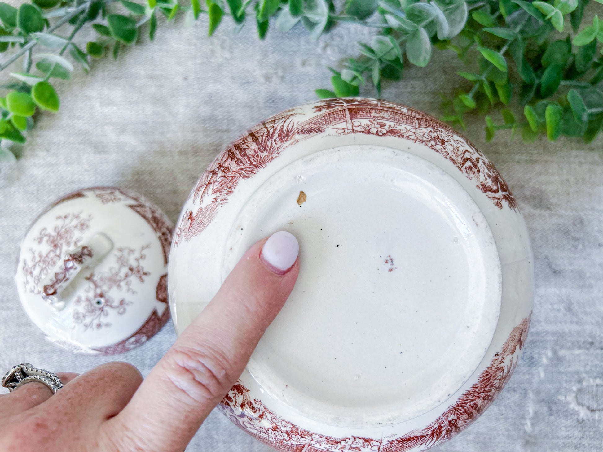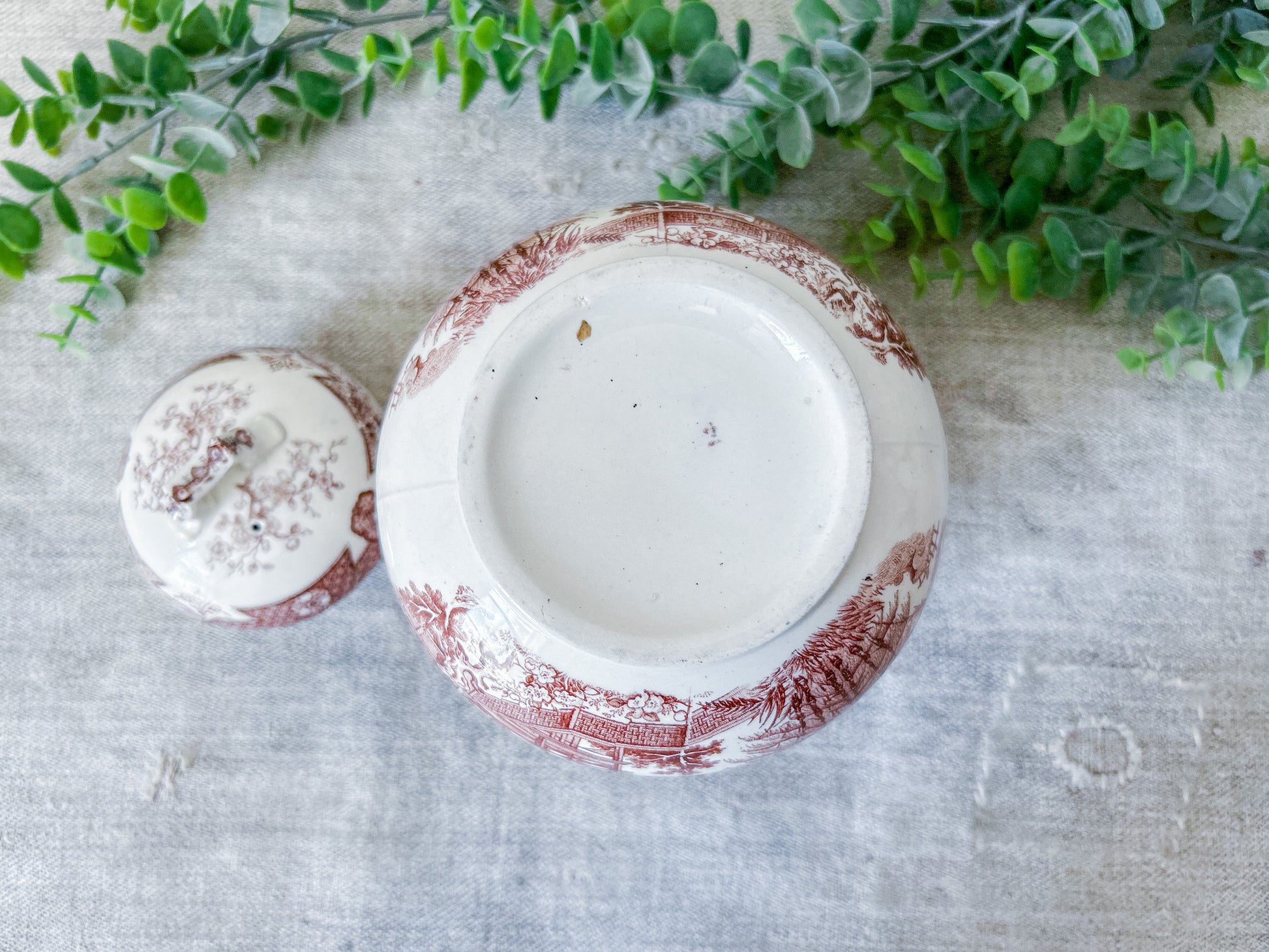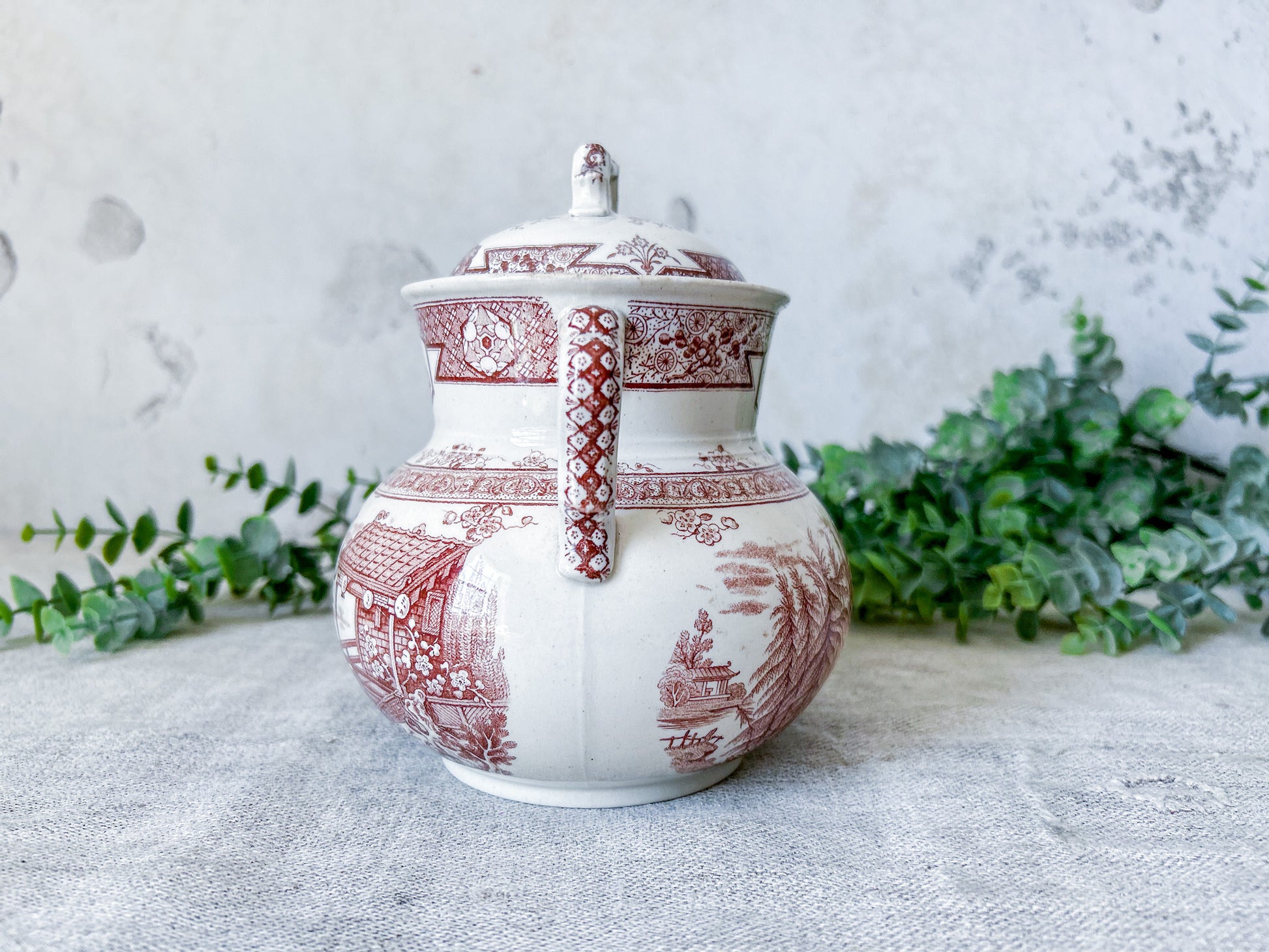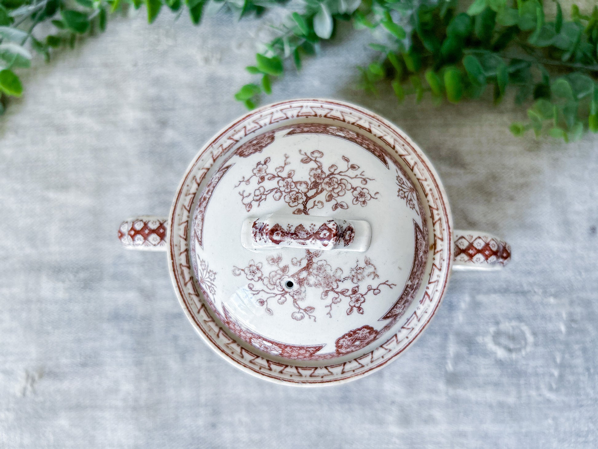 Available is an attractive ironstone sugar bowl with a detailed transferware pattern in brown. The design leans heavily on Aesthetic Movement motifs, with nature scenes and cherry blossom details throughout. The Asiatic hut with bamboo featured are also a nod to chinoiserie.