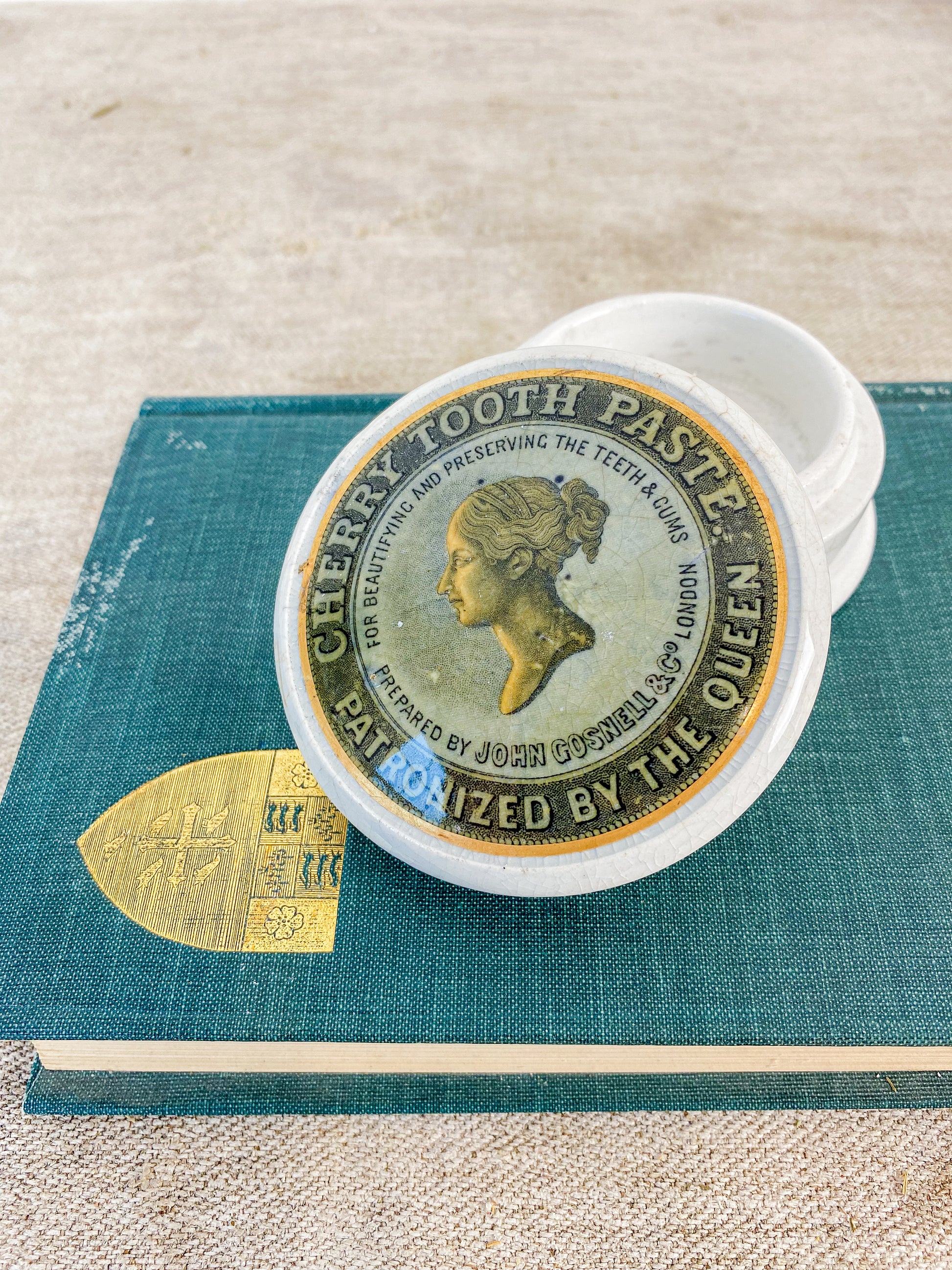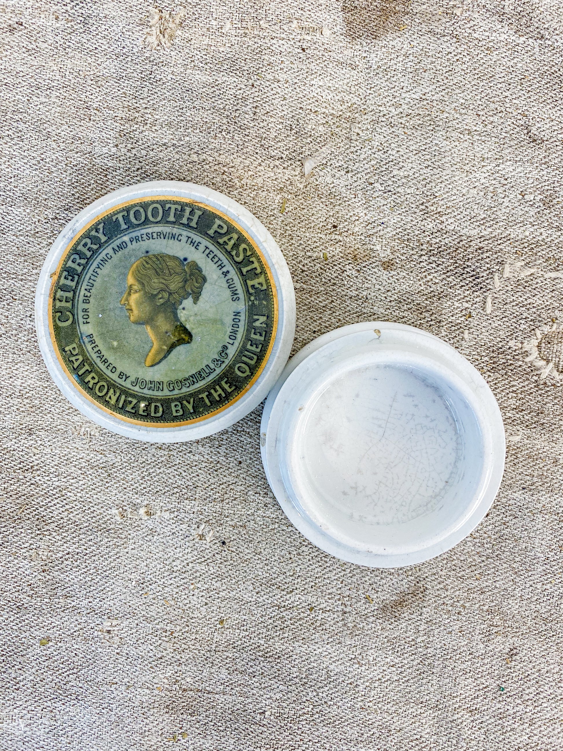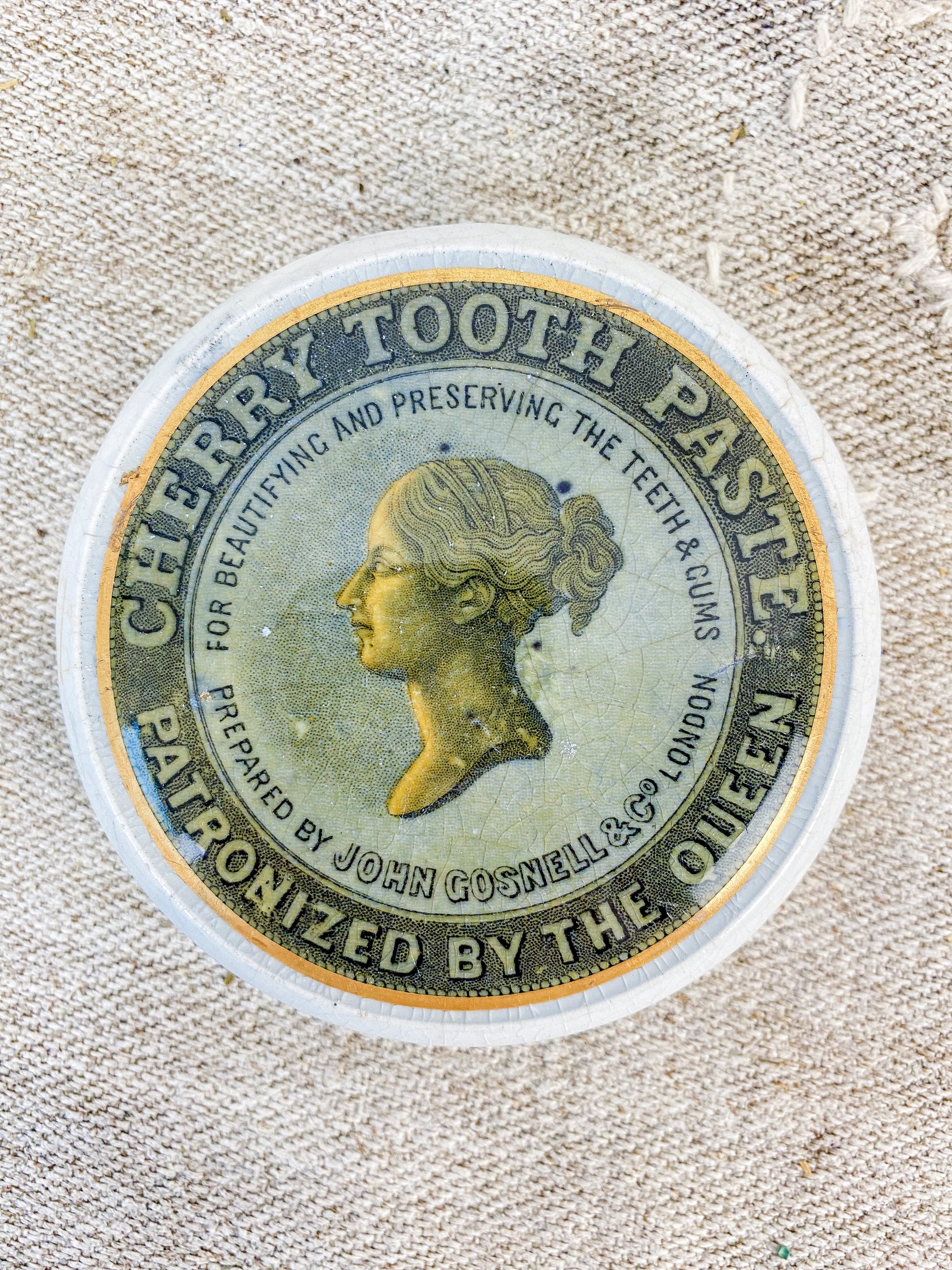 Available is an antique stoneware tooth paste pot. The lid has a beautiful green label showing a woman's head surrounded with the words "Cherry Toothpaste, Patronized by the Queen; Produced by John Gosnell Co. London."