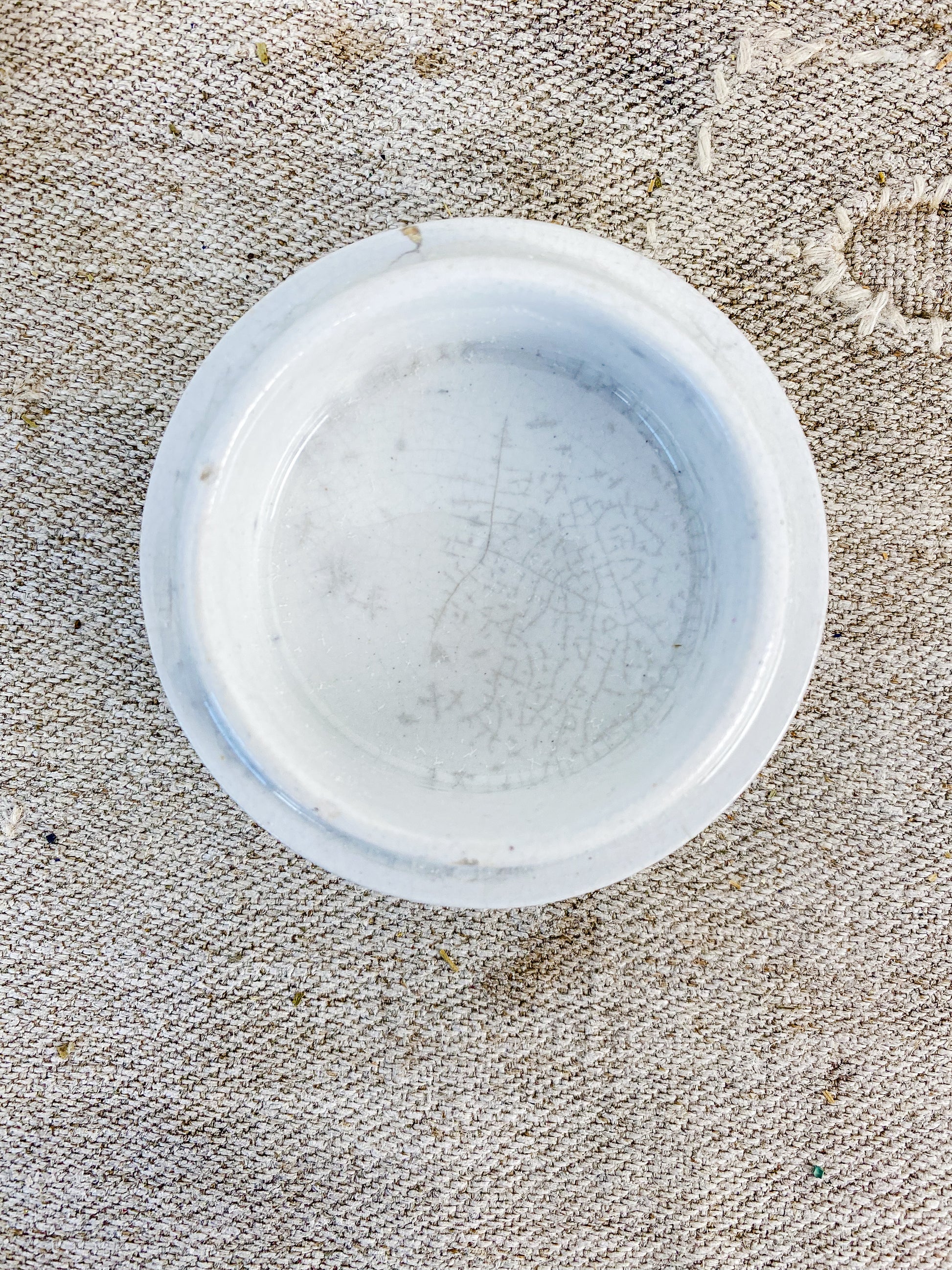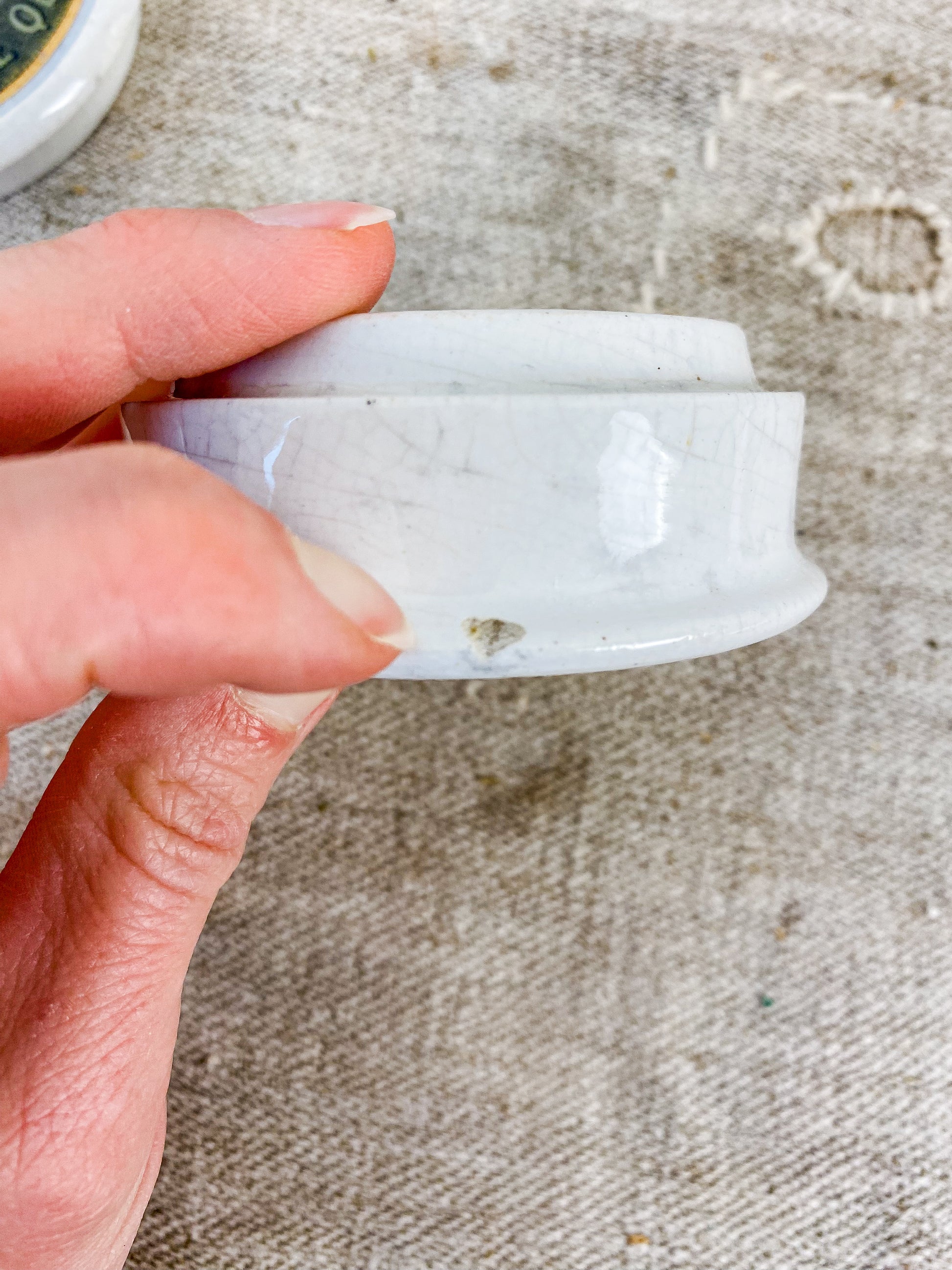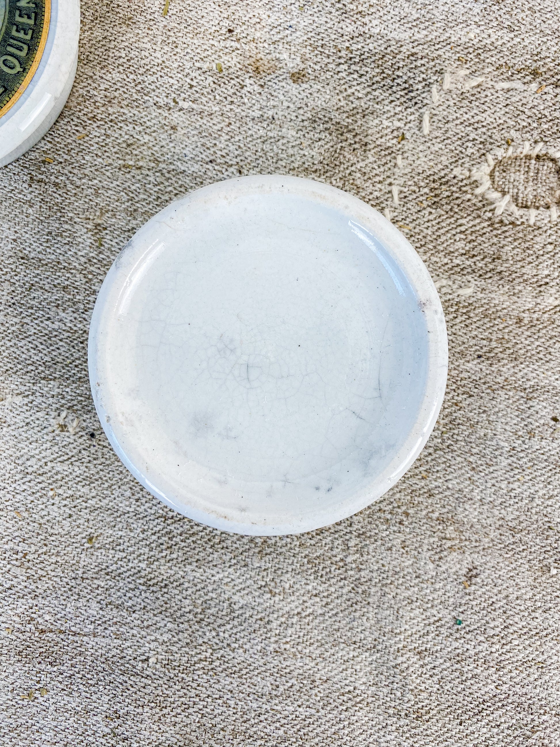 Available is an antique stoneware tooth paste pot. The lid has a beautiful green label showing a woman's head surrounded with the words "Cherry Toothpaste, Patronized by the Queen; Produced by John Gosnell Co. London."