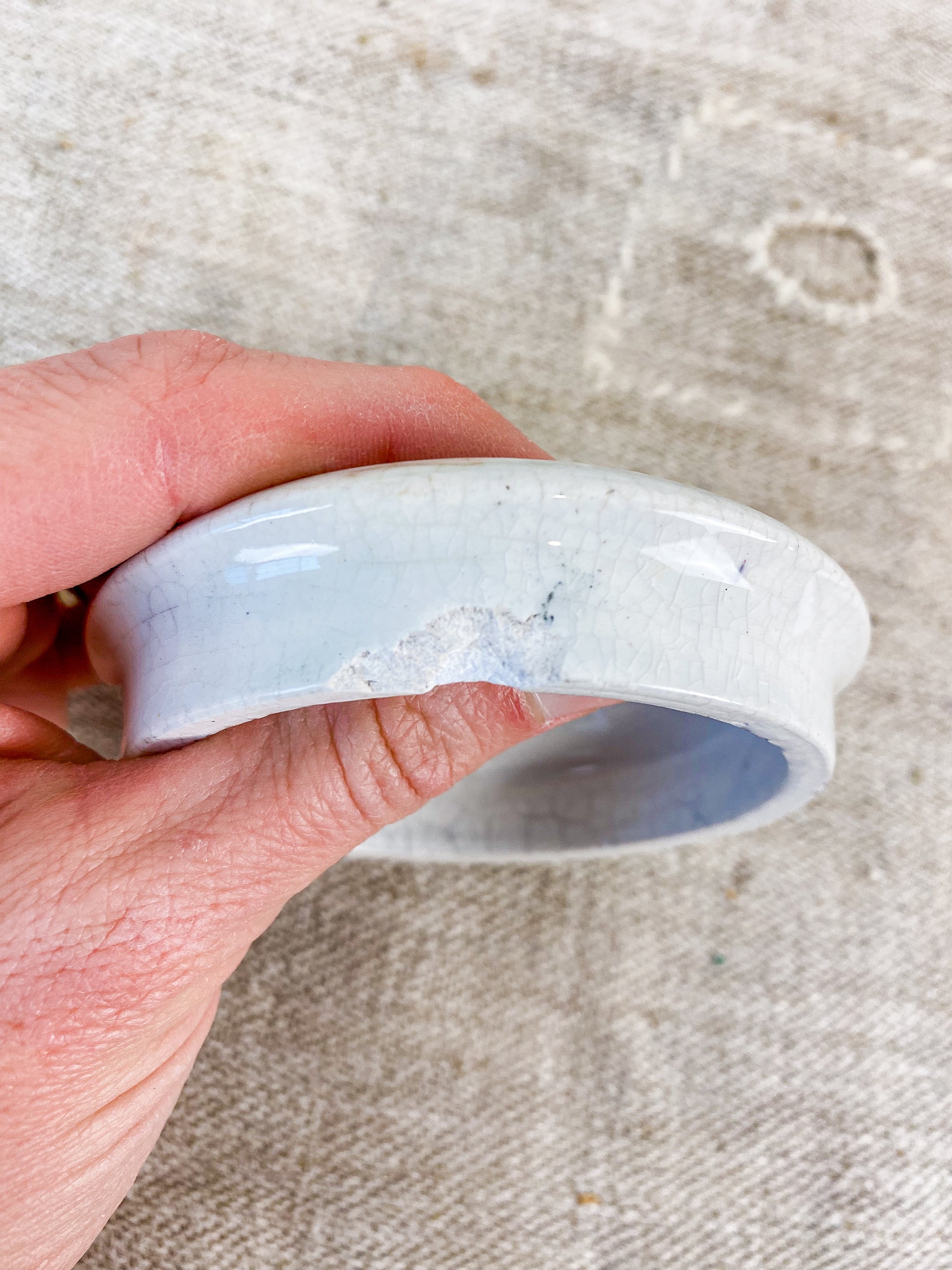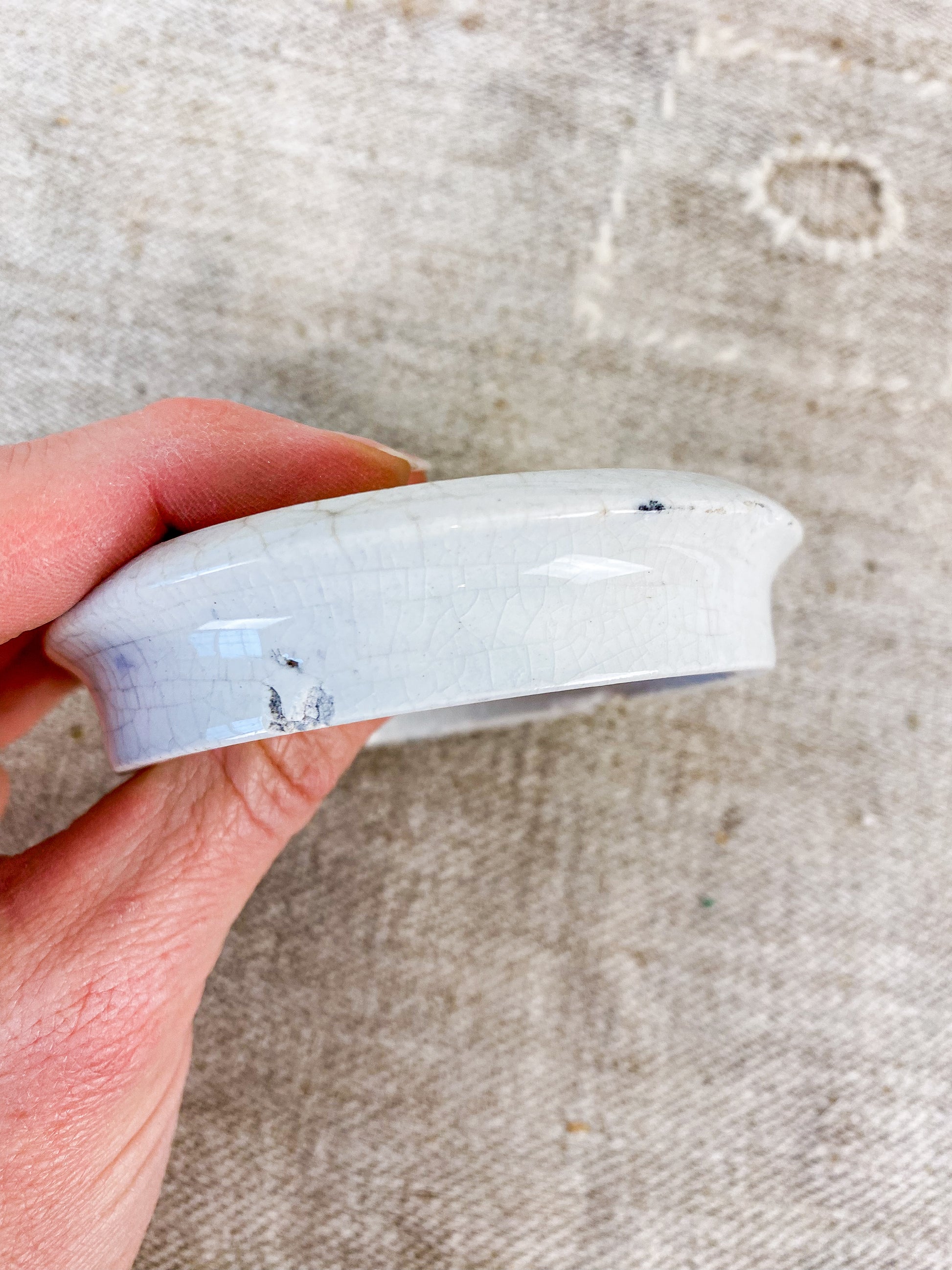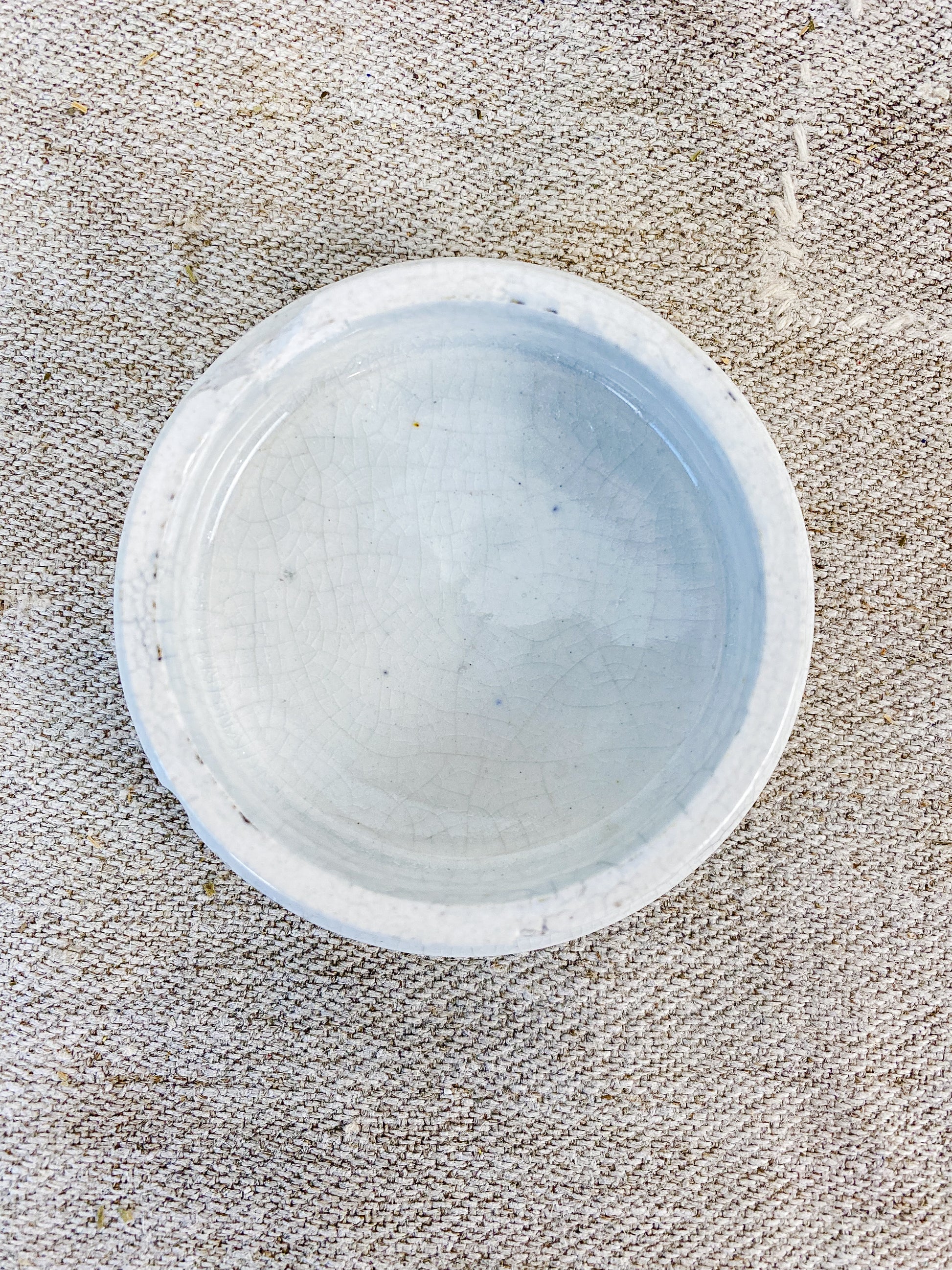 Overall good antique condition. Comes with lid and base. Lid has small chip on edge. Base has a small chip near foot rim. Overall crazing. Beautiful piece for display.