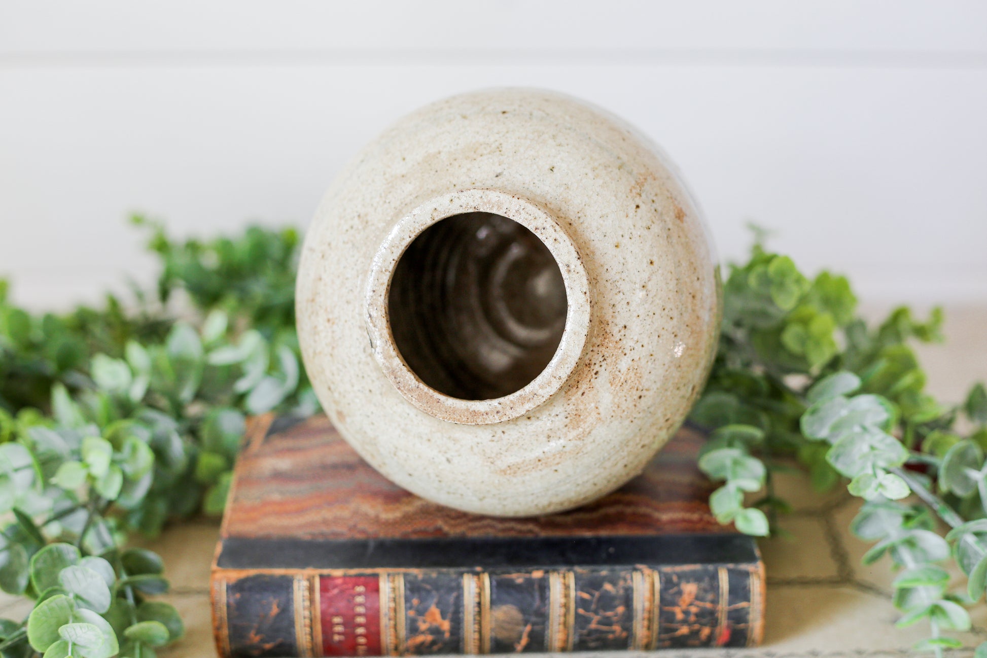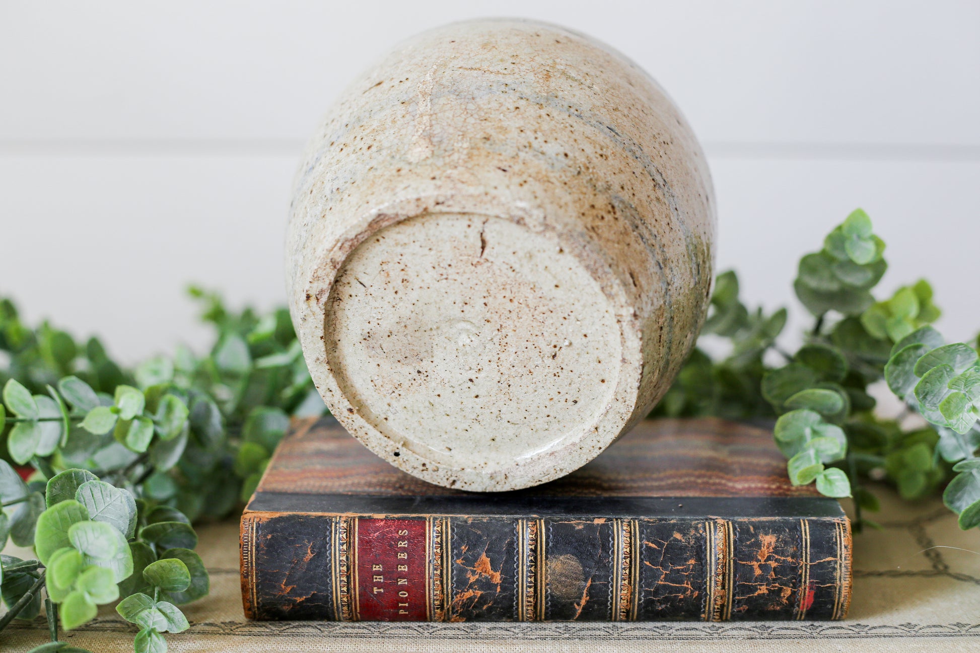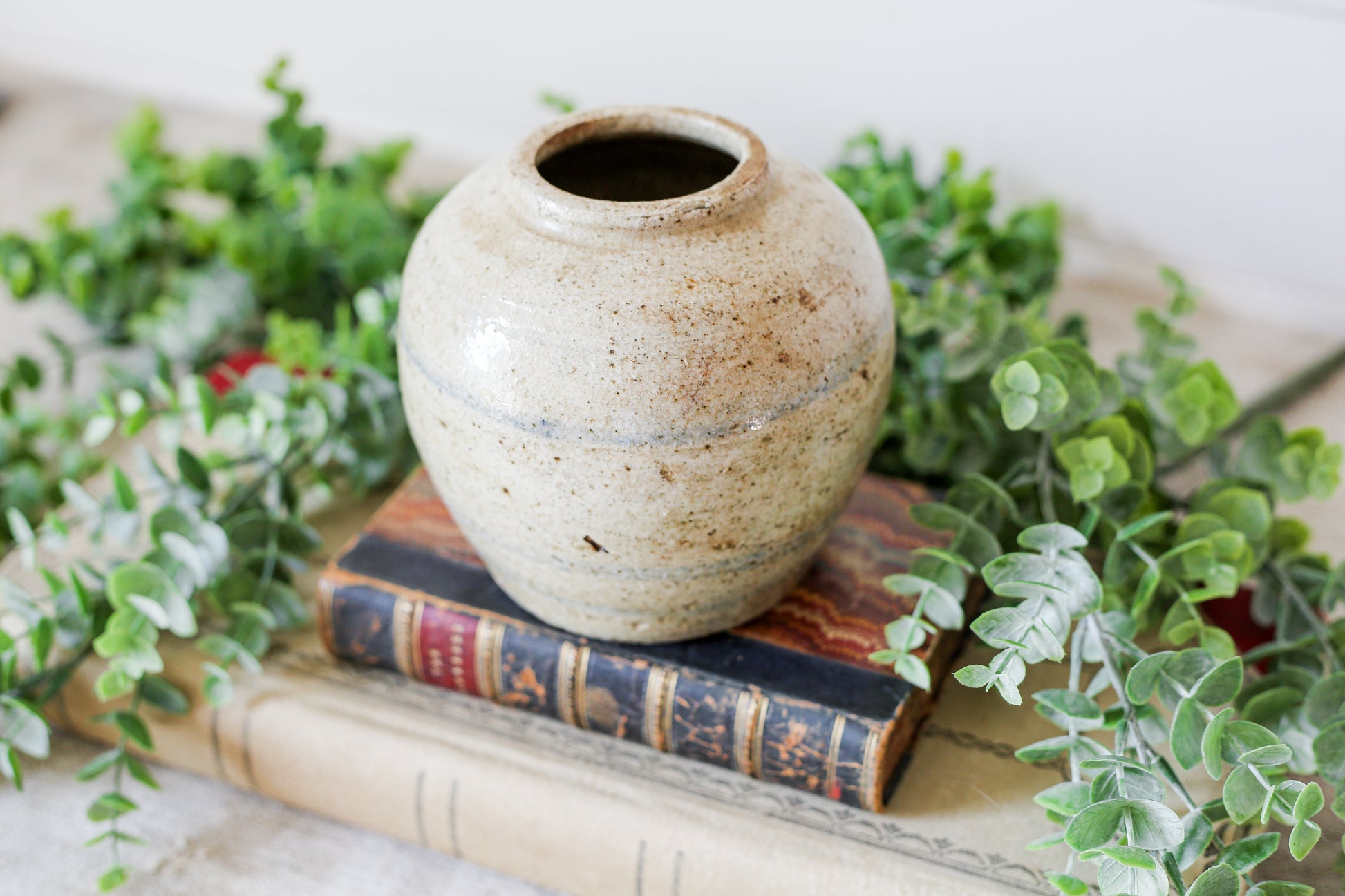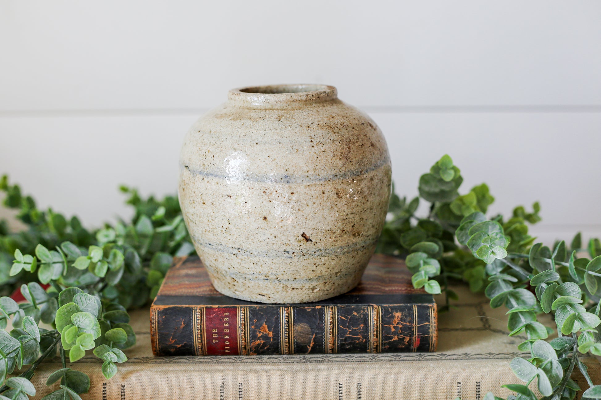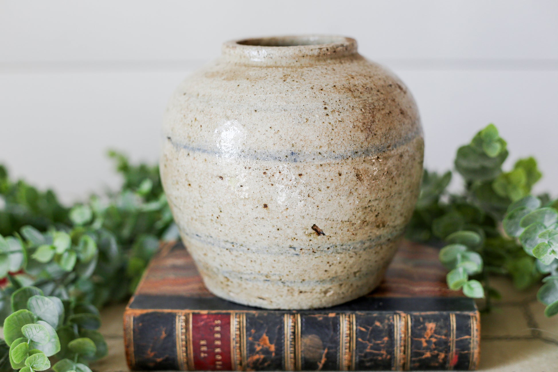 Antique Chinese Stoneware 5" Rustic Ginger Jar with Blue Stripes