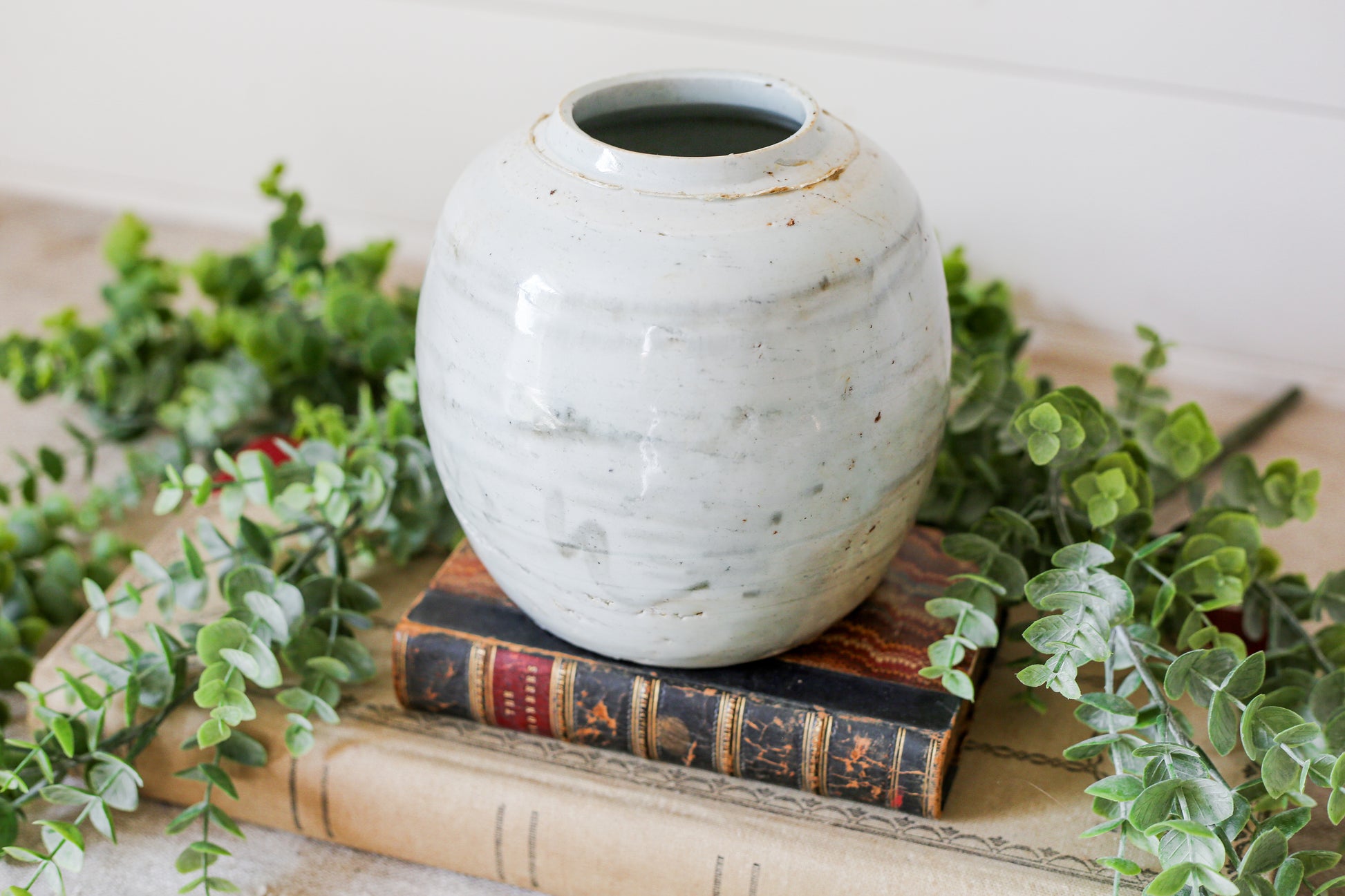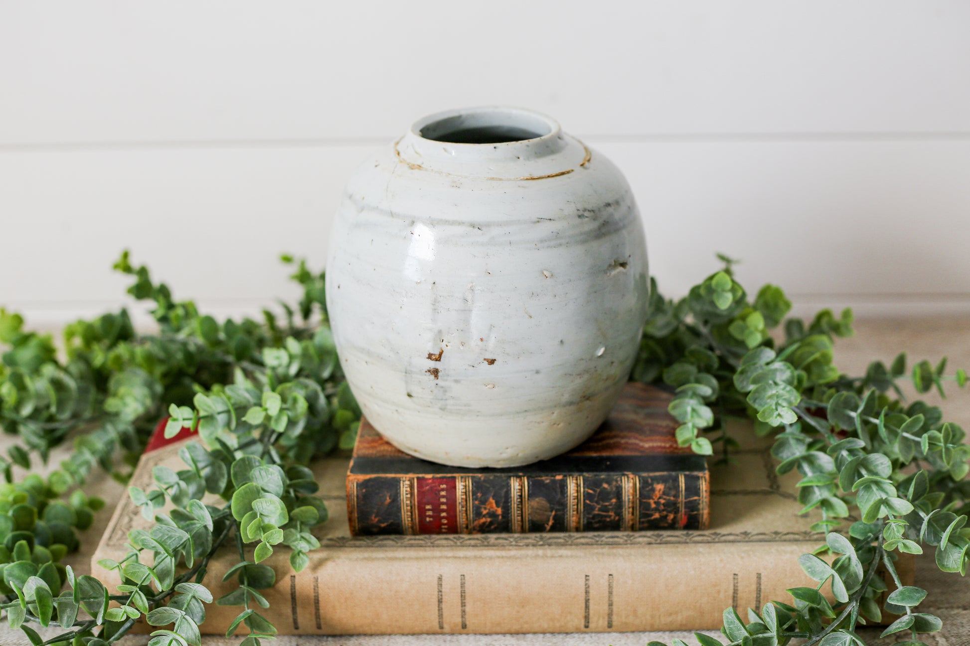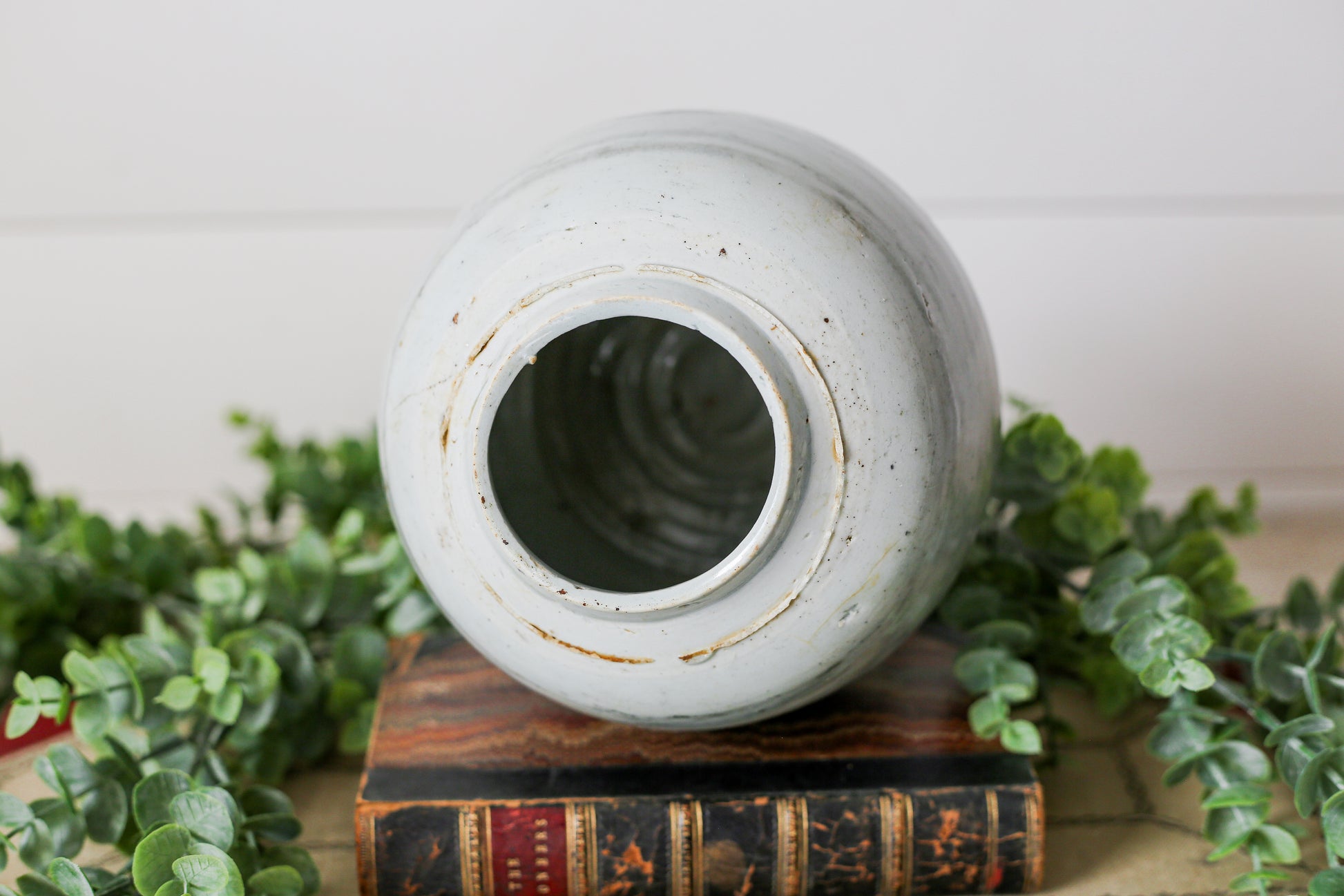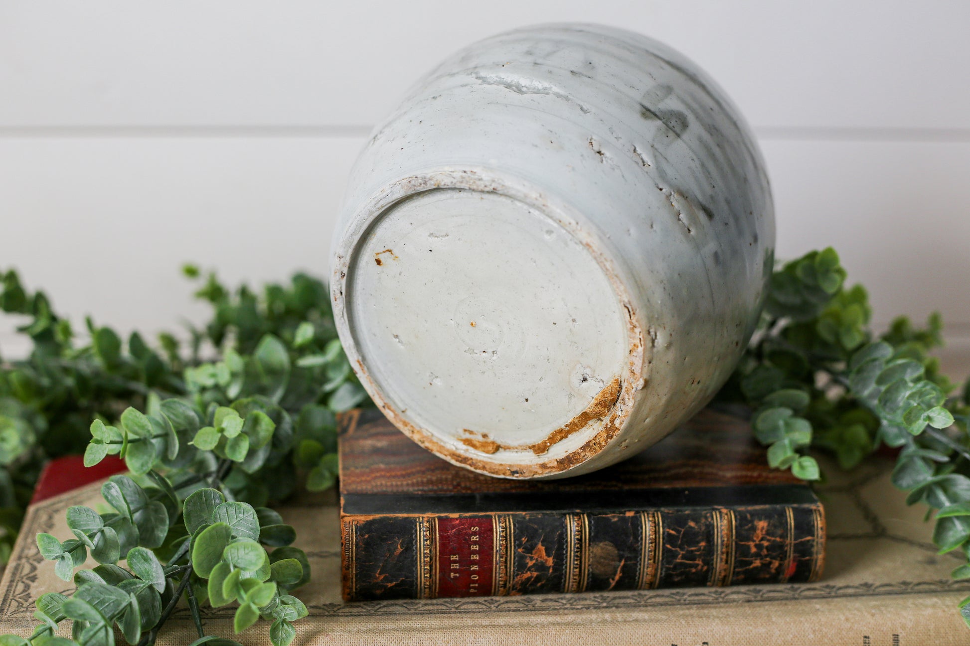 Antique Chinese Stoneware 6" Chinoiserie Gray Ginger Jar with Blue Decoration