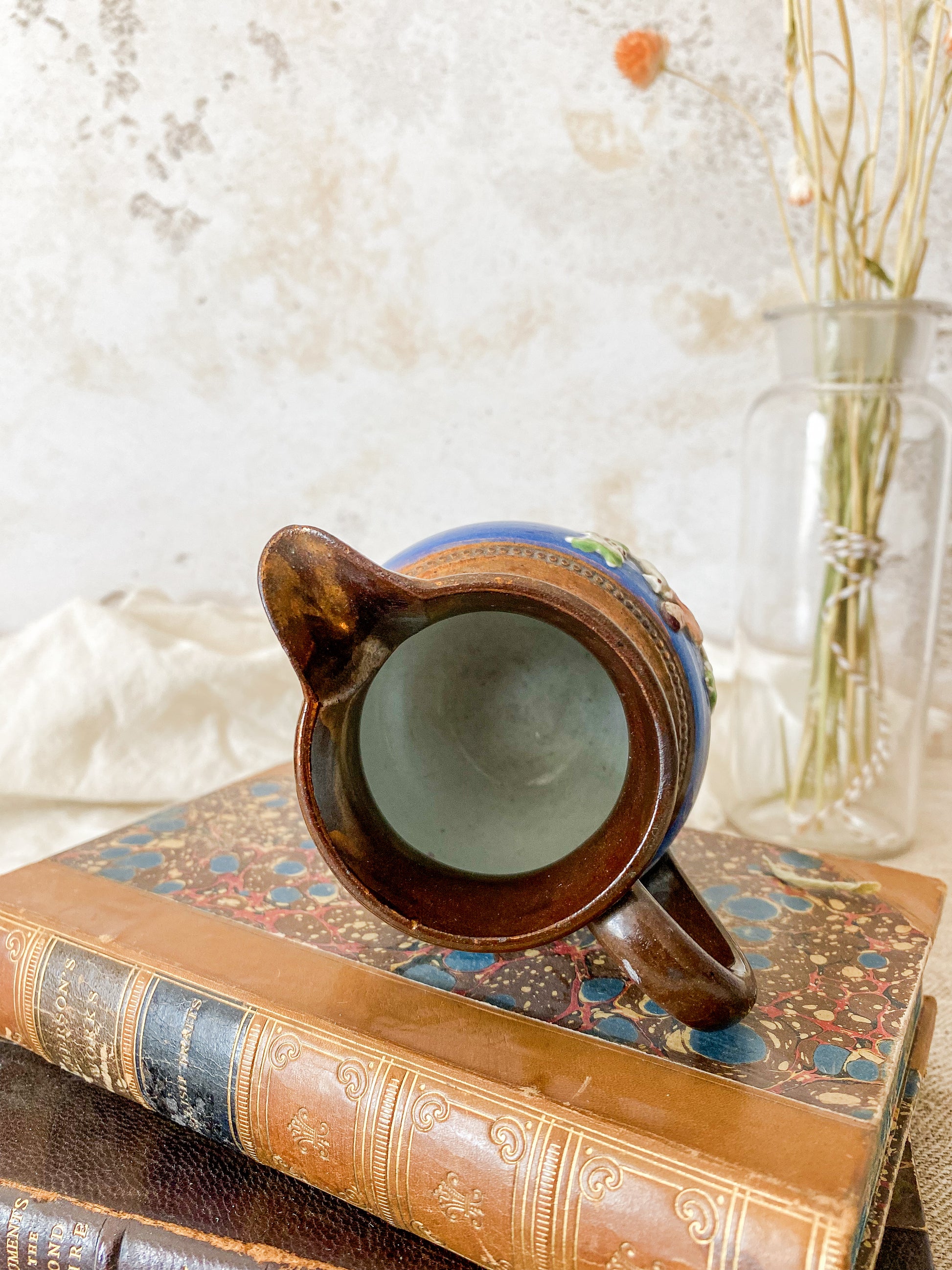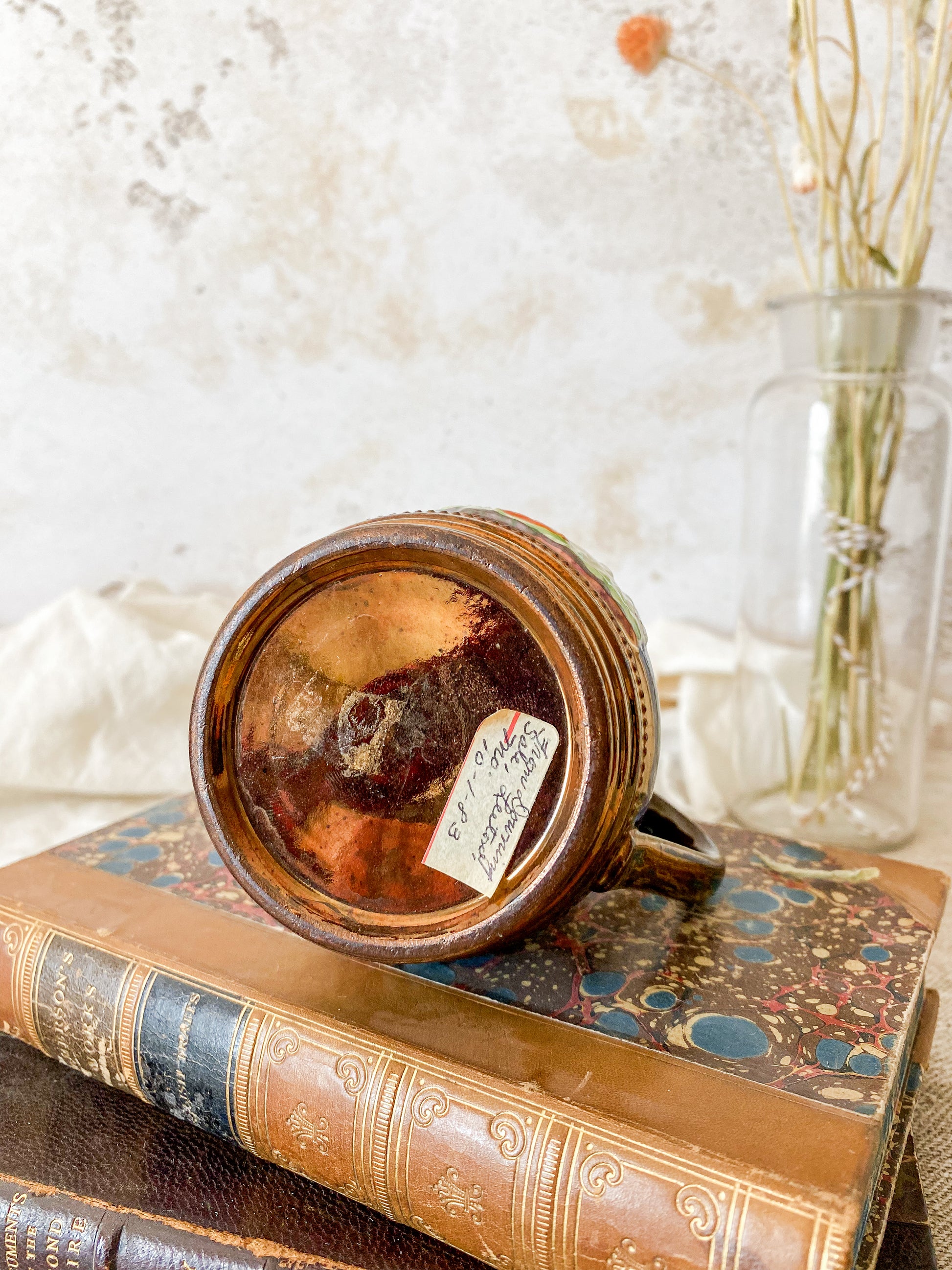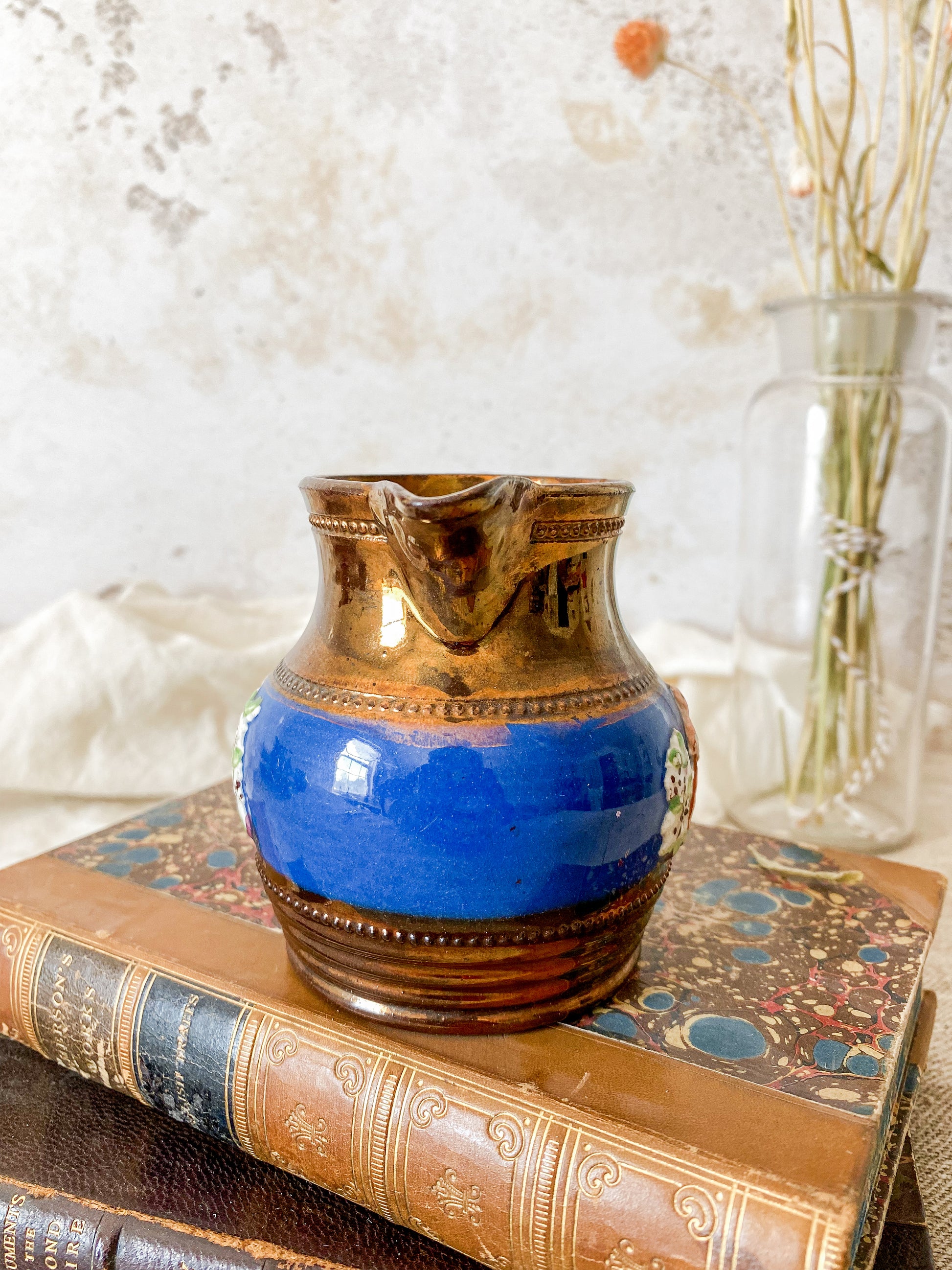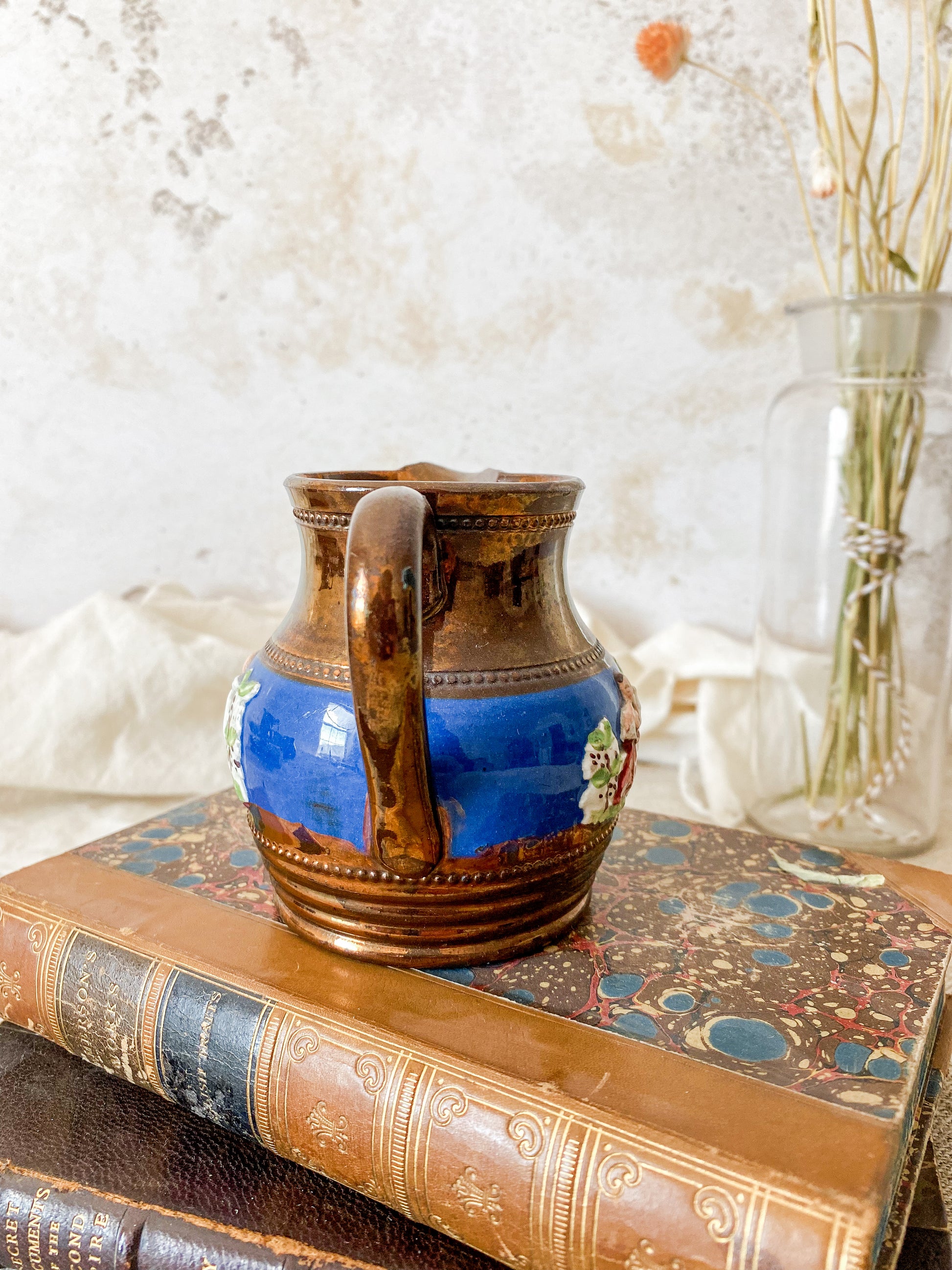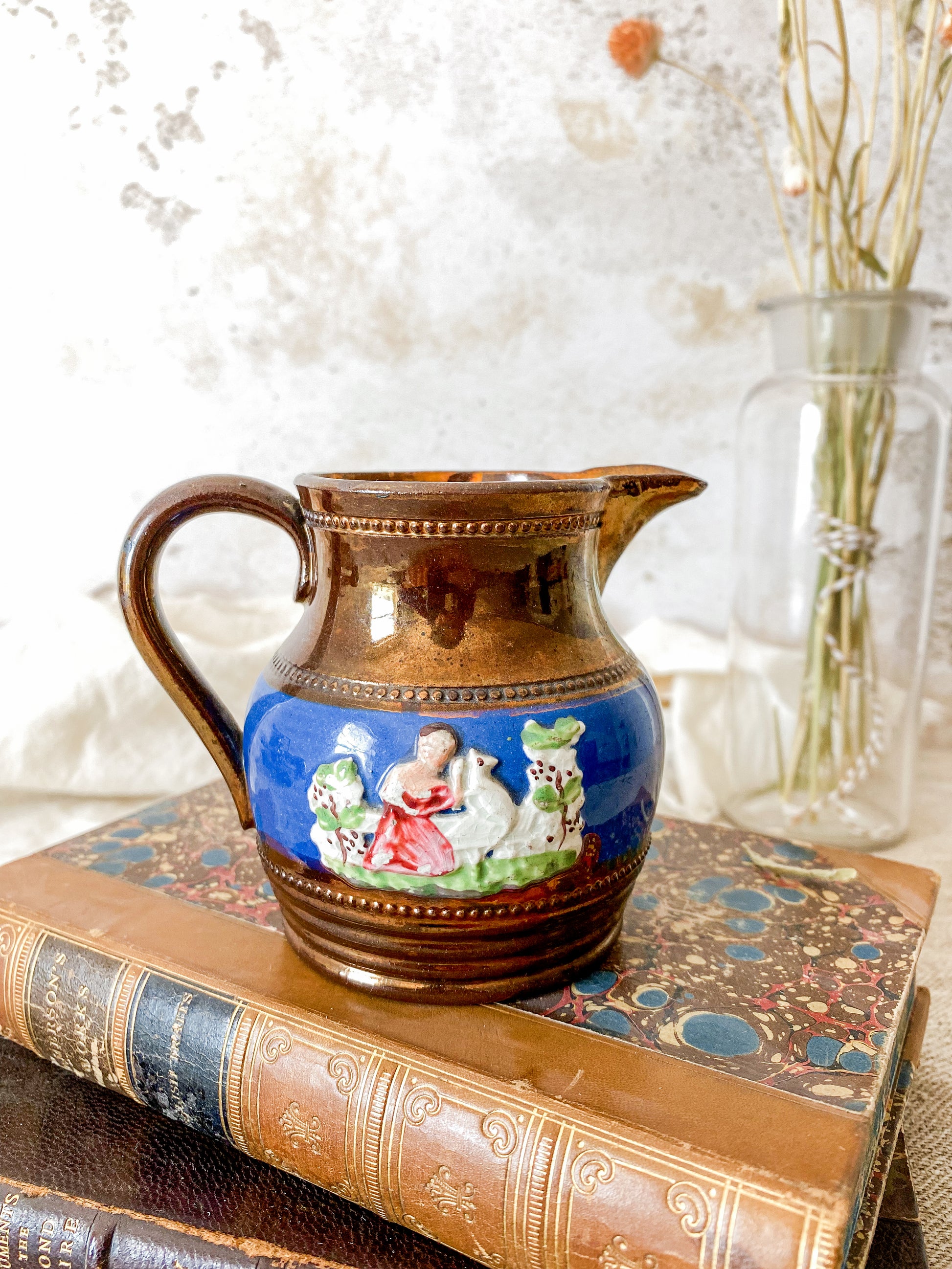 Available is an antique copper luster pitcher with a pastoral scene of shepherdess and flocks on blue band on both sides. Lovely petite size for a shelf accent or small floral arrangement.