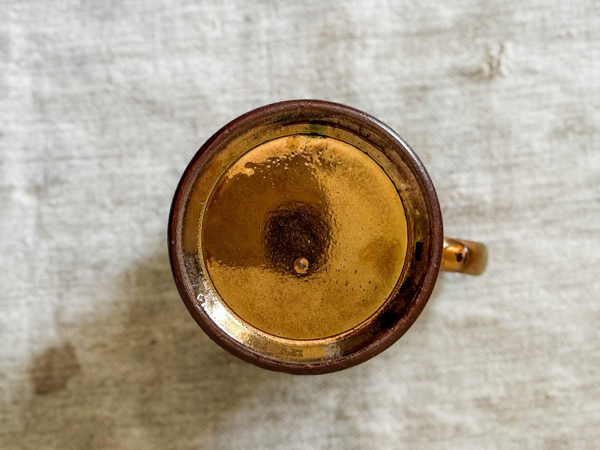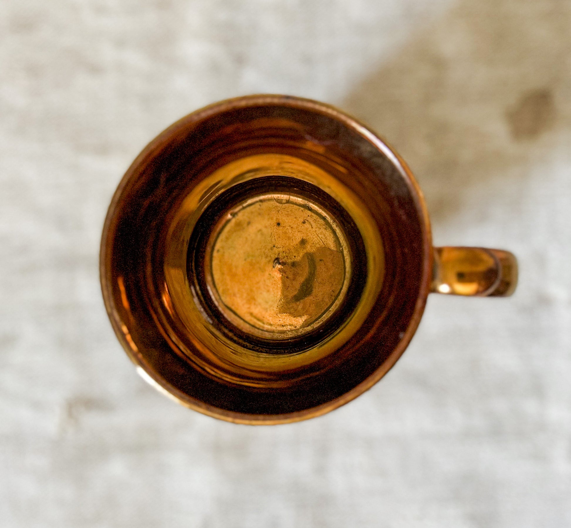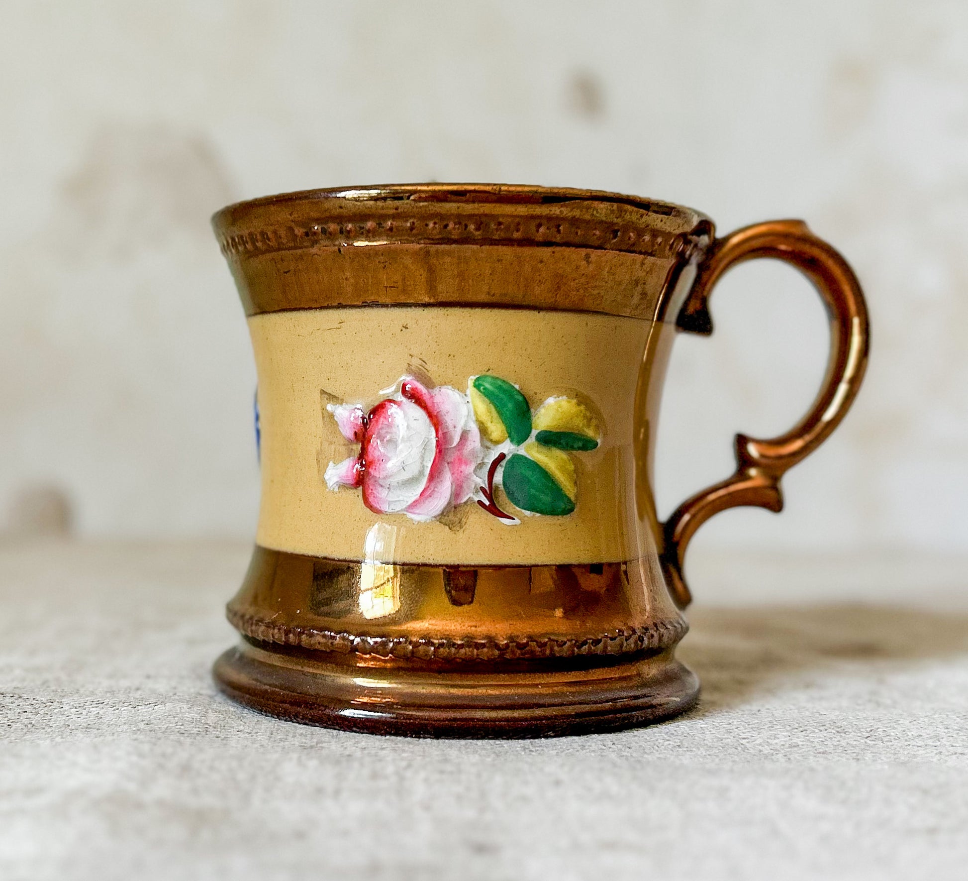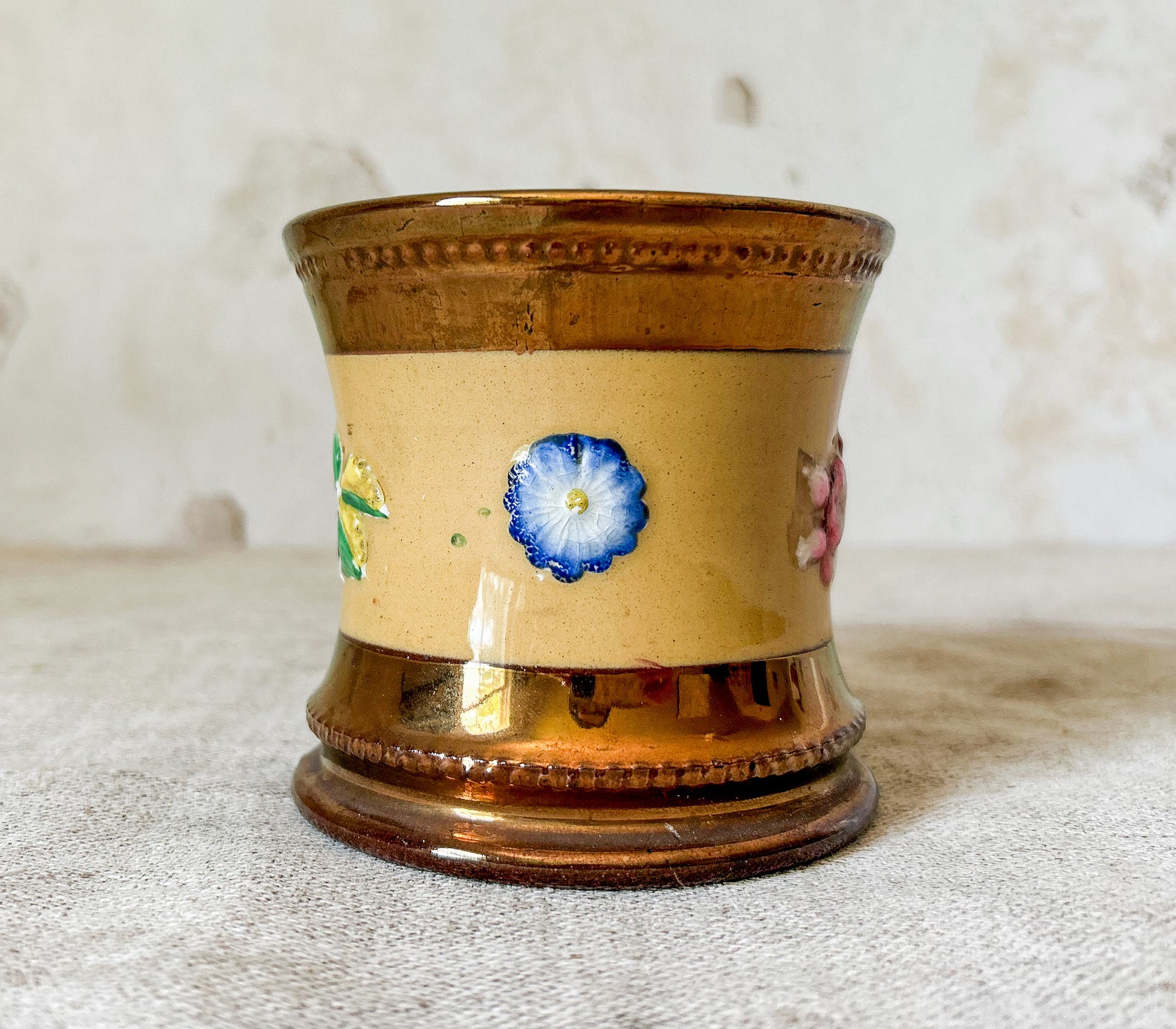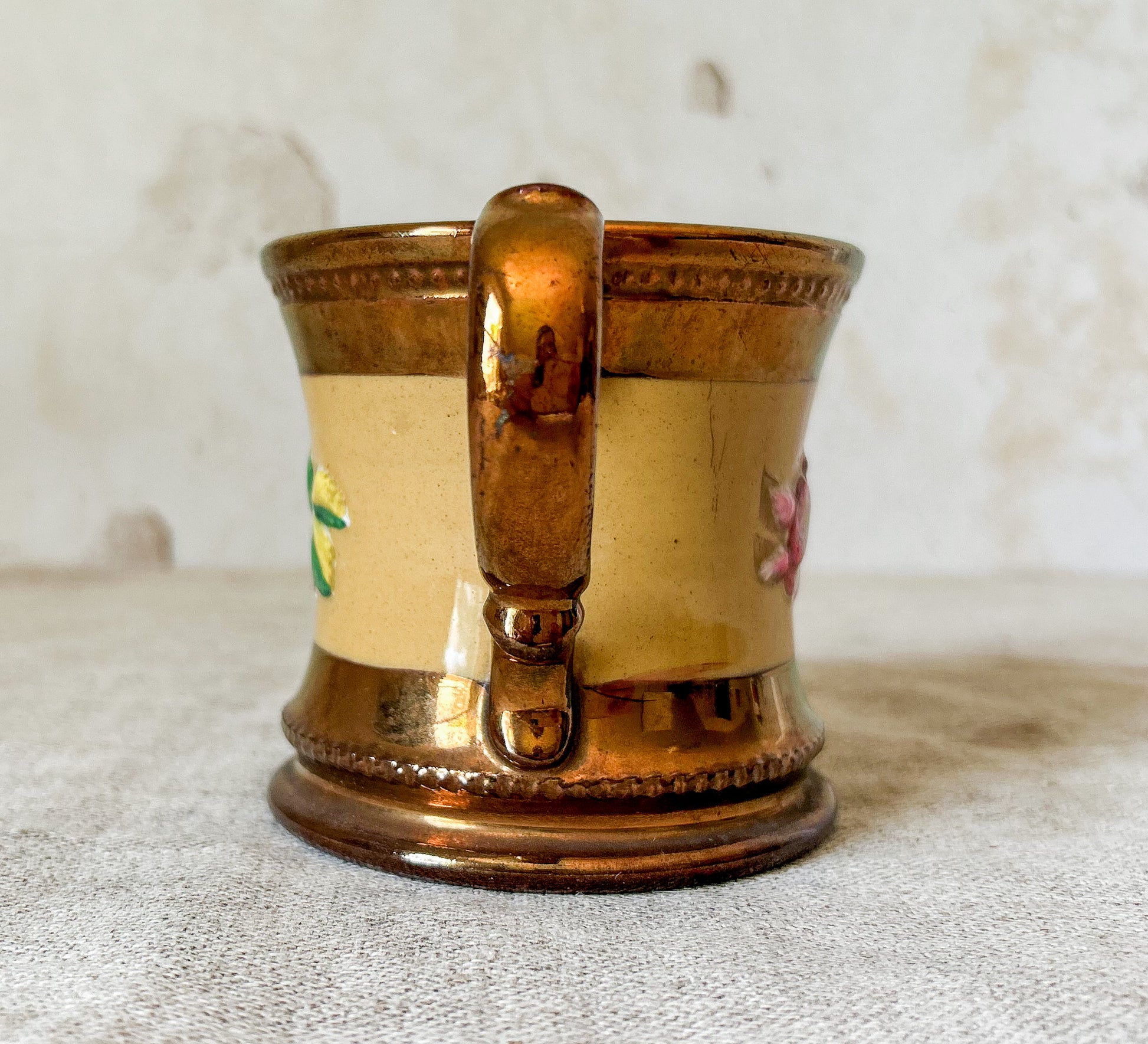 Available is an antique copper lusterware mug with an attractive butter yellow band and raised floral detail. This piece is unmarked but typical of pottery produced in the late 19th century.