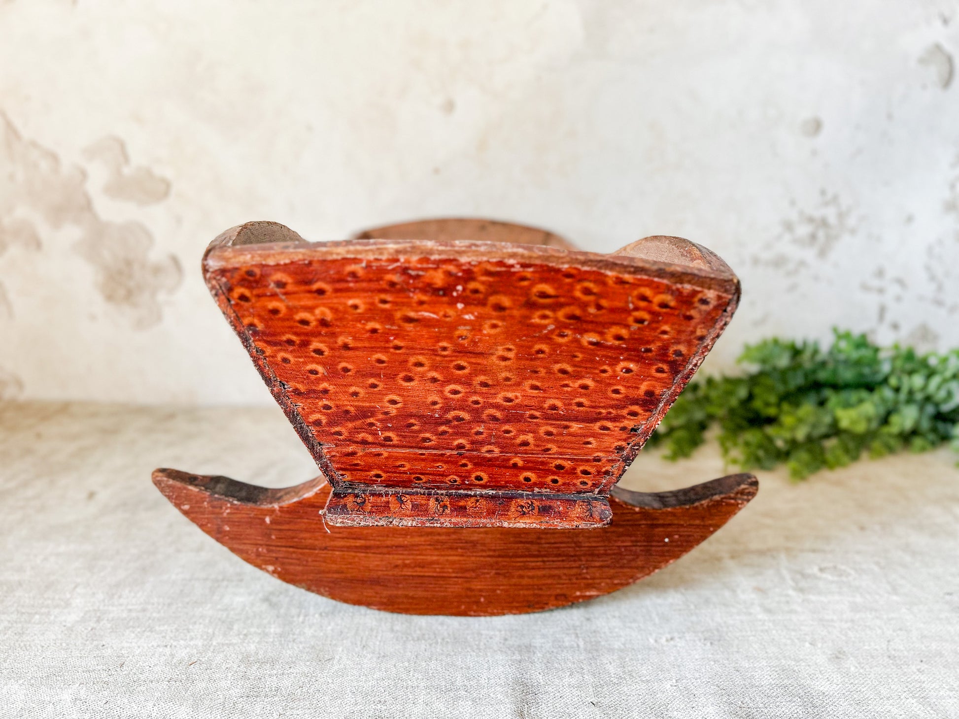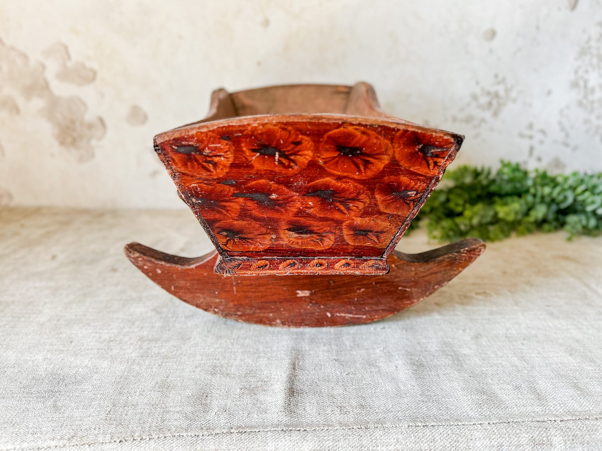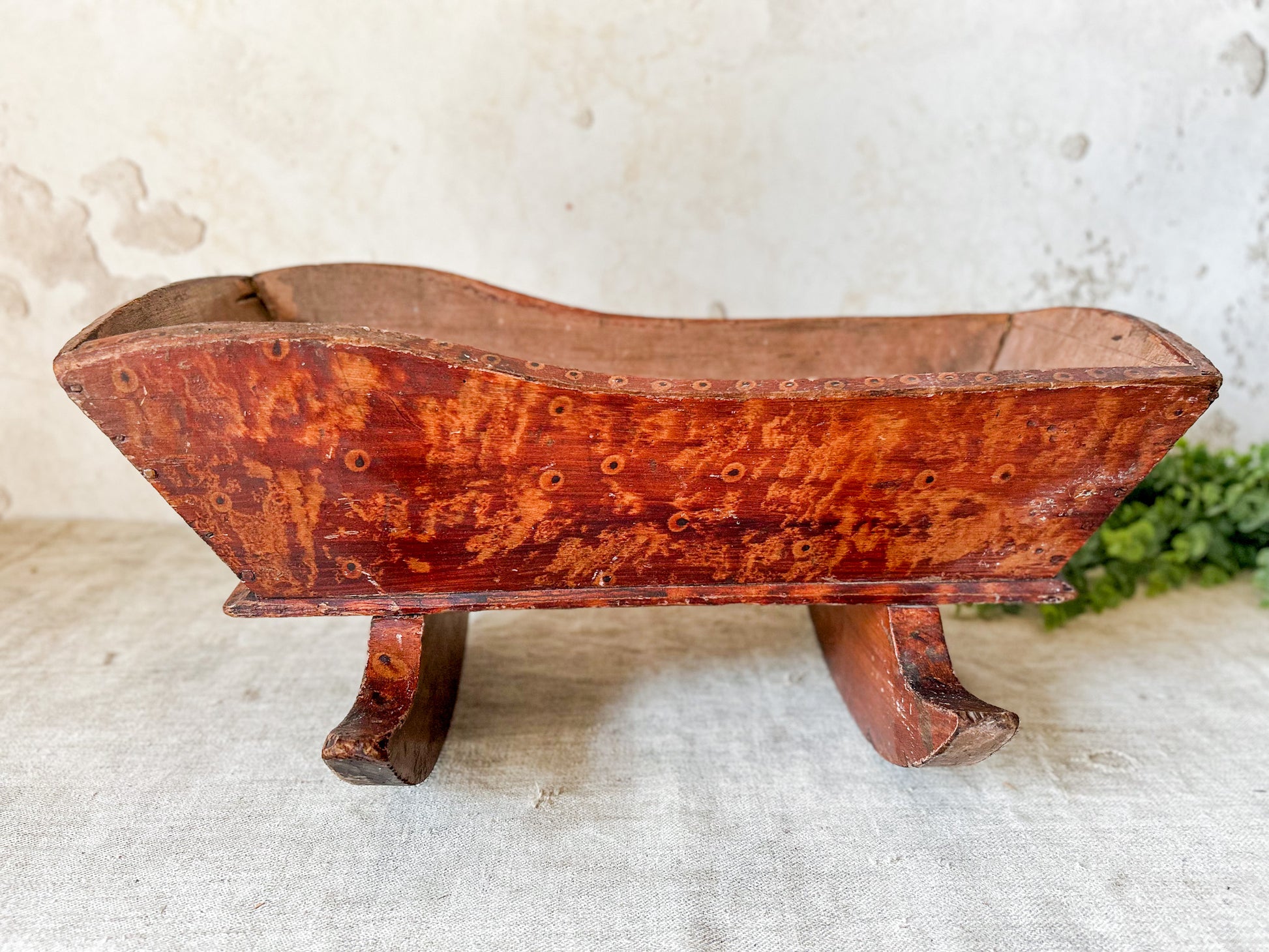 Available is a primitive doll cradle with unusual hand painted grain detail. The cradle has two rockers. The wood has been stained in a pattern mimicking wood grain, a common early decorating technique when common wood was used in handmade objects.
