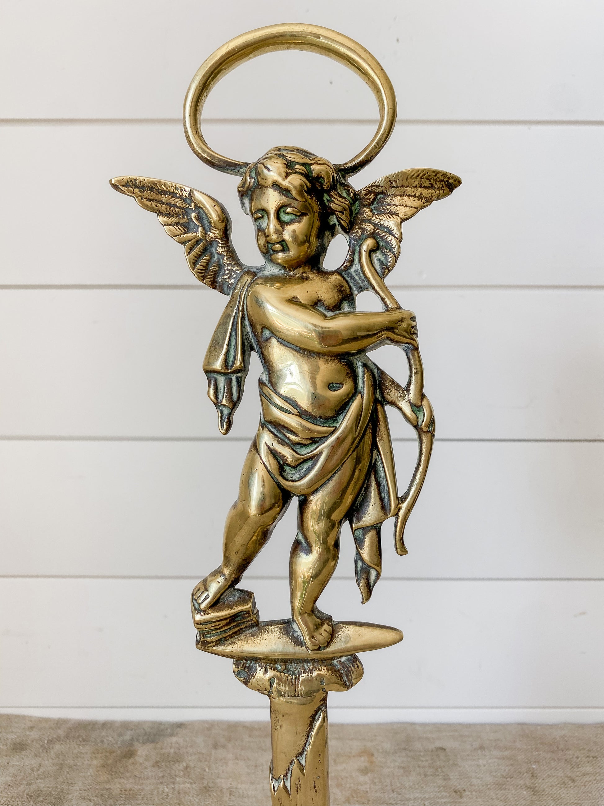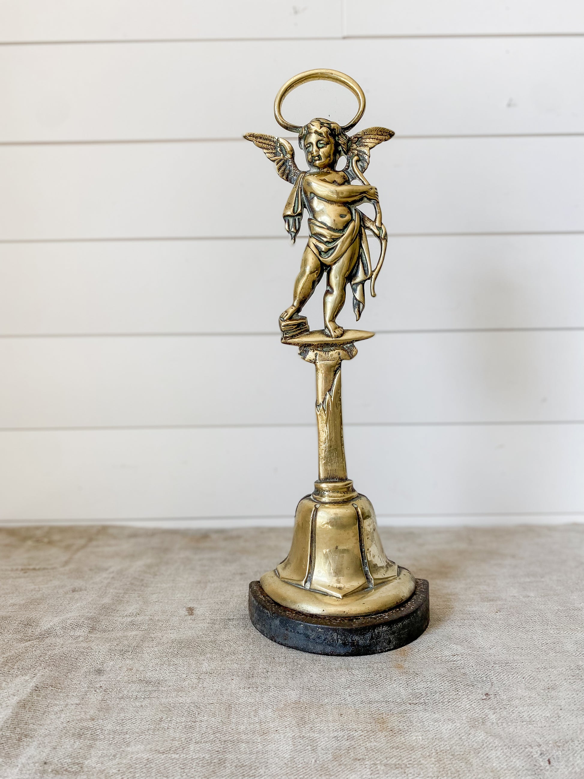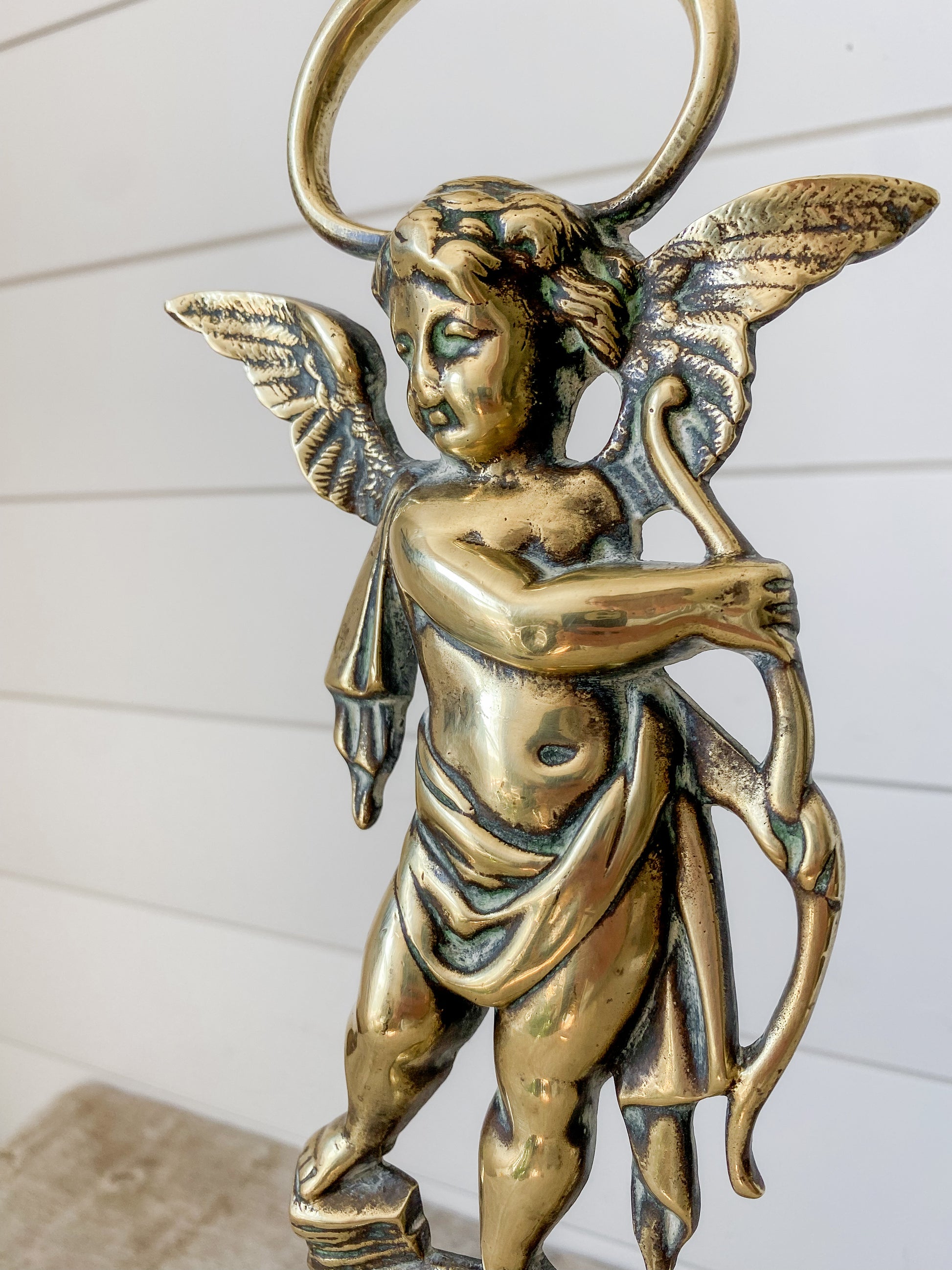 The handle doubles as the cherub's halo, with the cherub holding an arrow in his hands and standing on a pedestal and books. The craftsmanship is exquisite, with detailed folds and wings.