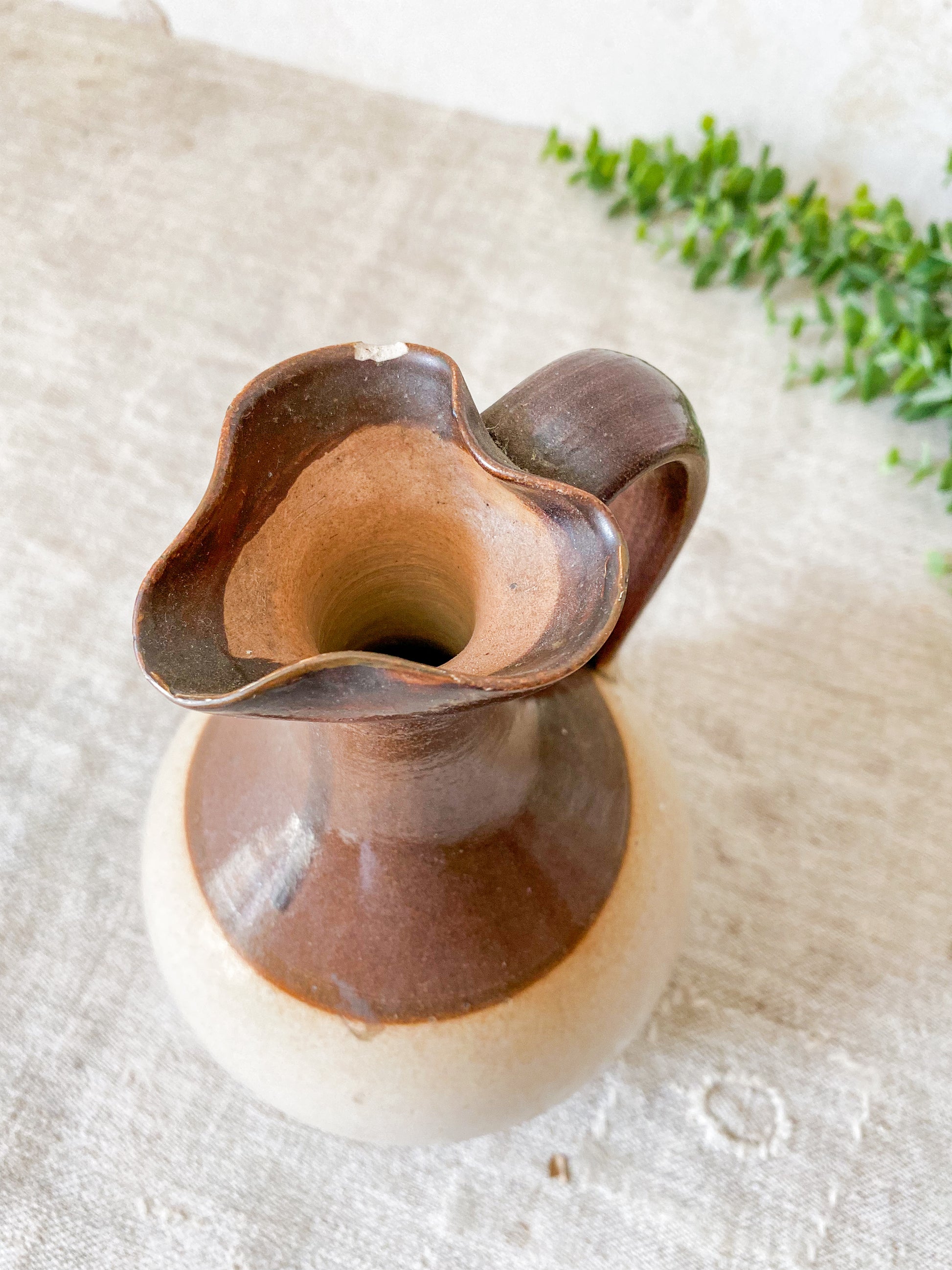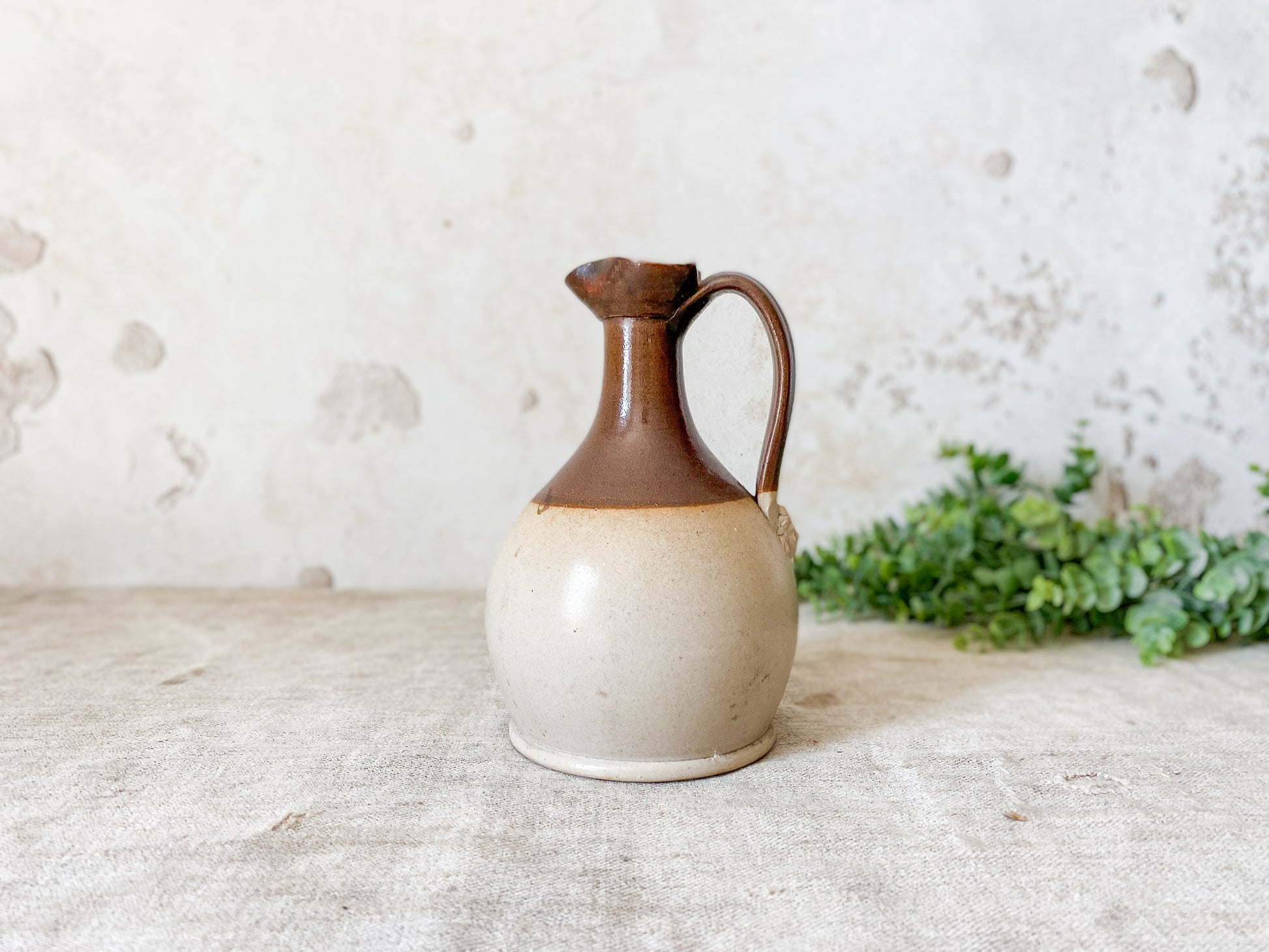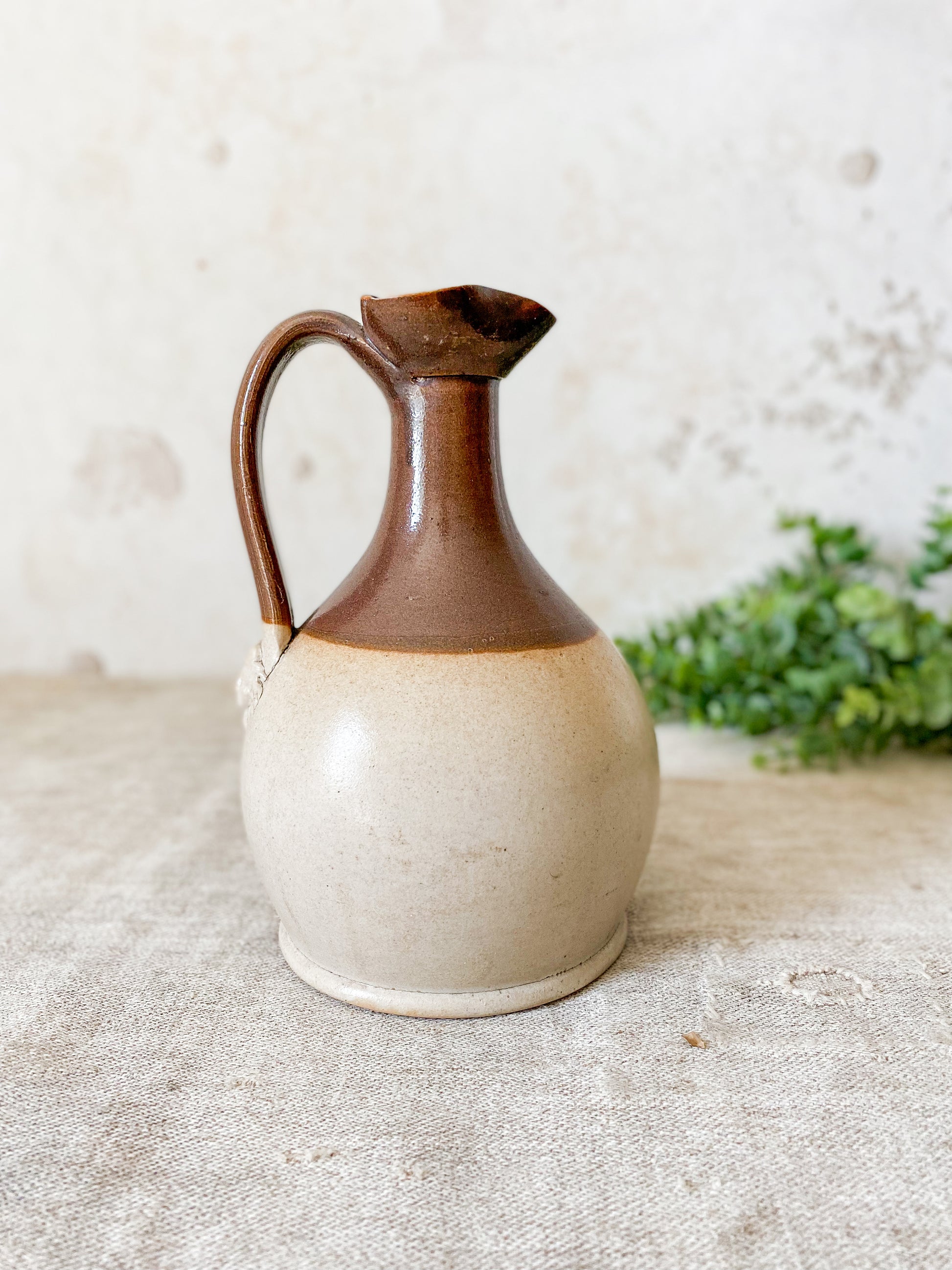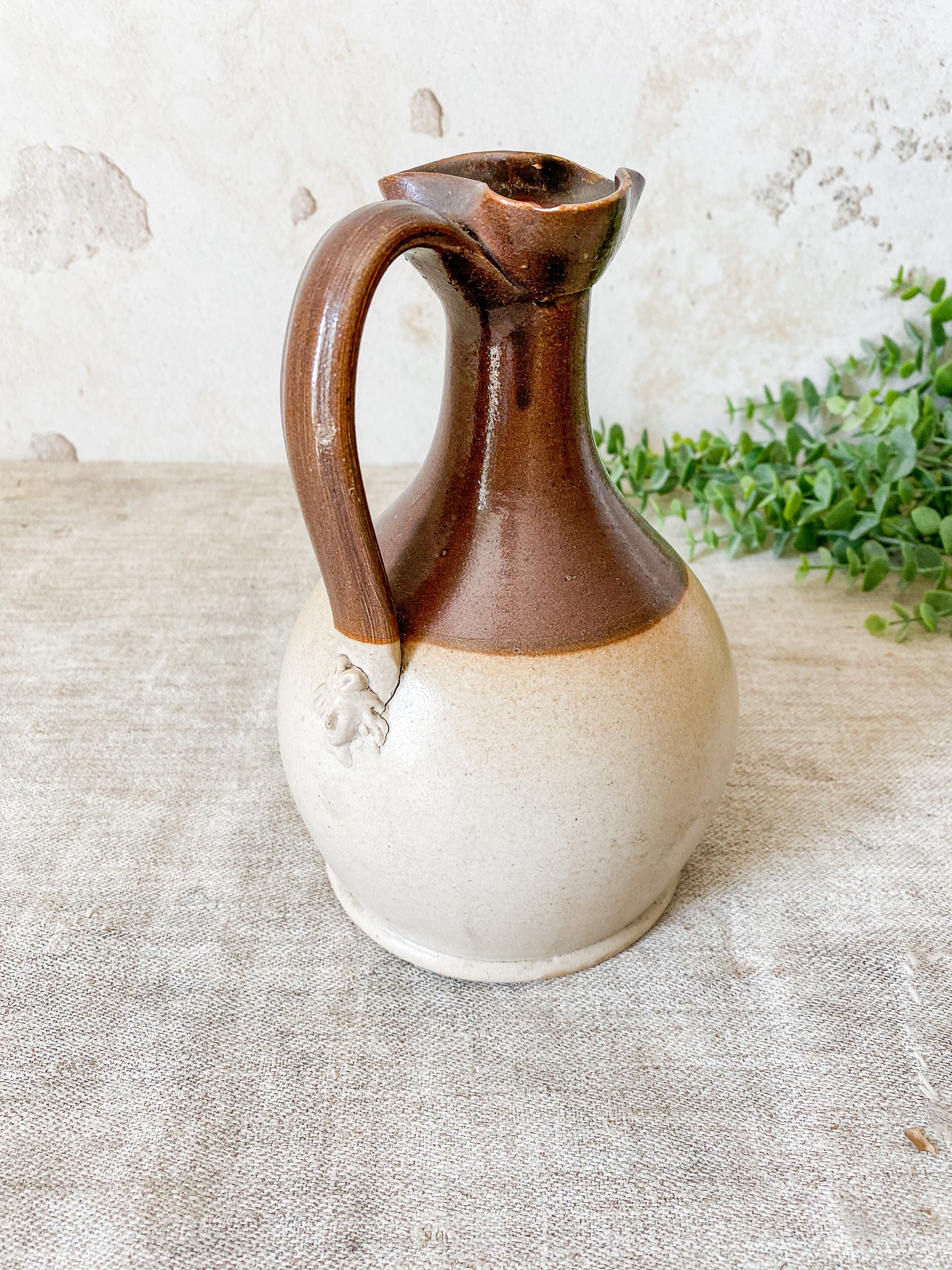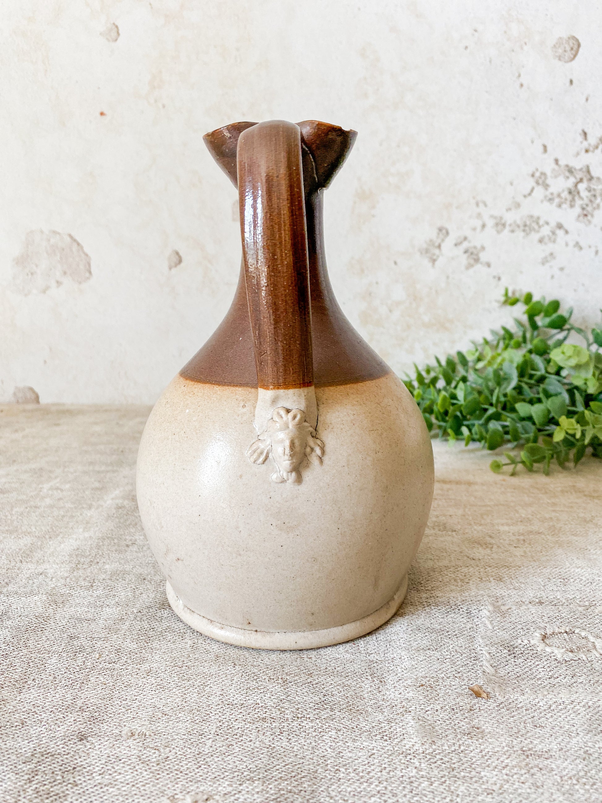 Available is an antique two-tone stoneware pitcher with an unusual figural face handle decoration. This piece has a dark brown upper half with fluted pouring spout. The bottom half is light beige. The handle base has a gothic face decoration.