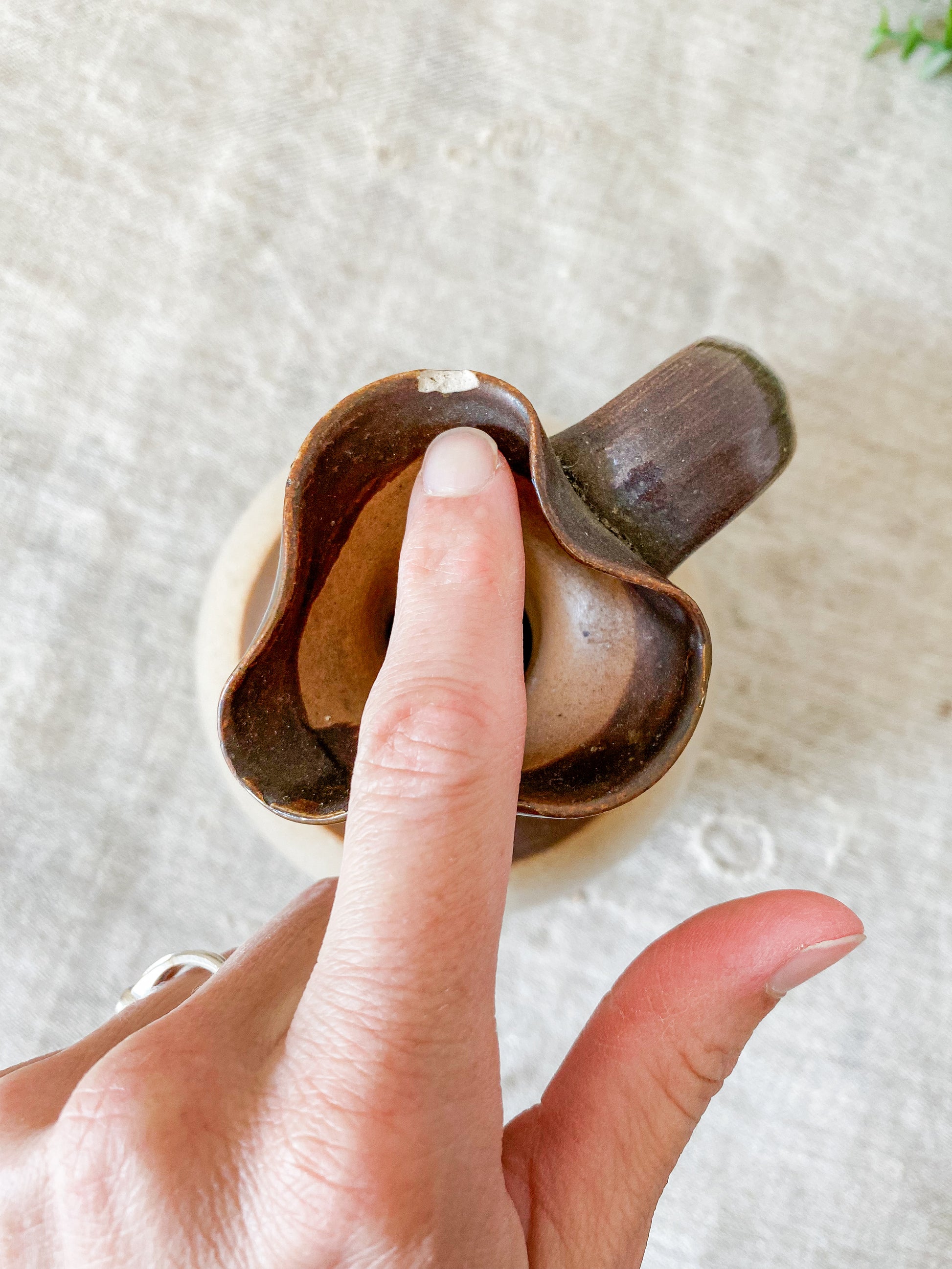 Small chip on opening spout. Stress lines visible around the handle base, but remains tight and functional.