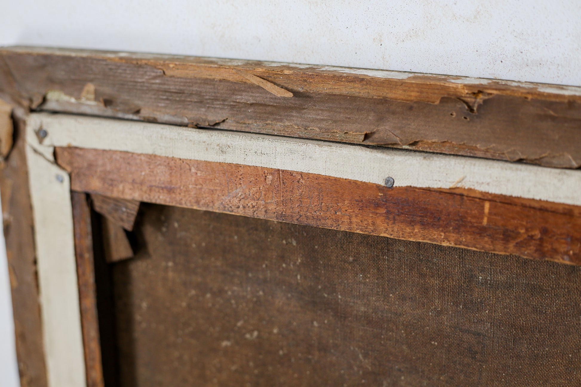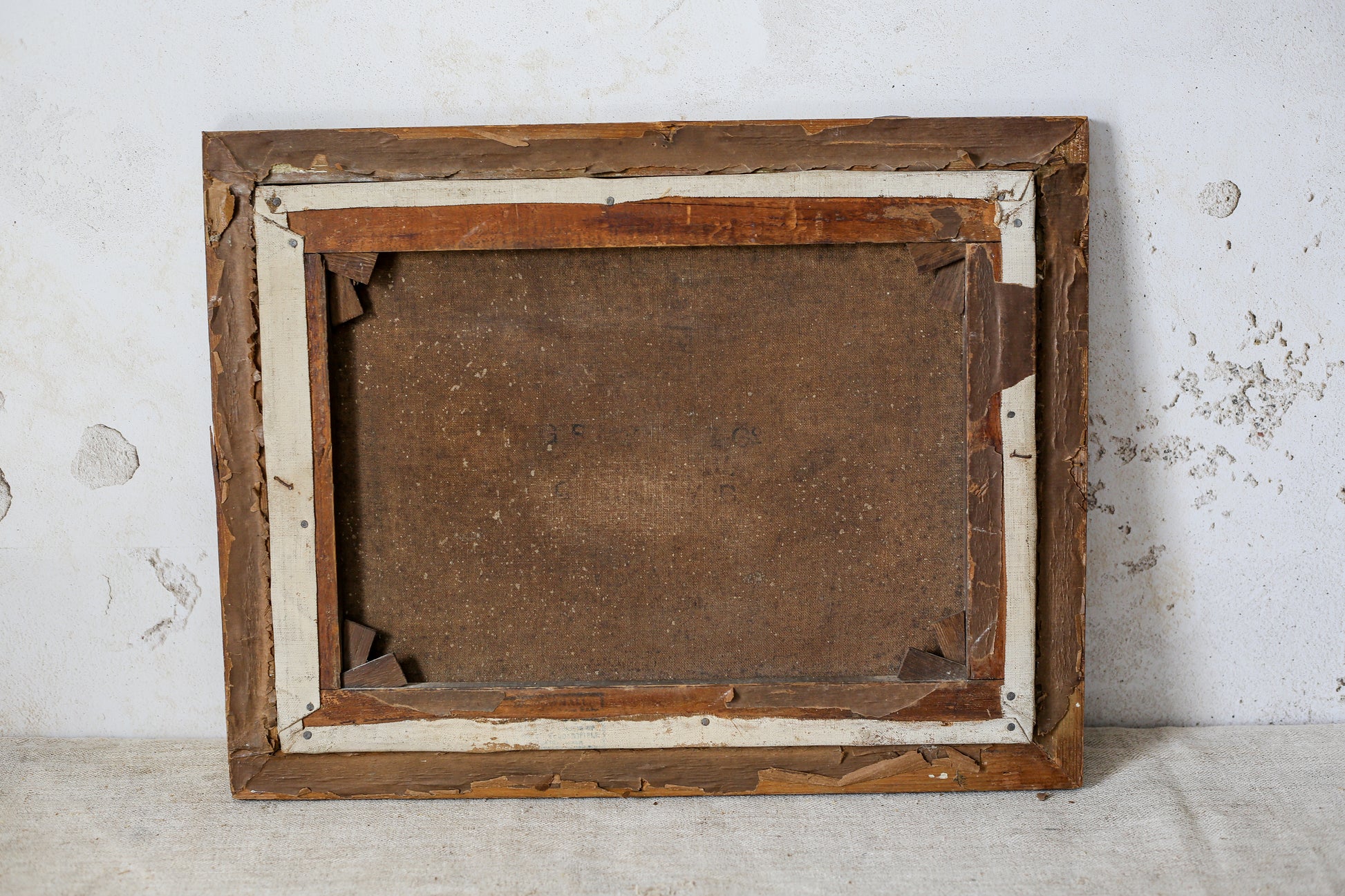Available is an antique signed oil painting on canvas, depicting a bucolic farmyard scene in warm ocher, brown, and gold tones. The painting has light craquelure and is framed in a gilt wood frame.