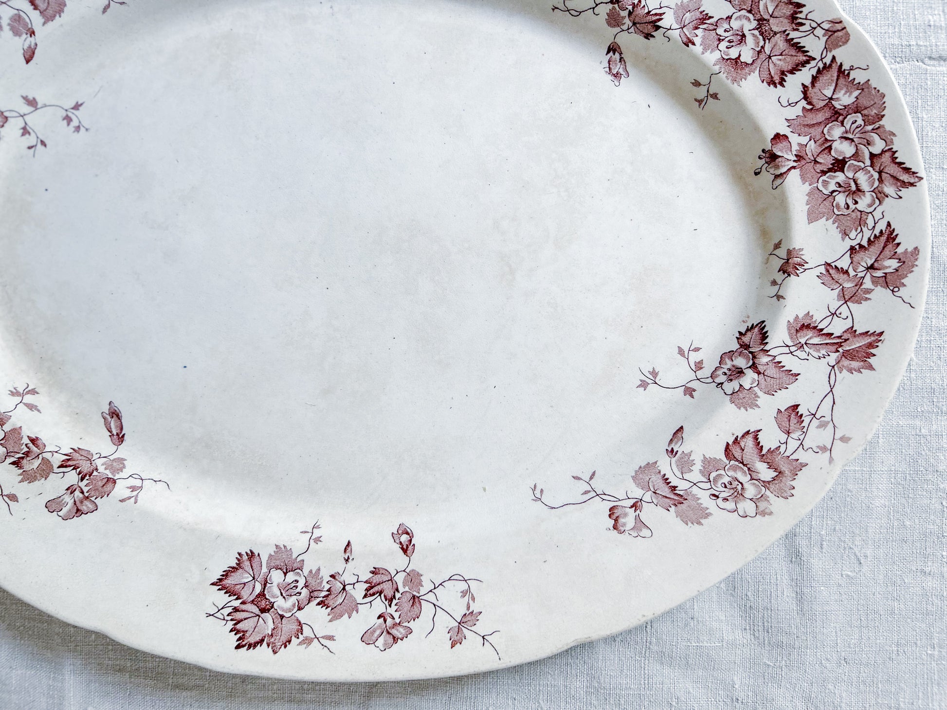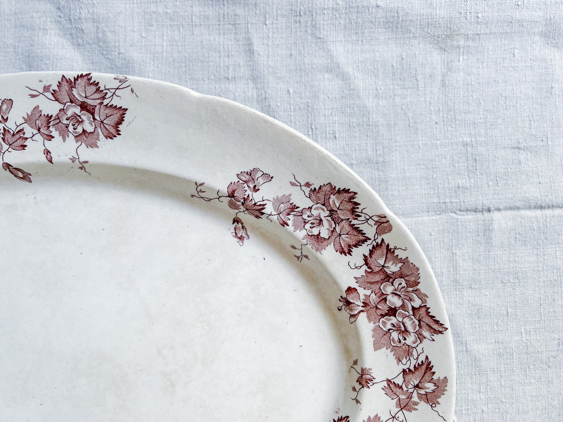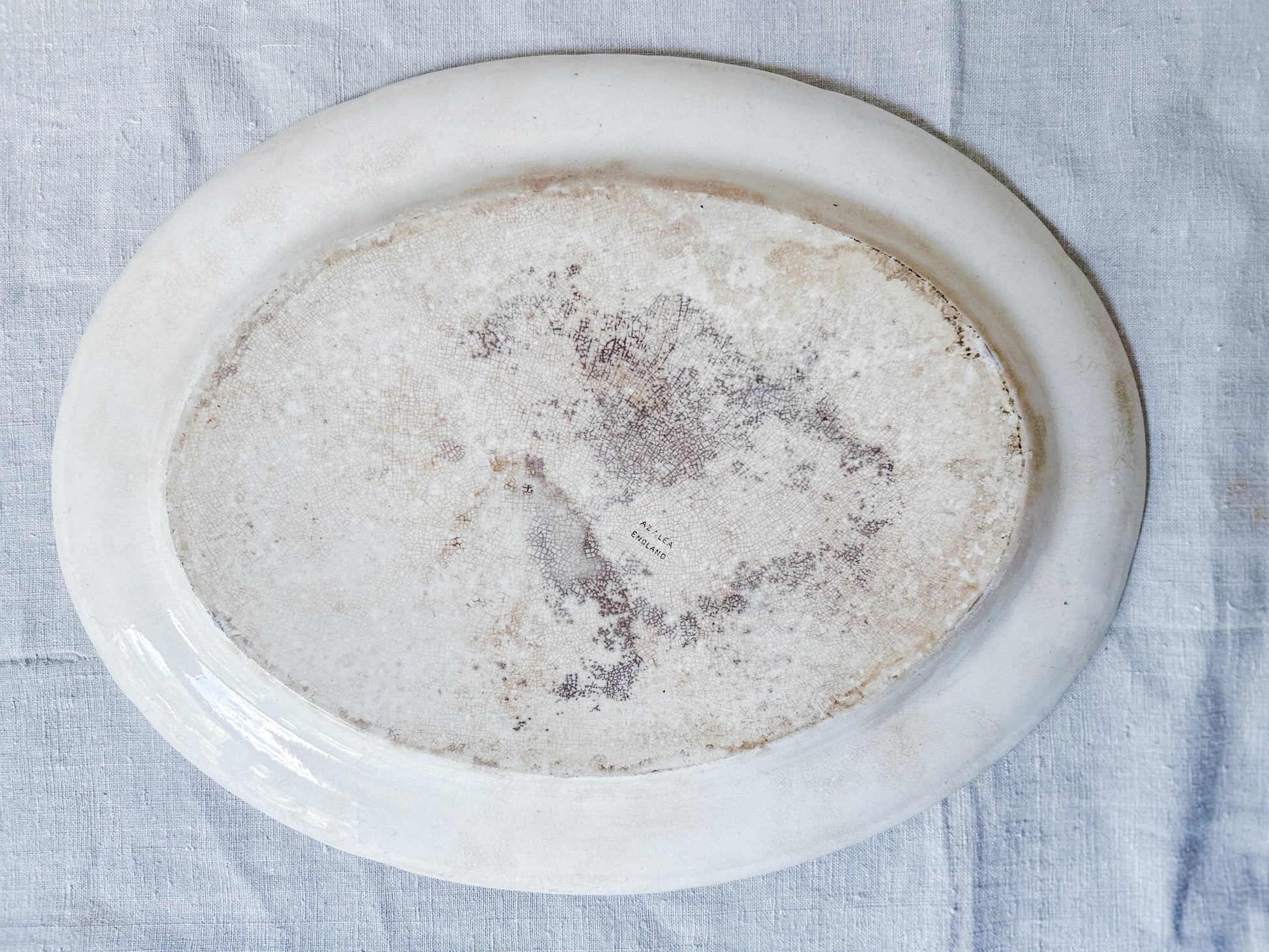 Available is a large antique ironstone platter with attracting staining and floral design. This oval tray is decorated around the edges with brown floral transferware. Light staining and crazing throughout. The back is marked "Azalea England".