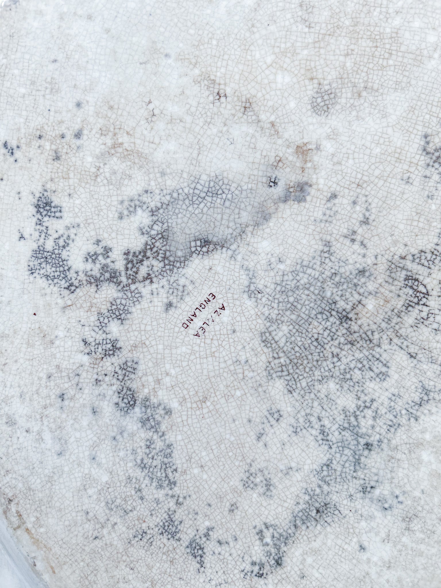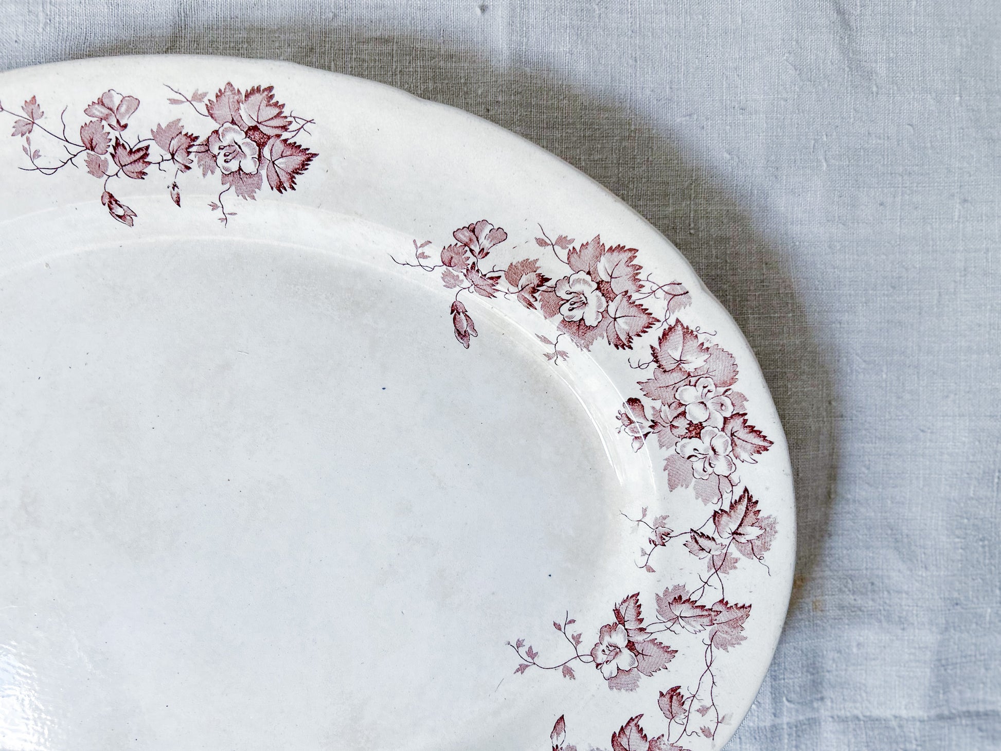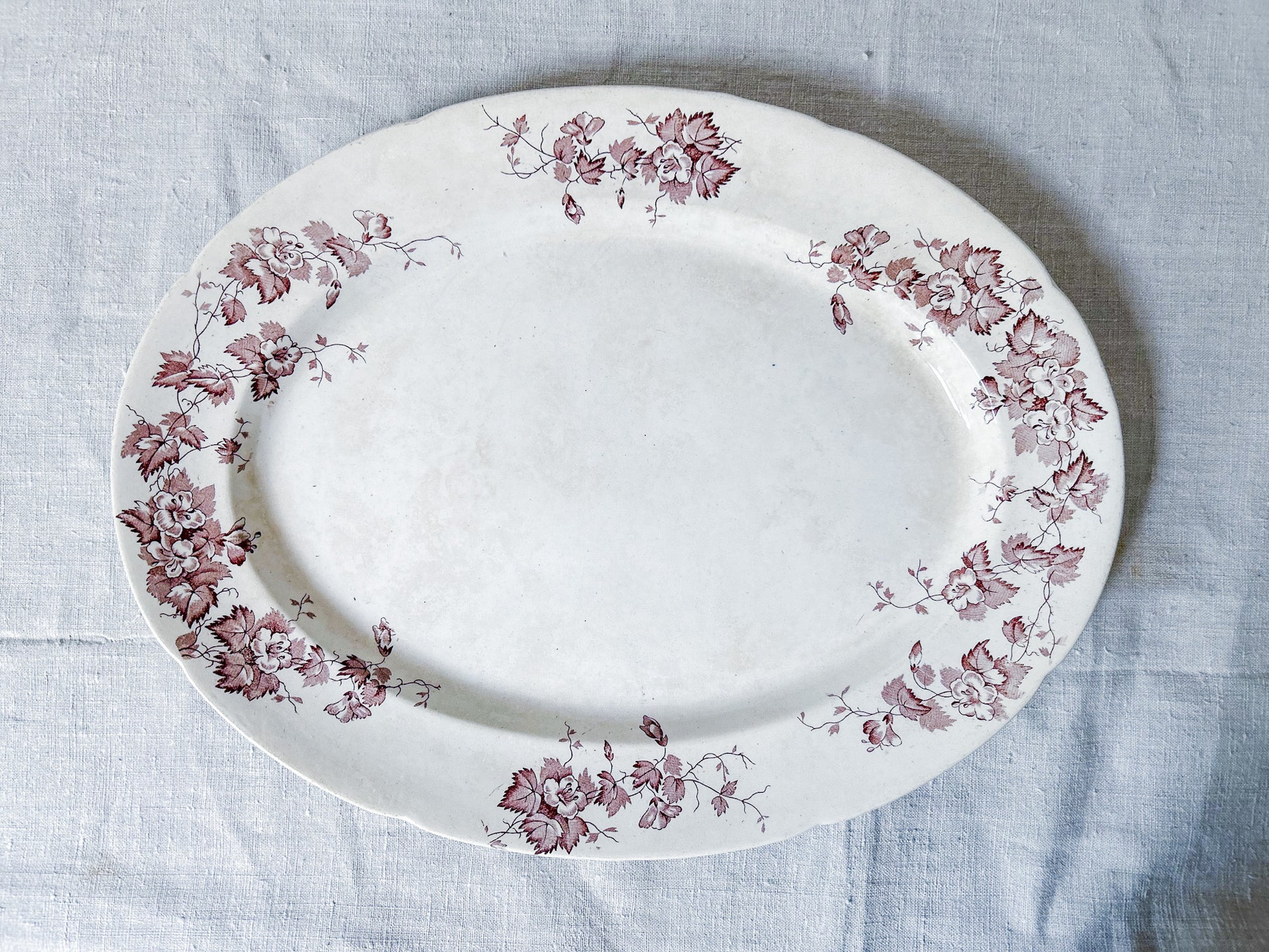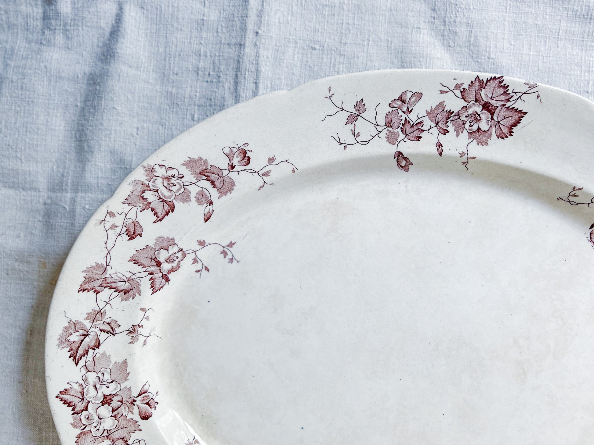 Available is a large antique ironstone platter with attracting staining and floral design. This oval tray is decorated around the edges with brown floral transferware. Light staining and crazing throughout. The back is marked "Azalea England".