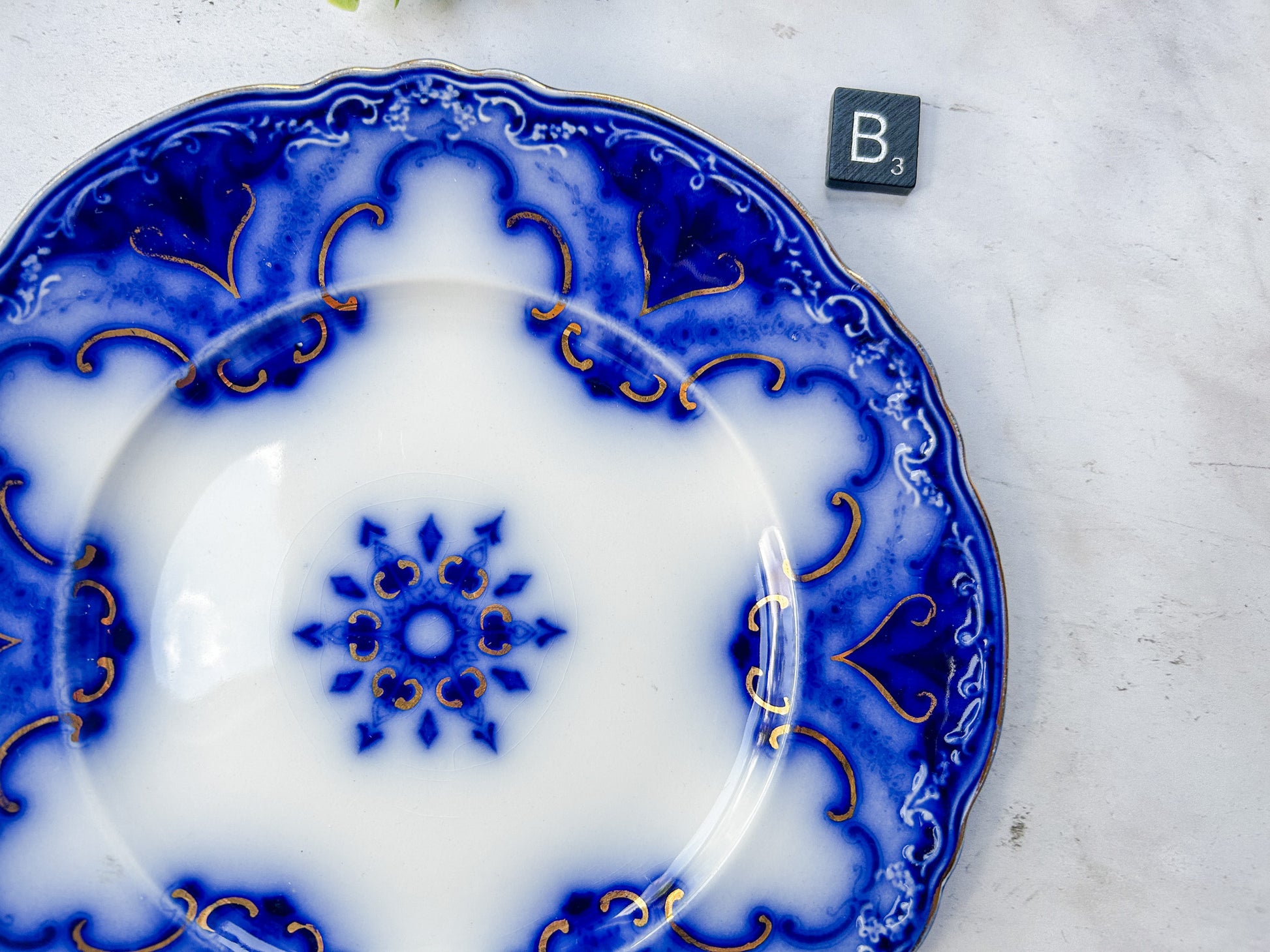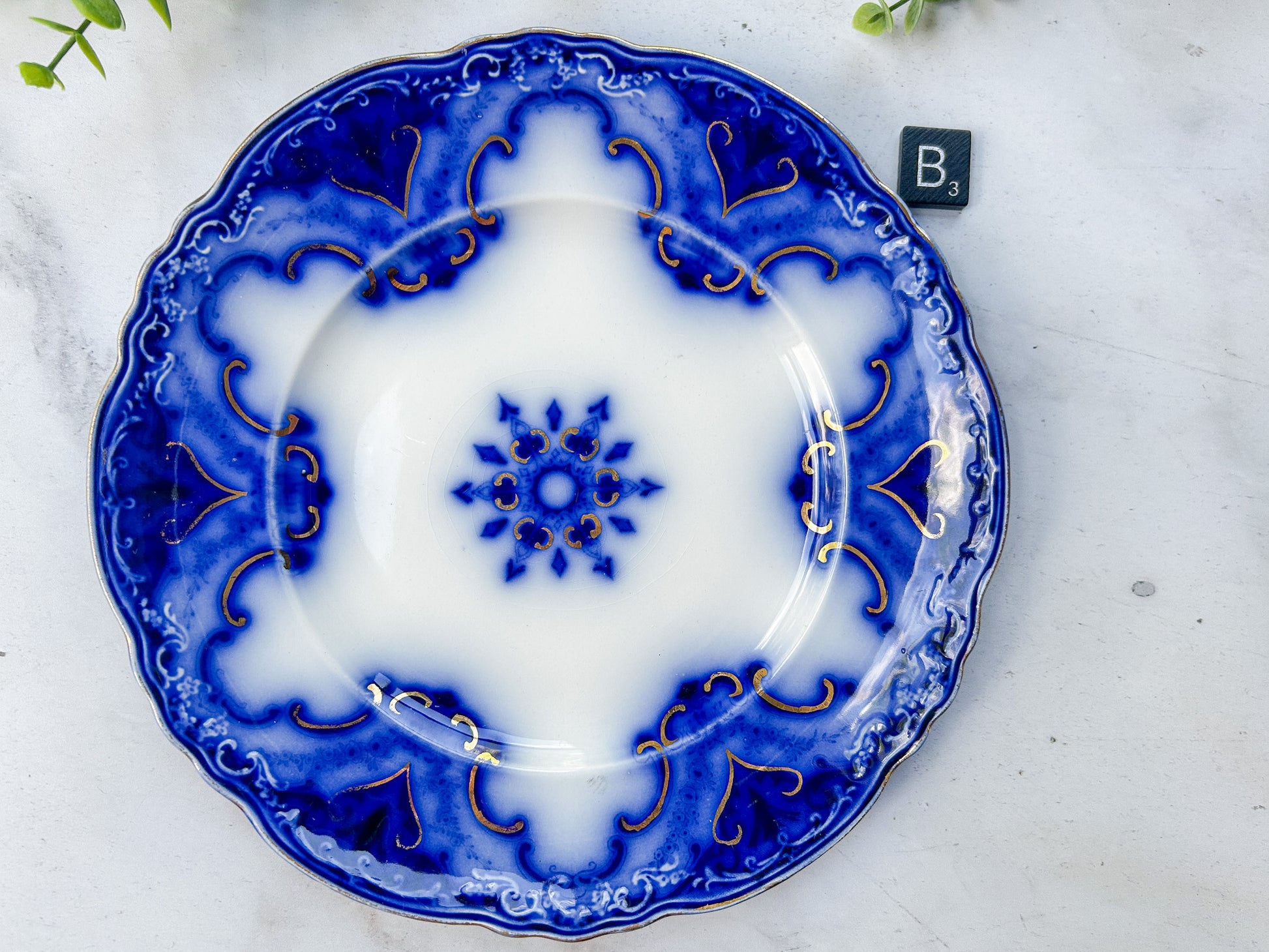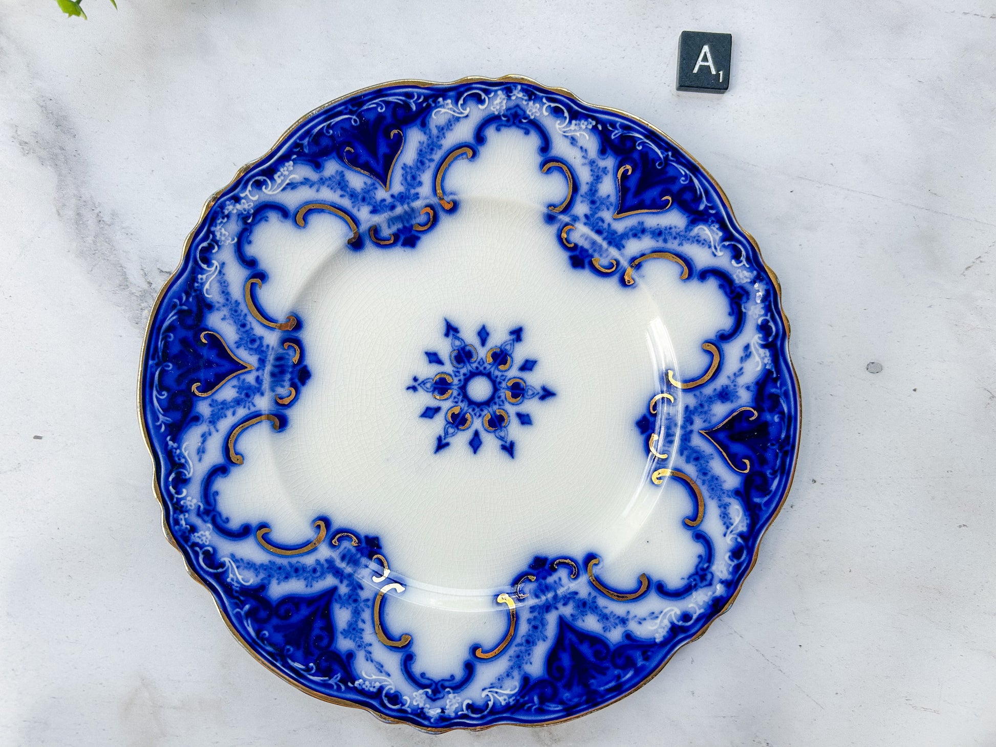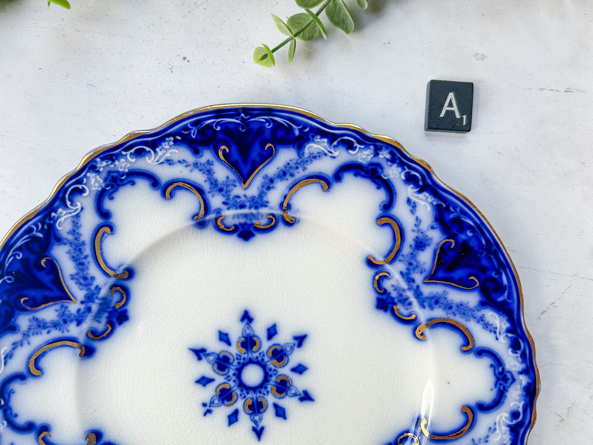CHOICE Antique Gilt Flow Blue 9” Ironstone Plates - Cambridge by Alfred Meakin, c1897