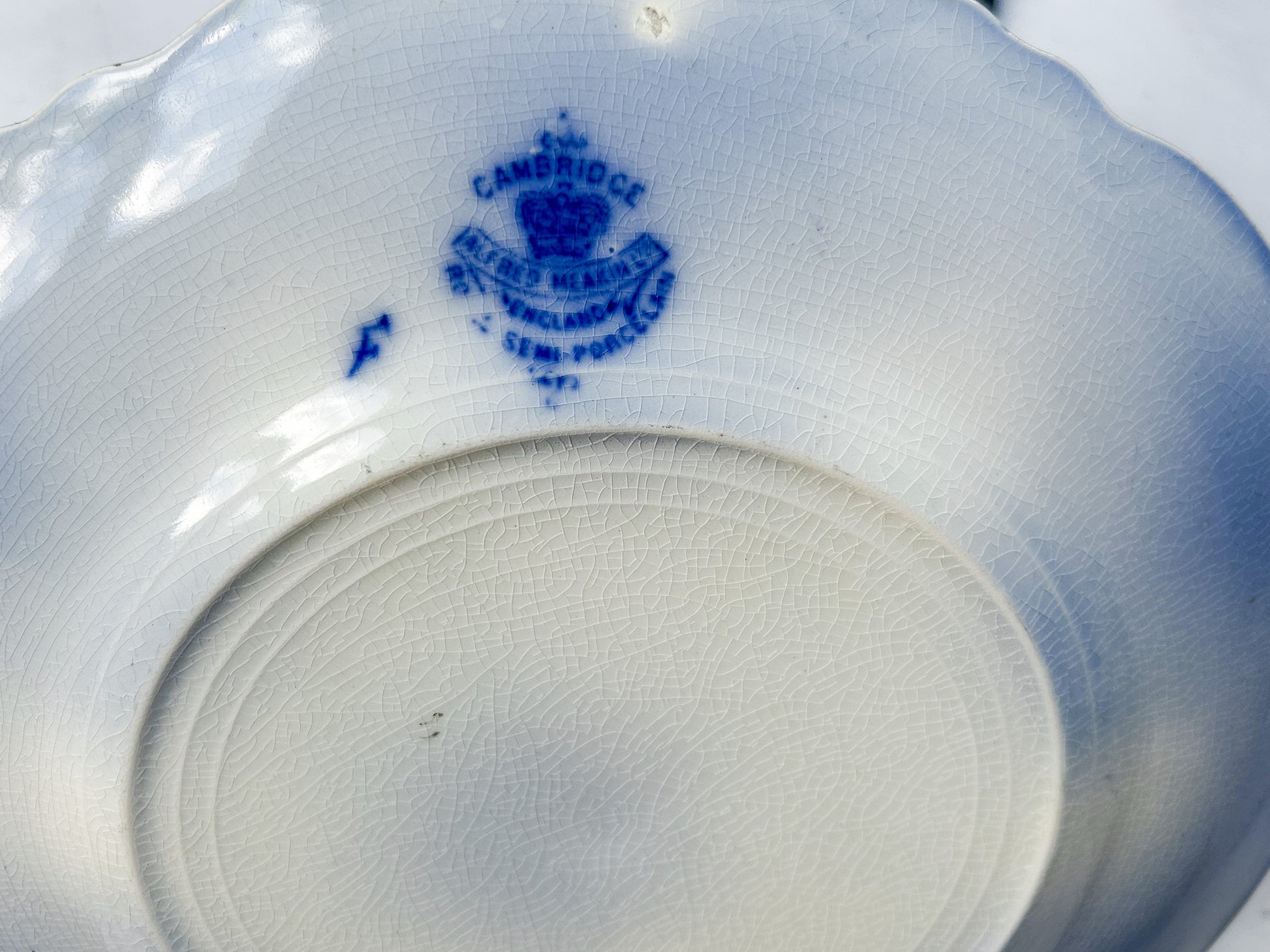 Backstamp reads "Cambridge, Alfred Meakin Royal Sem-porcelain"; dates this piece to c1897. Hand painted gilt over the glaze.