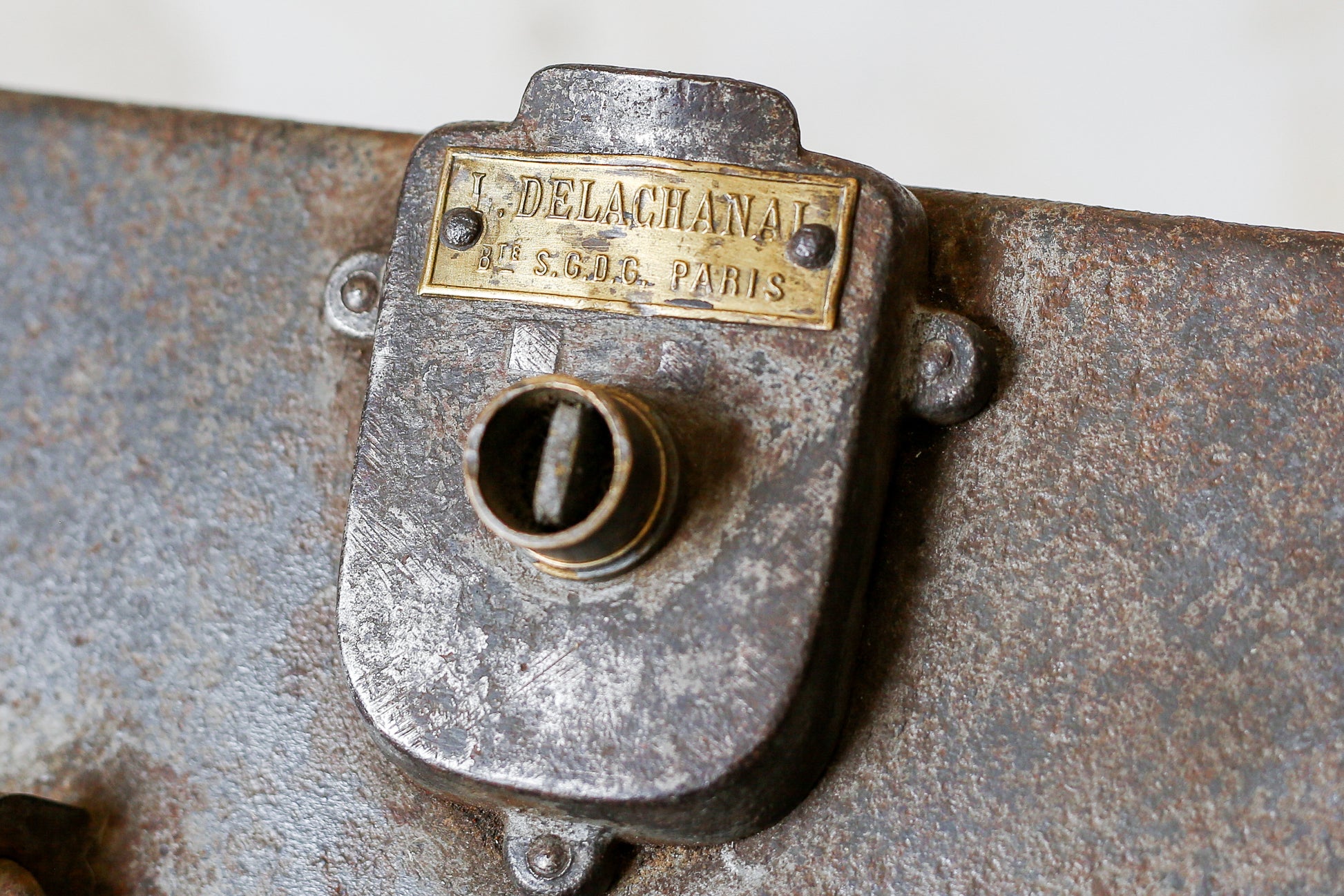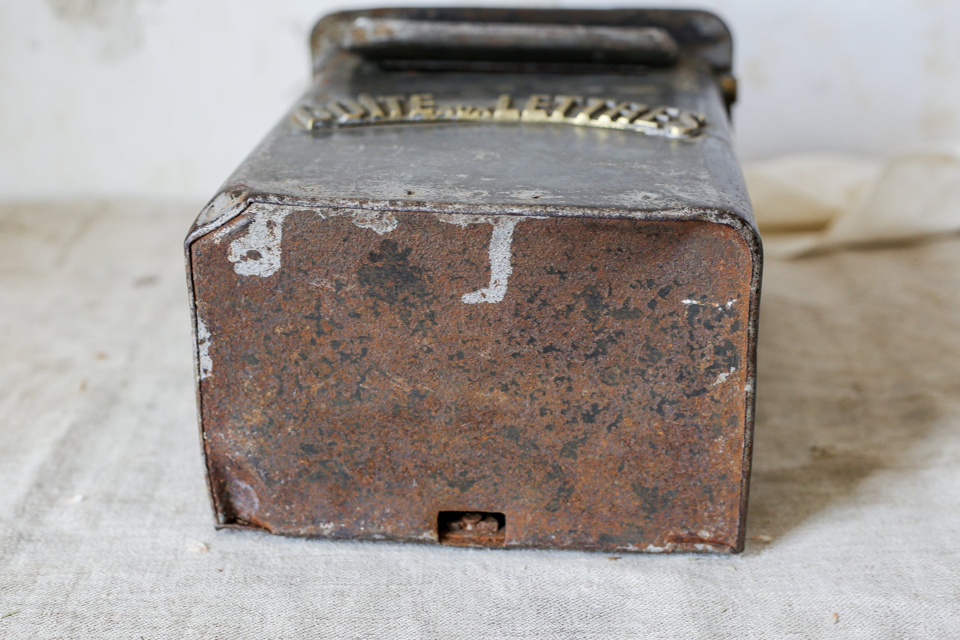 Mailbox is made of metal with worn black finish. Letter flap near top of front, with the words "Boite de Lettres" in raised gold finish. Top latch has a name plate "J. Delachanal Paris". Metal handle attached to top.