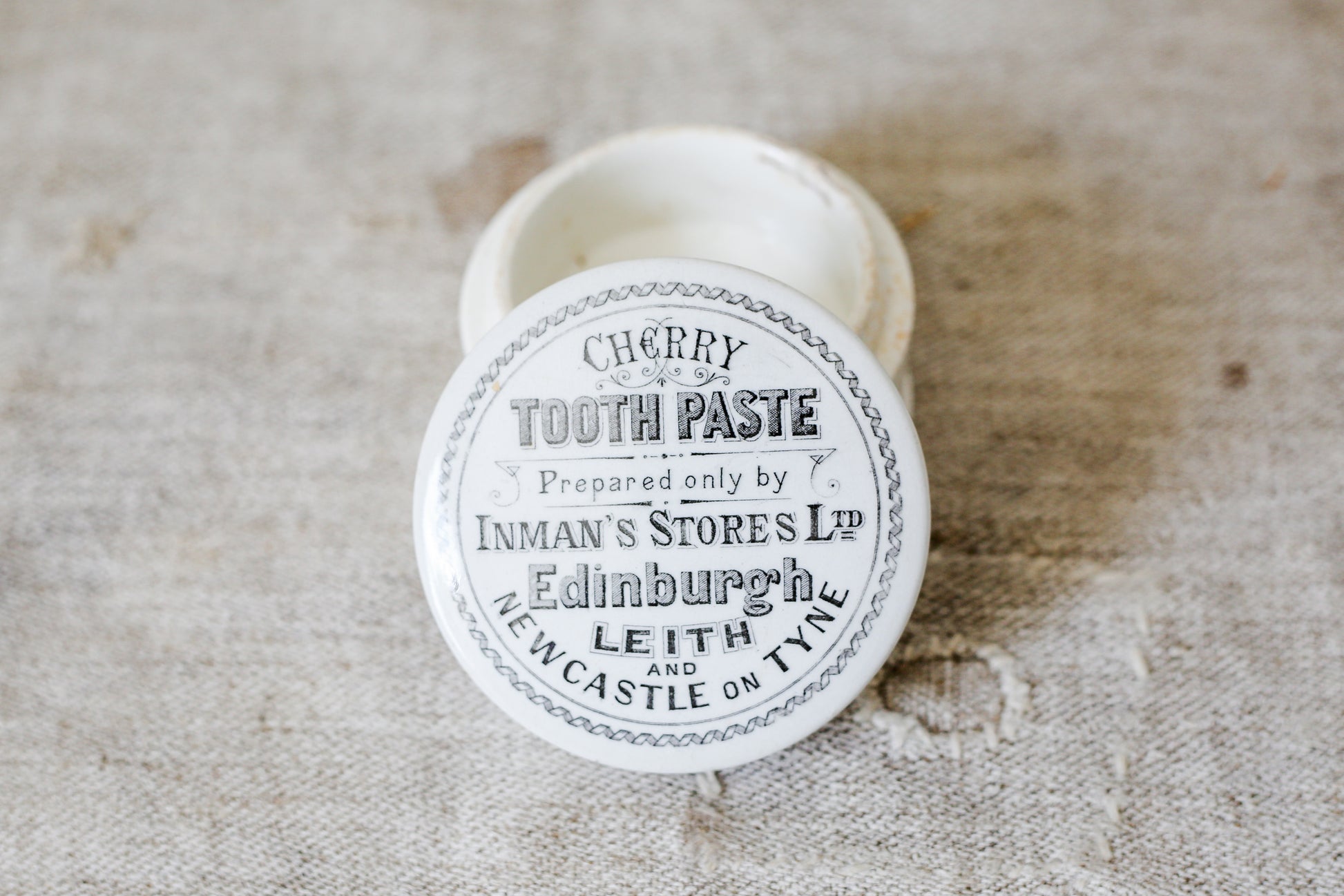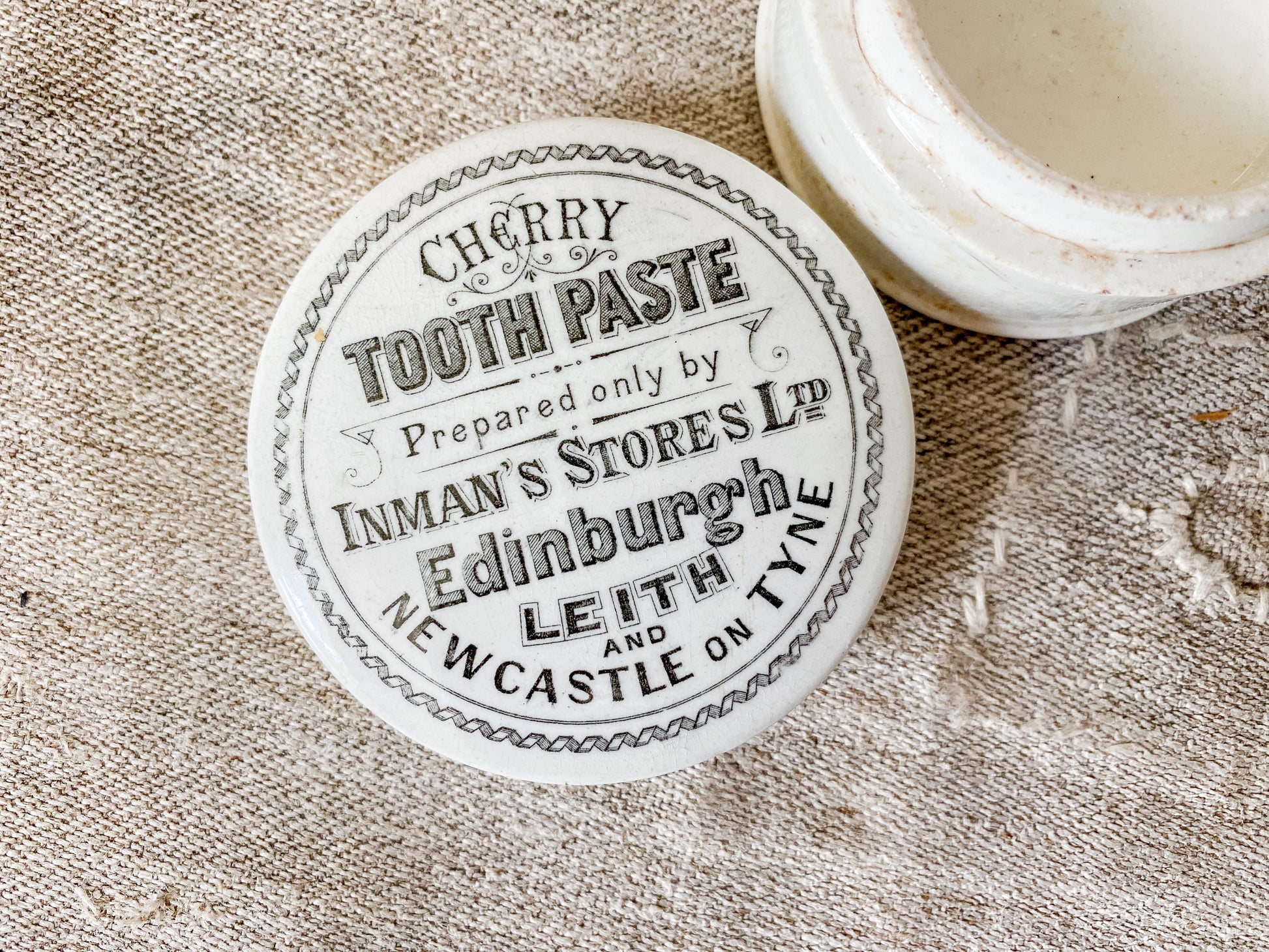 Available is an antique stoneware toothpaste pot with lid. The attractive antique lettering reads "Cherry Toothpaste Prepared by Inman's Stores Ltd, Edinburgh, Leith and Newcastle-on-Tyne."