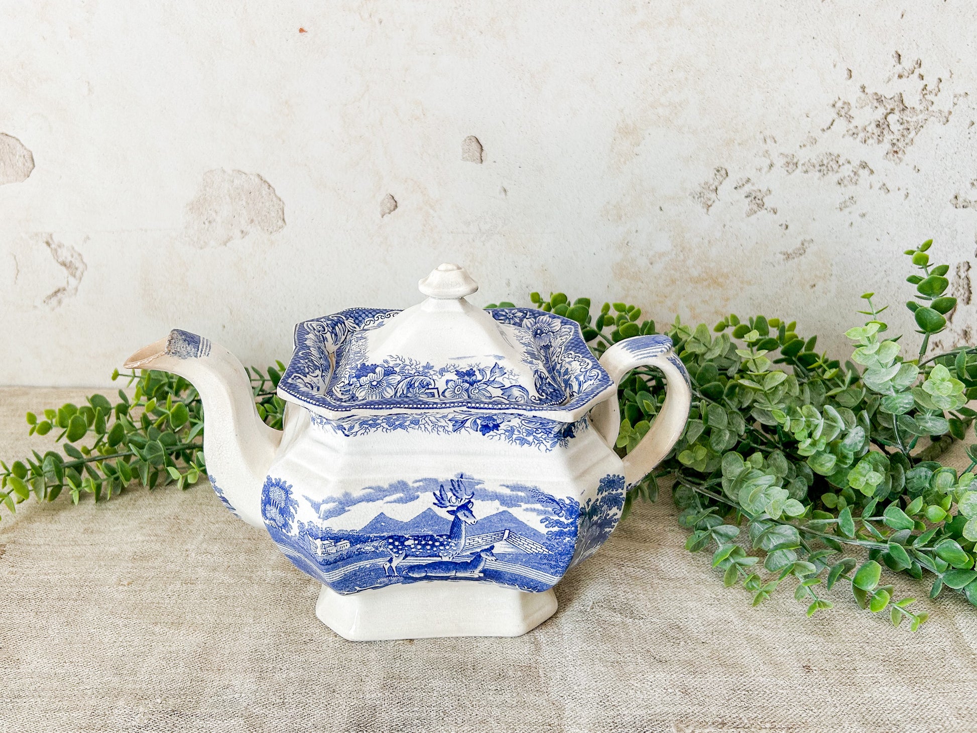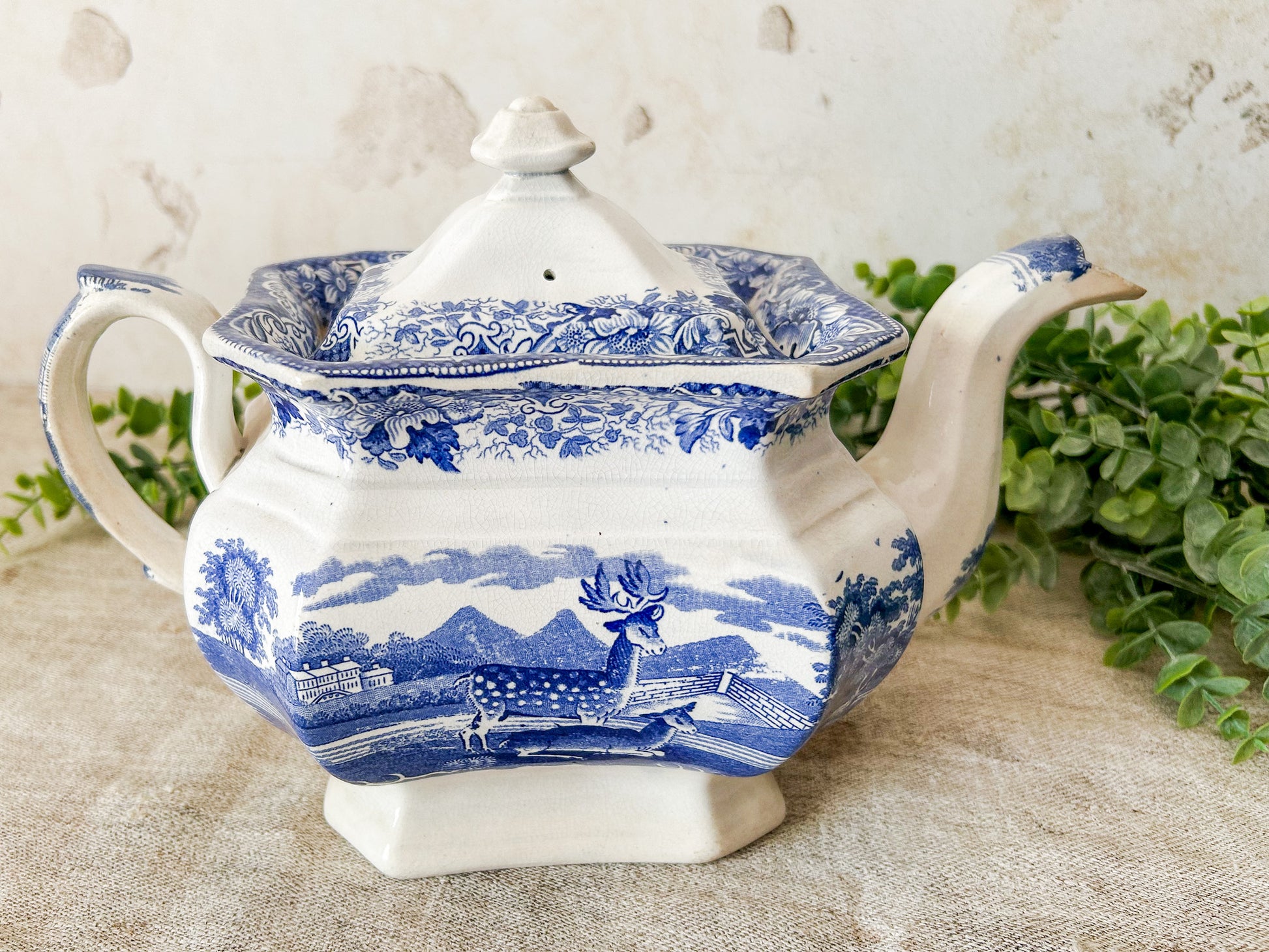 Available is an antique ironstone teapot with unusual transfer design and strong cobalt colors. The teapot sides are decorated with two deer, set against a mountain backdrop. Additional floral borders on rim and lid. Staining and small chip to spout. Small old chip to inside rim of teapot. No maker's stamp.