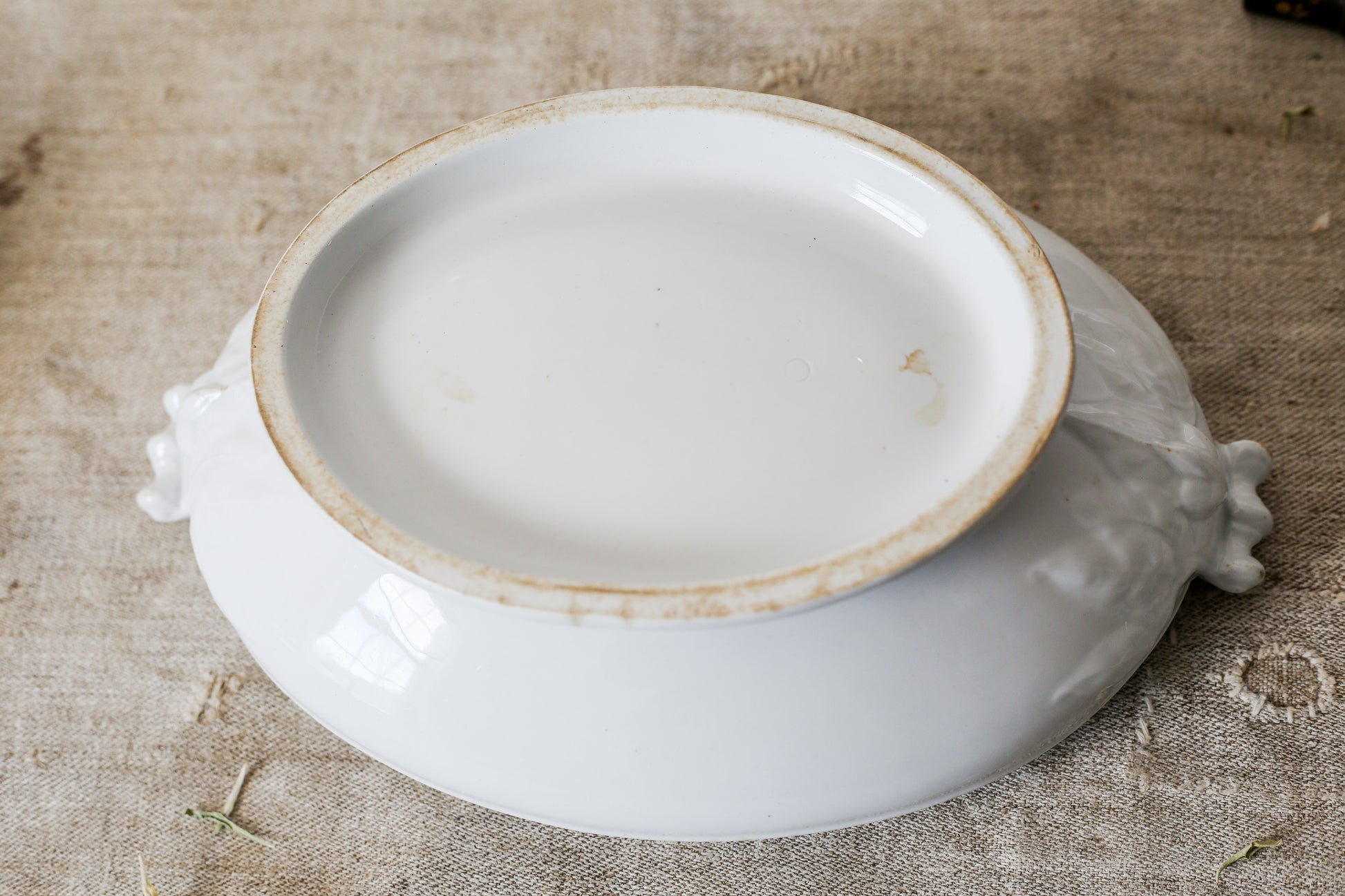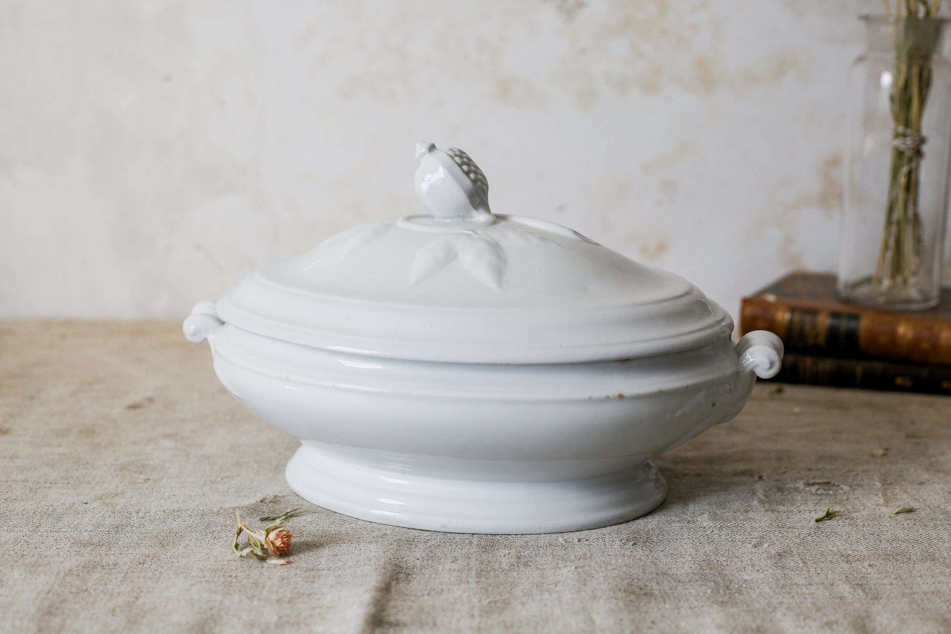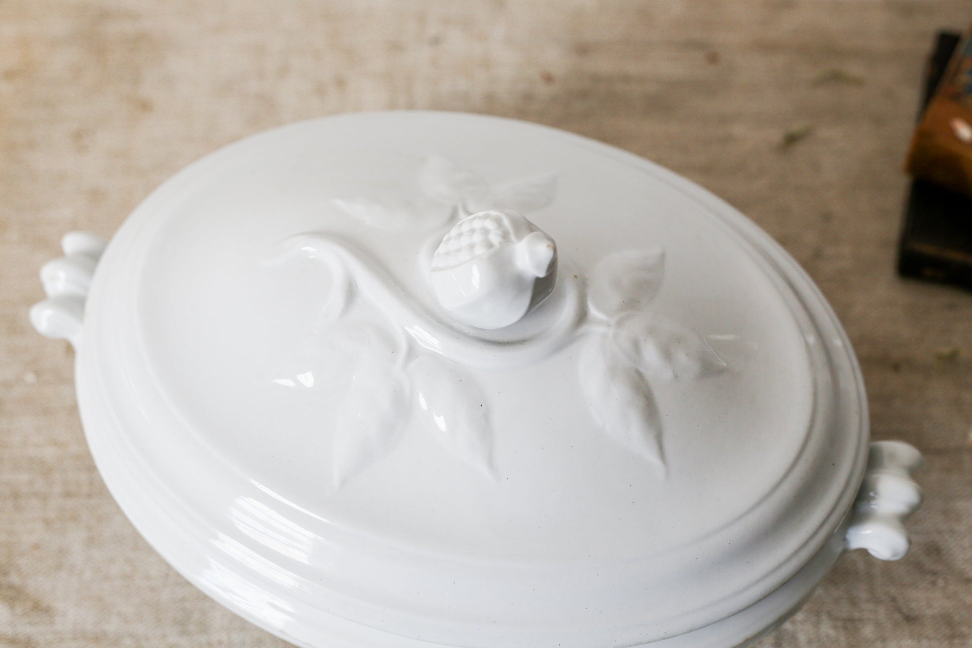 Available is an antique ironstone covered vegetable dish. This lovely piece features a corn-shaped knob on the lid with vines trailing down, as well as vines around the curved handles on the base.