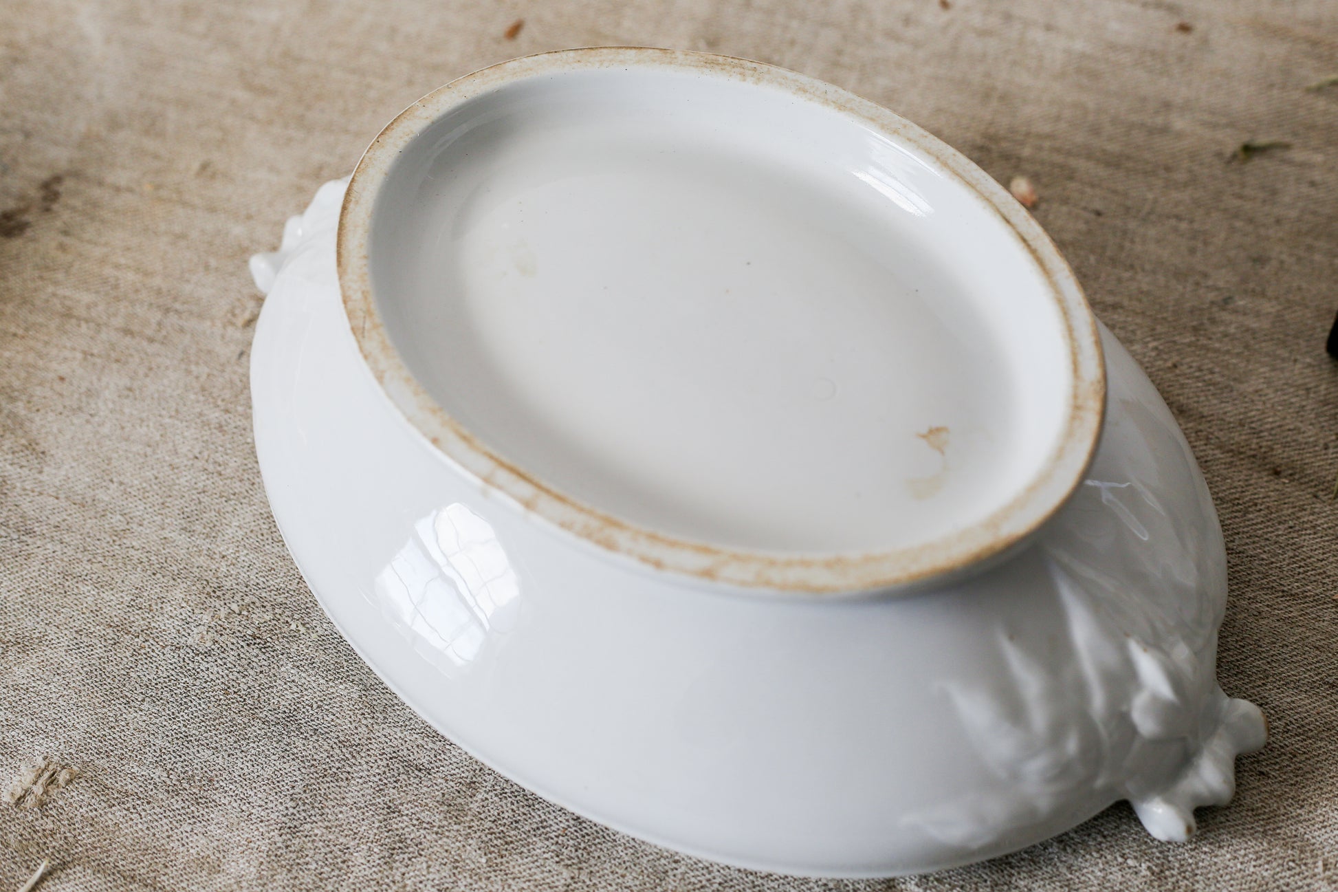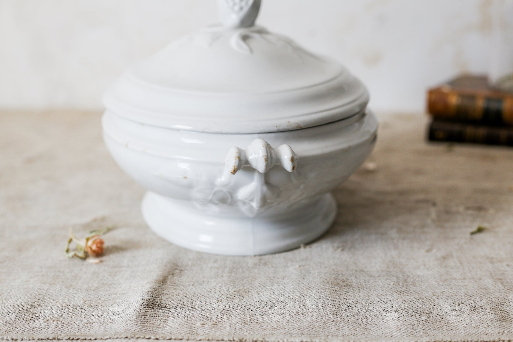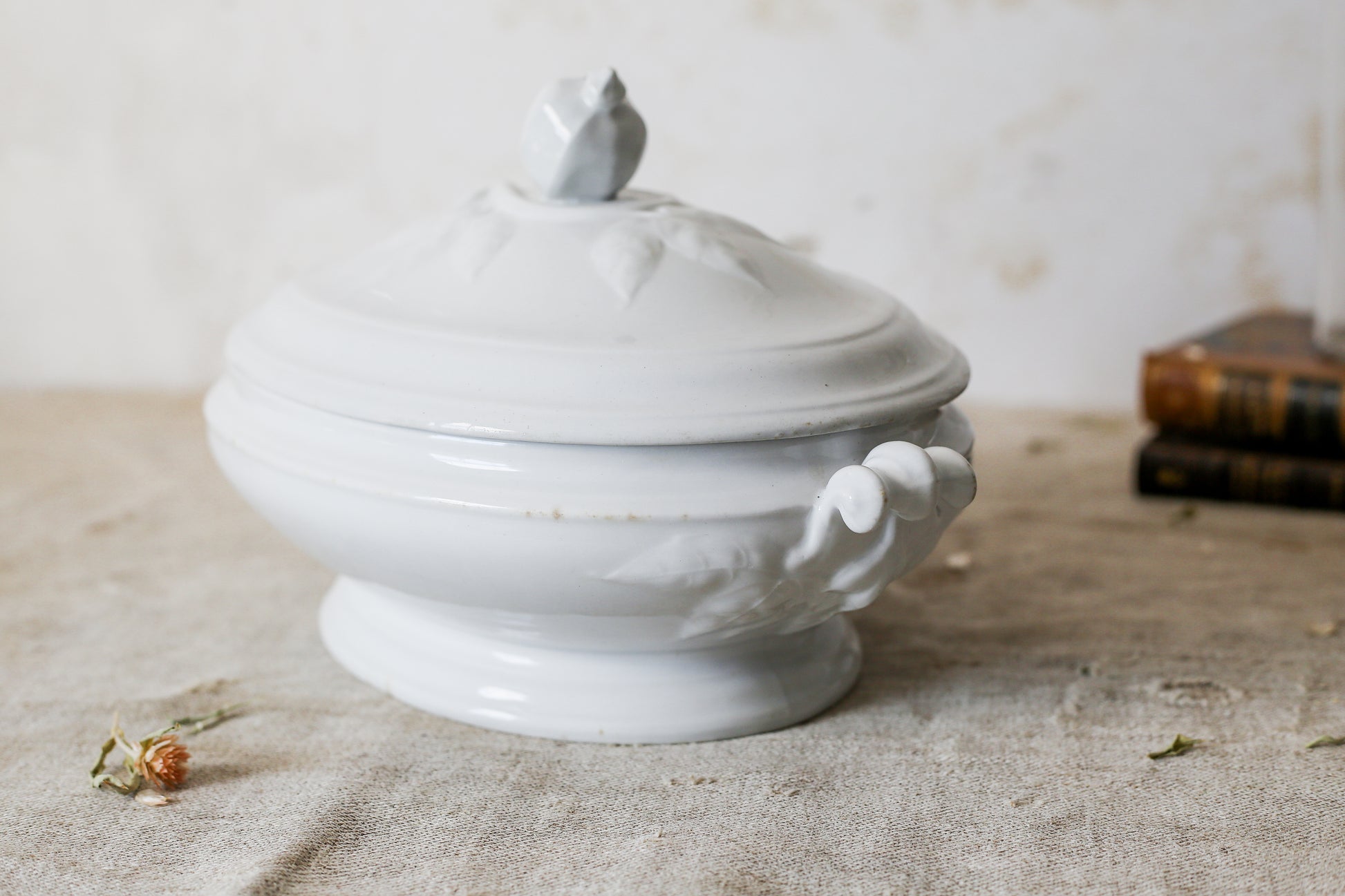 Available is an antique ironstone covered vegetable dish. This lovely piece features a corn-shaped knob on the lid with vines trailing down, as well as vines around the curved handles on the base.