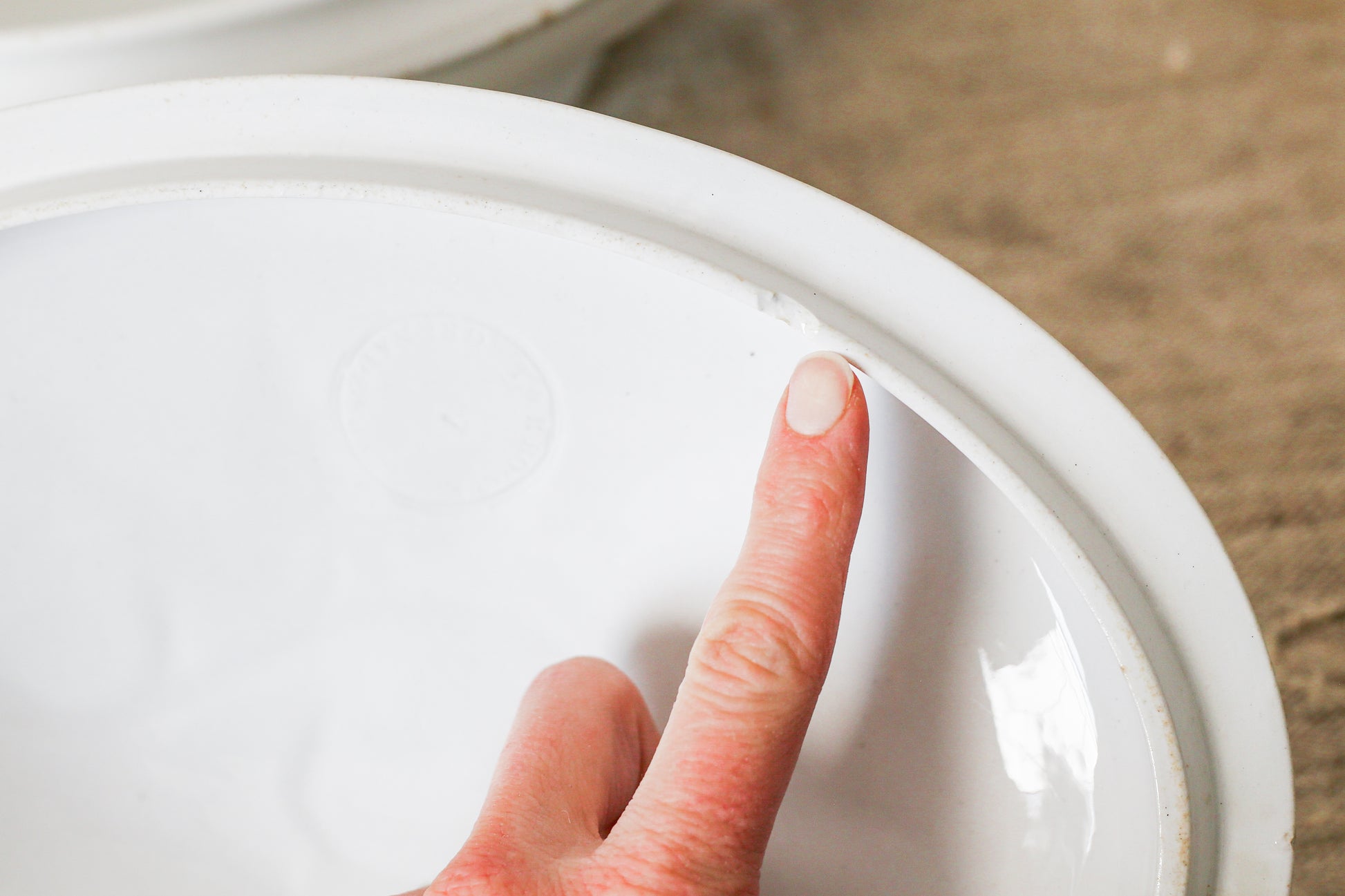 No crazing. Small chip covered by glaze on edge of lid. Some wear and staining on the handles. Please review all photos.