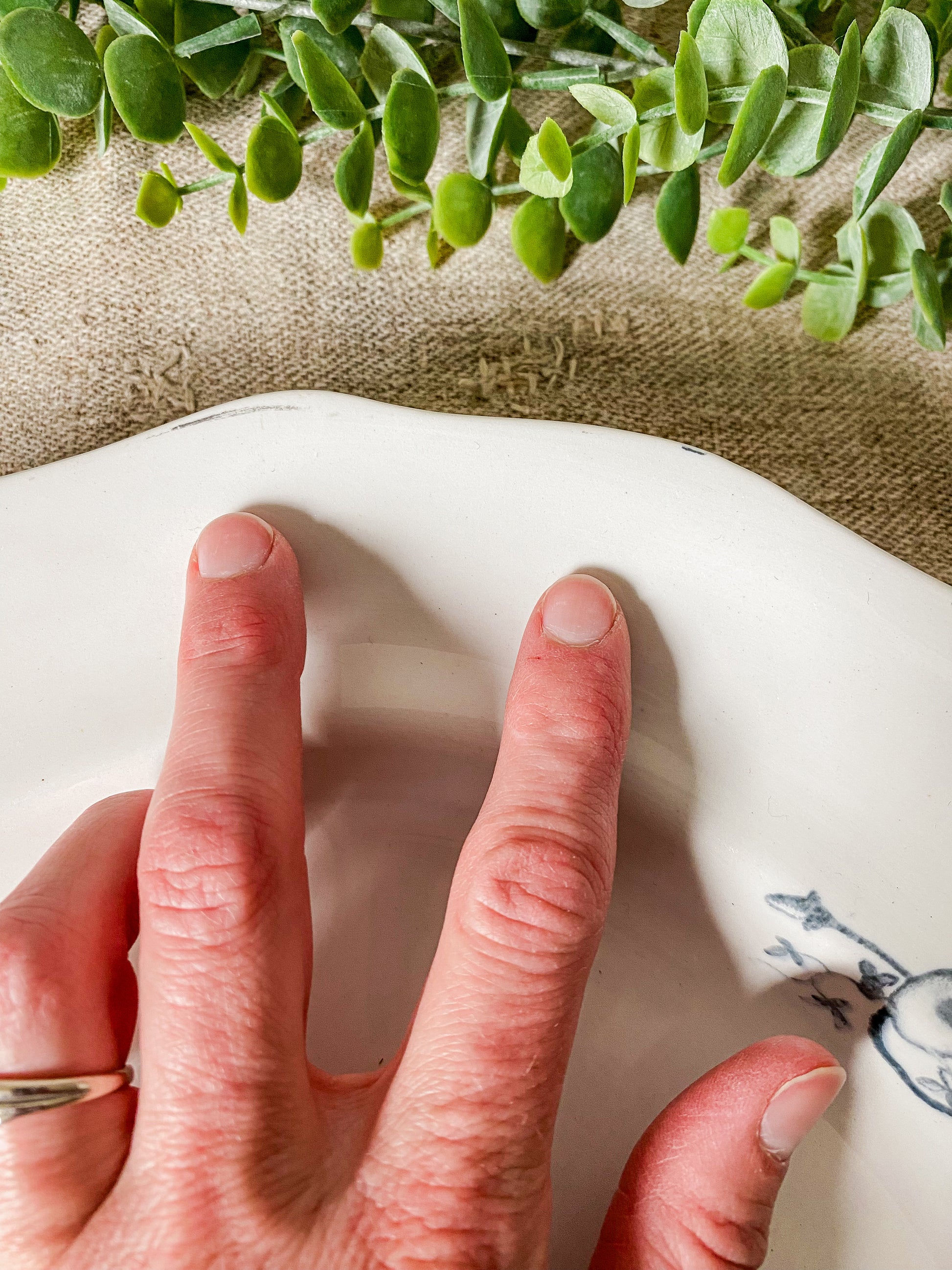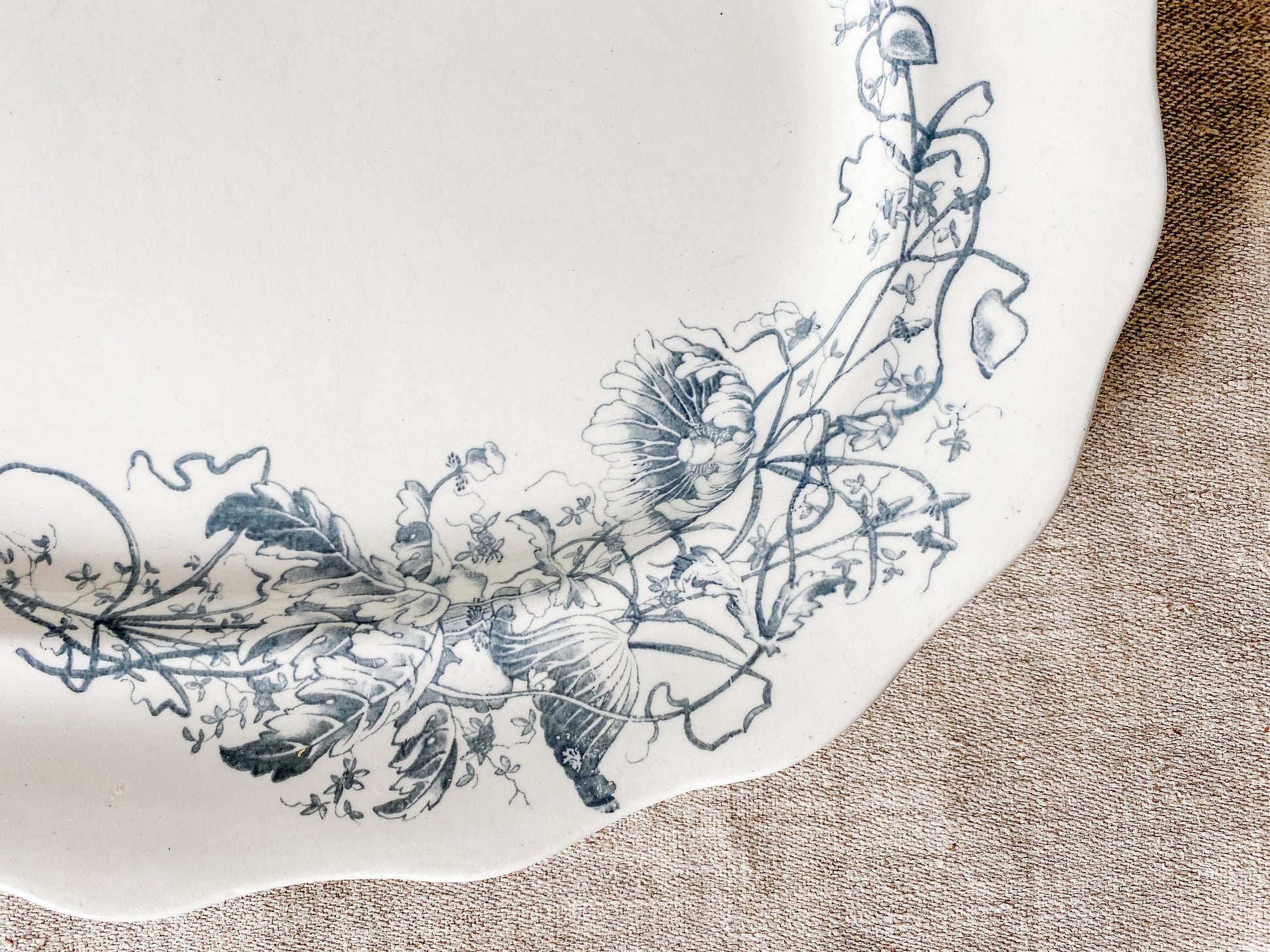 Scalloped rim with dark blue, detailed floral designs on opposing corners. Small black scuffs to rim in two places; otherwise excellent antique condition.