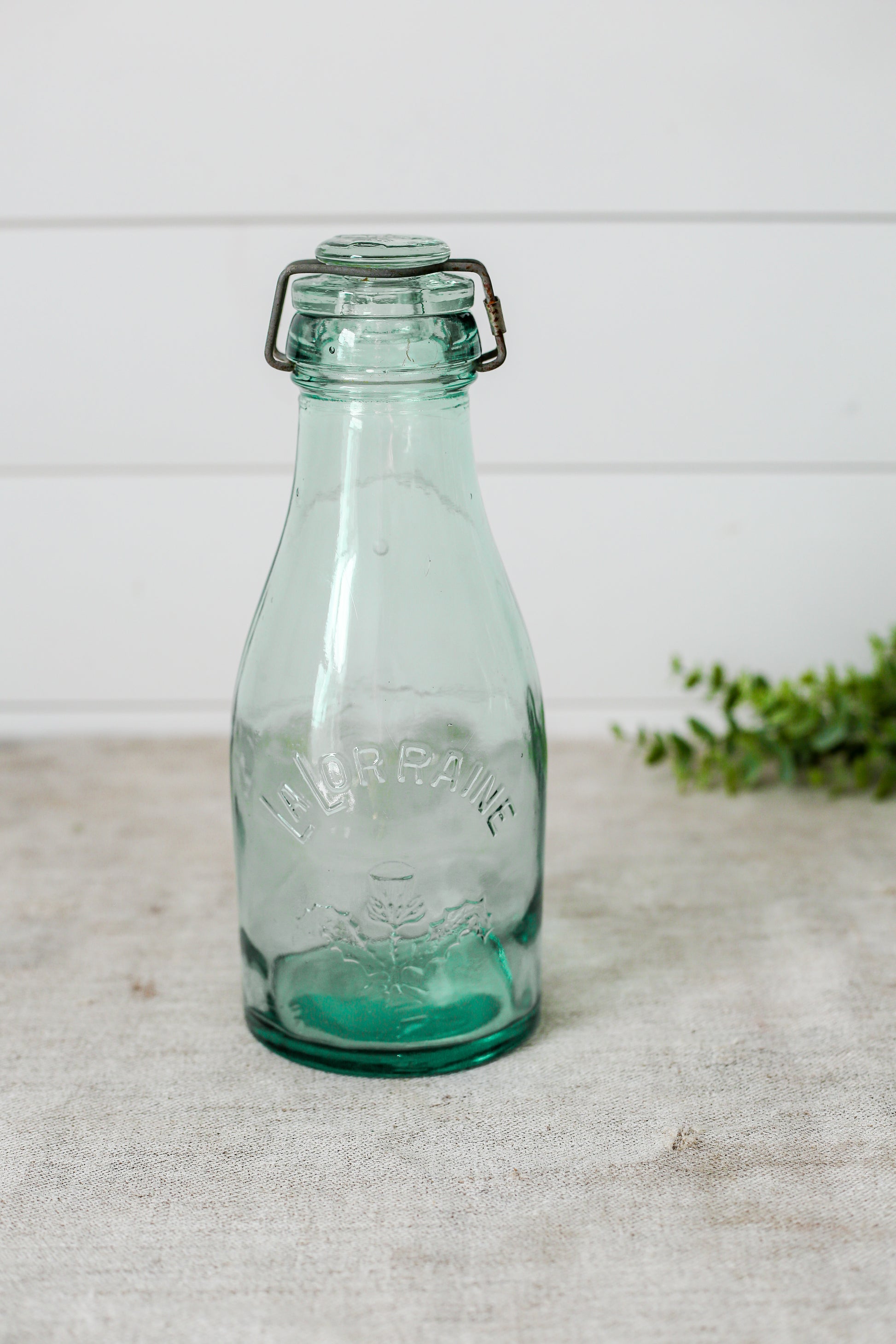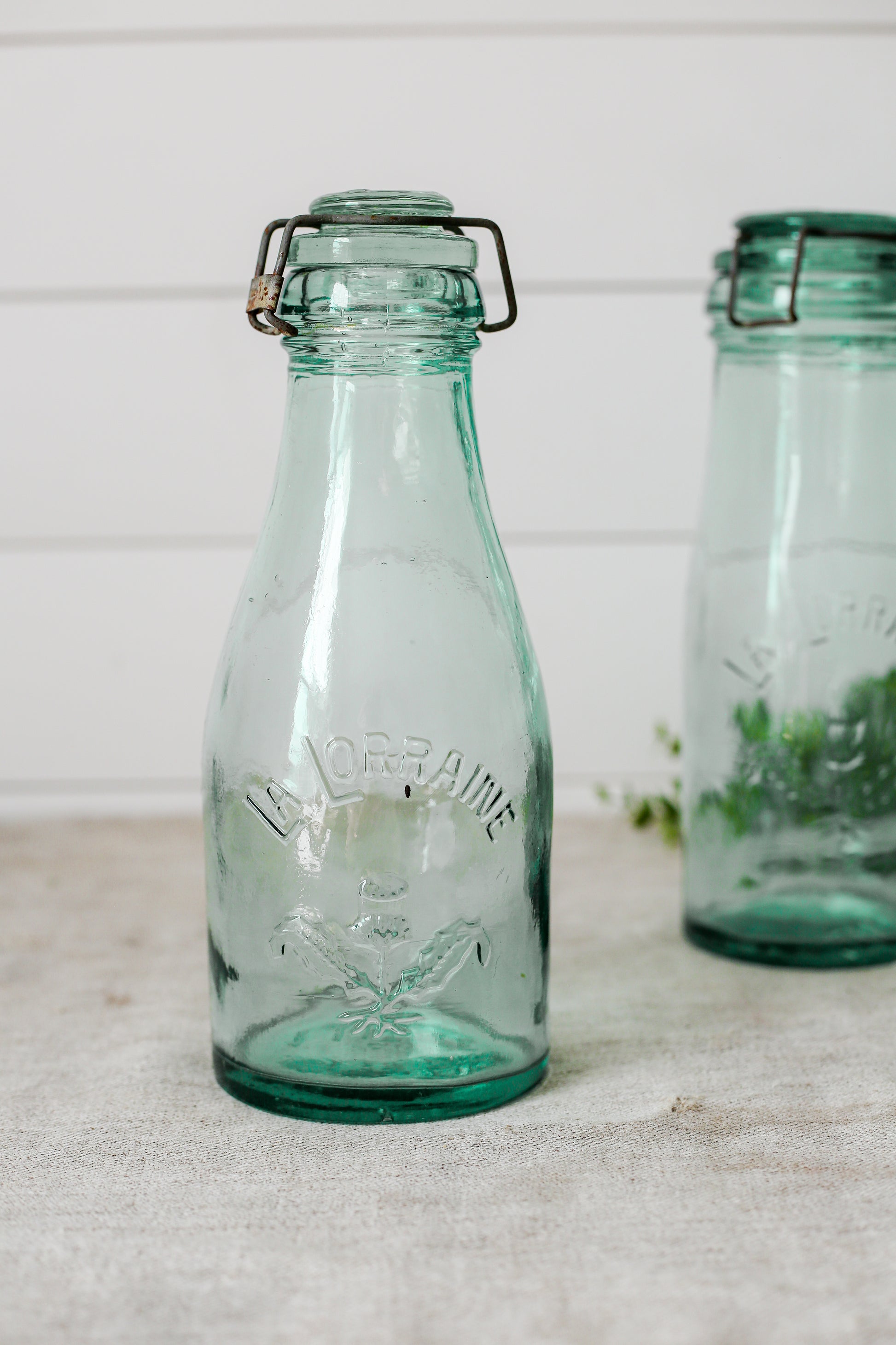 Available are three antique French canning jars. Each reads "La Lorraine" in raised letters, with a thistle design on front and on the lid. There is a metal wire locking mechanism holding the glass lids in place.