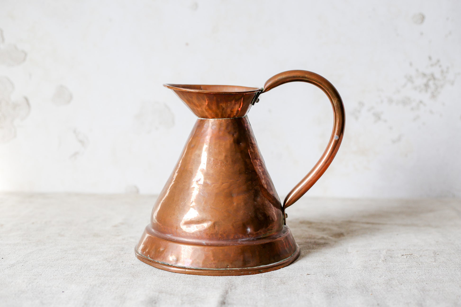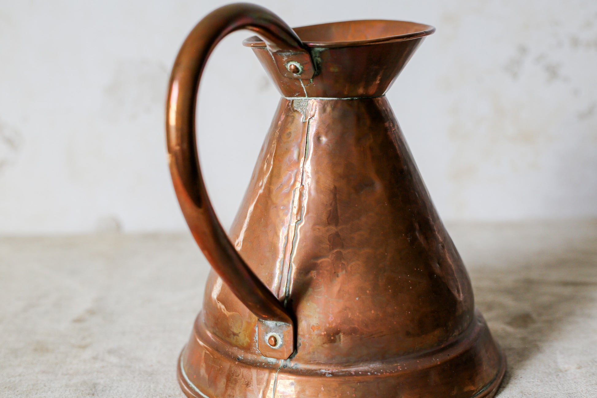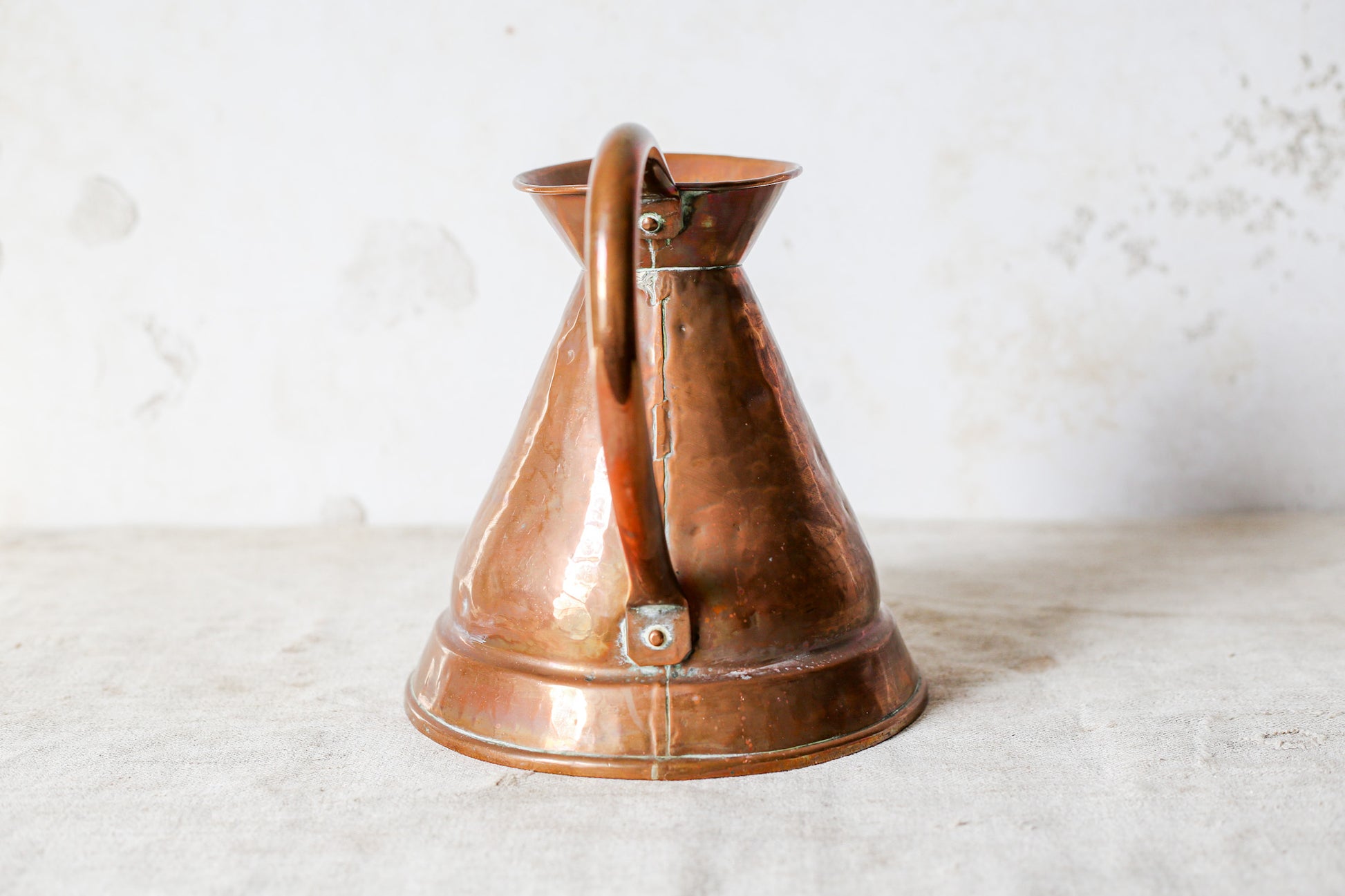 Hammered copper harvest jug with swan neck handle and triangular base. Brazed clamp seams visible. Some small dents and wear around the body that do not detract from the overall display.
