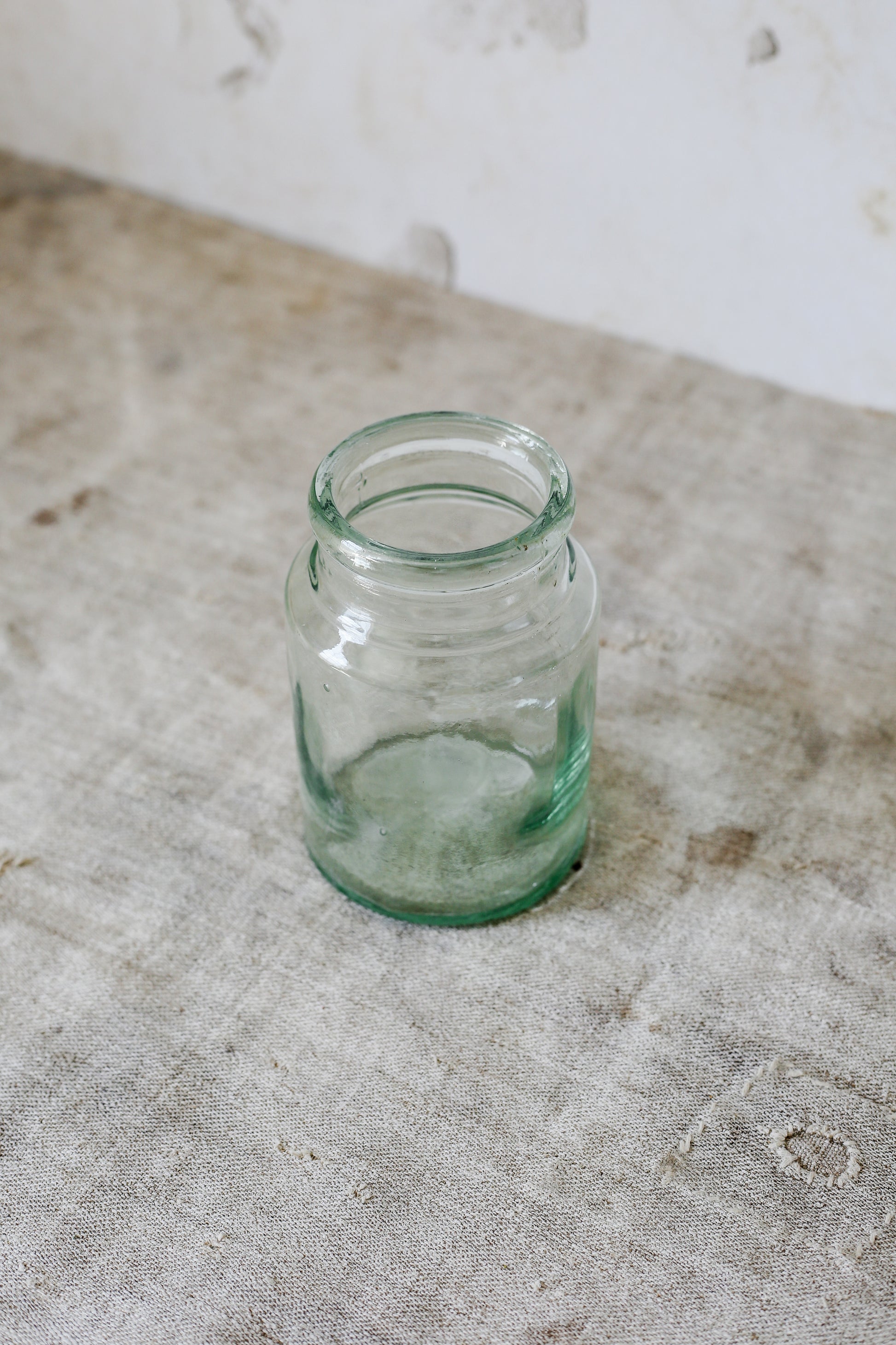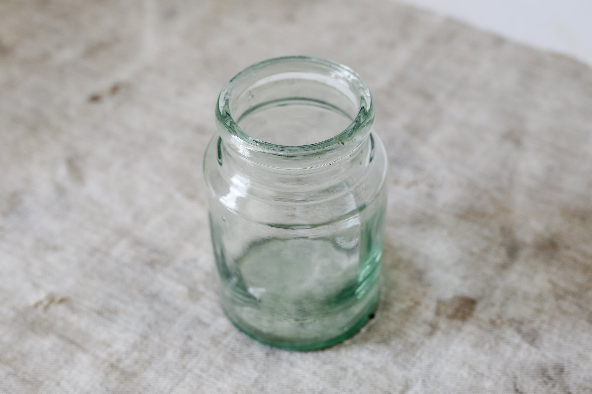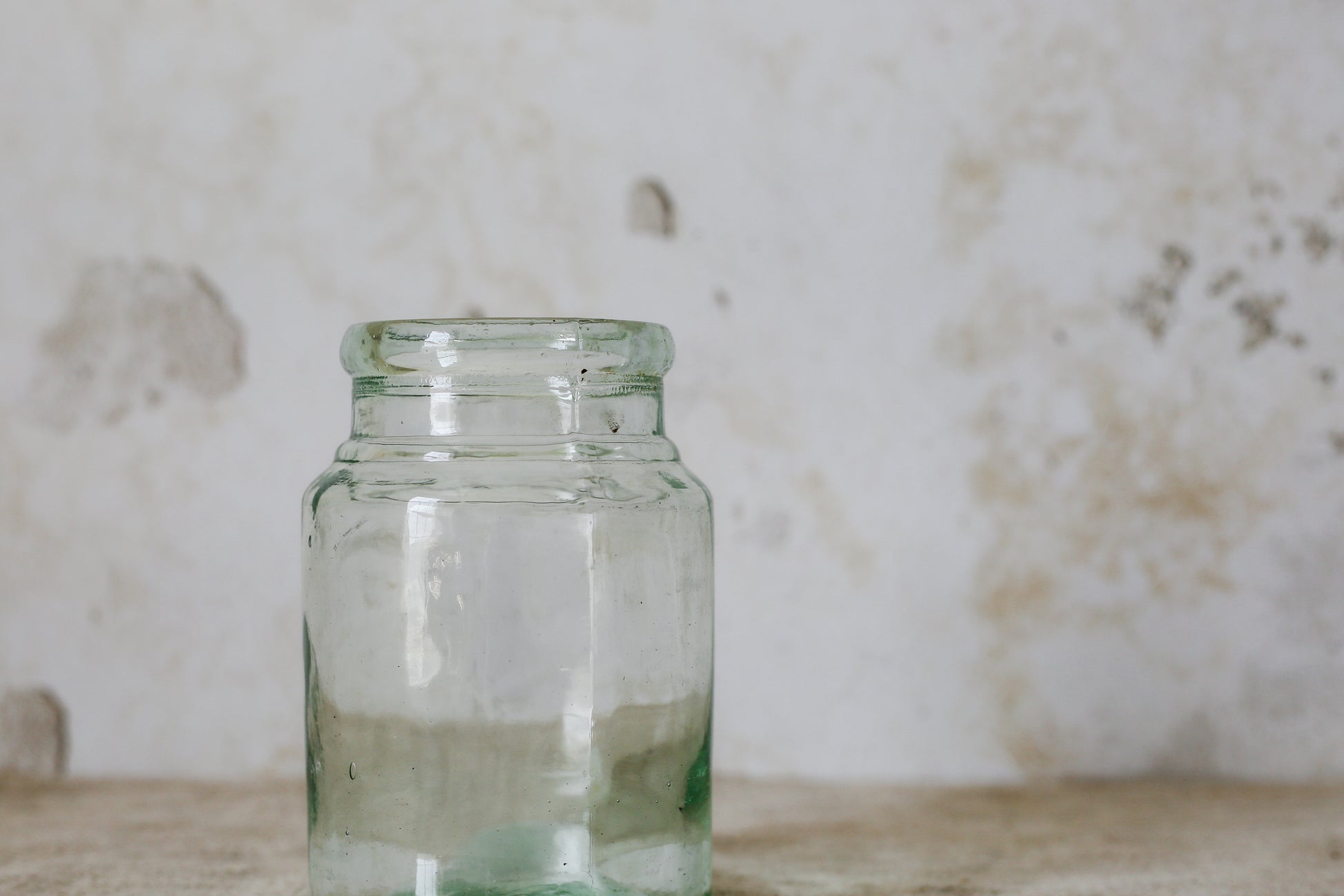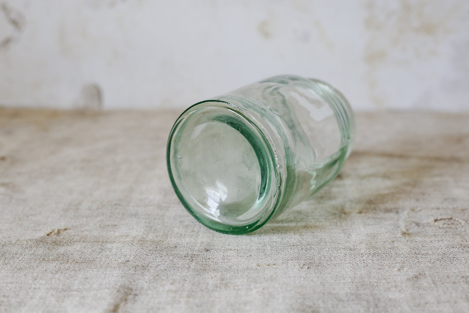 A striking antique English canning jar made from thick green glass. This large, utilitarian piece combines beauty and function, perfect for display or vintage kitchen décor.