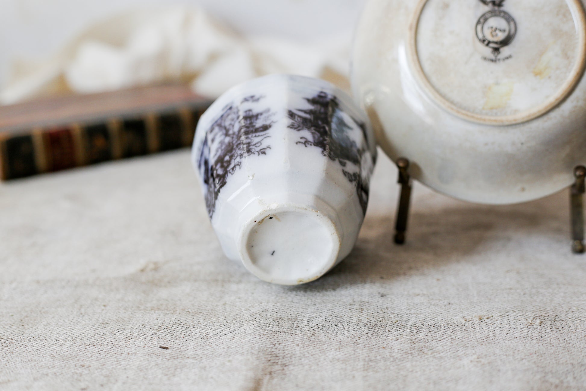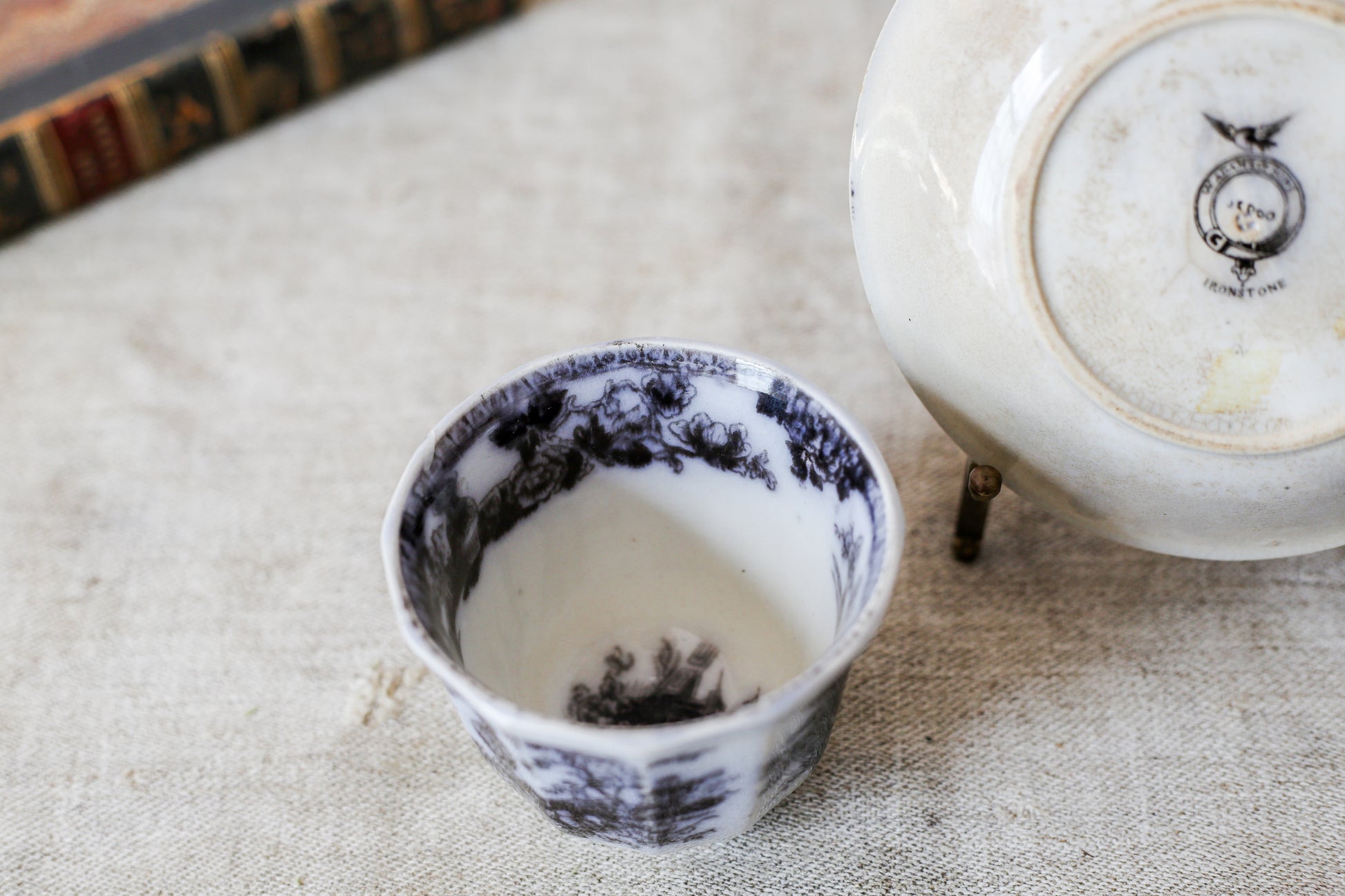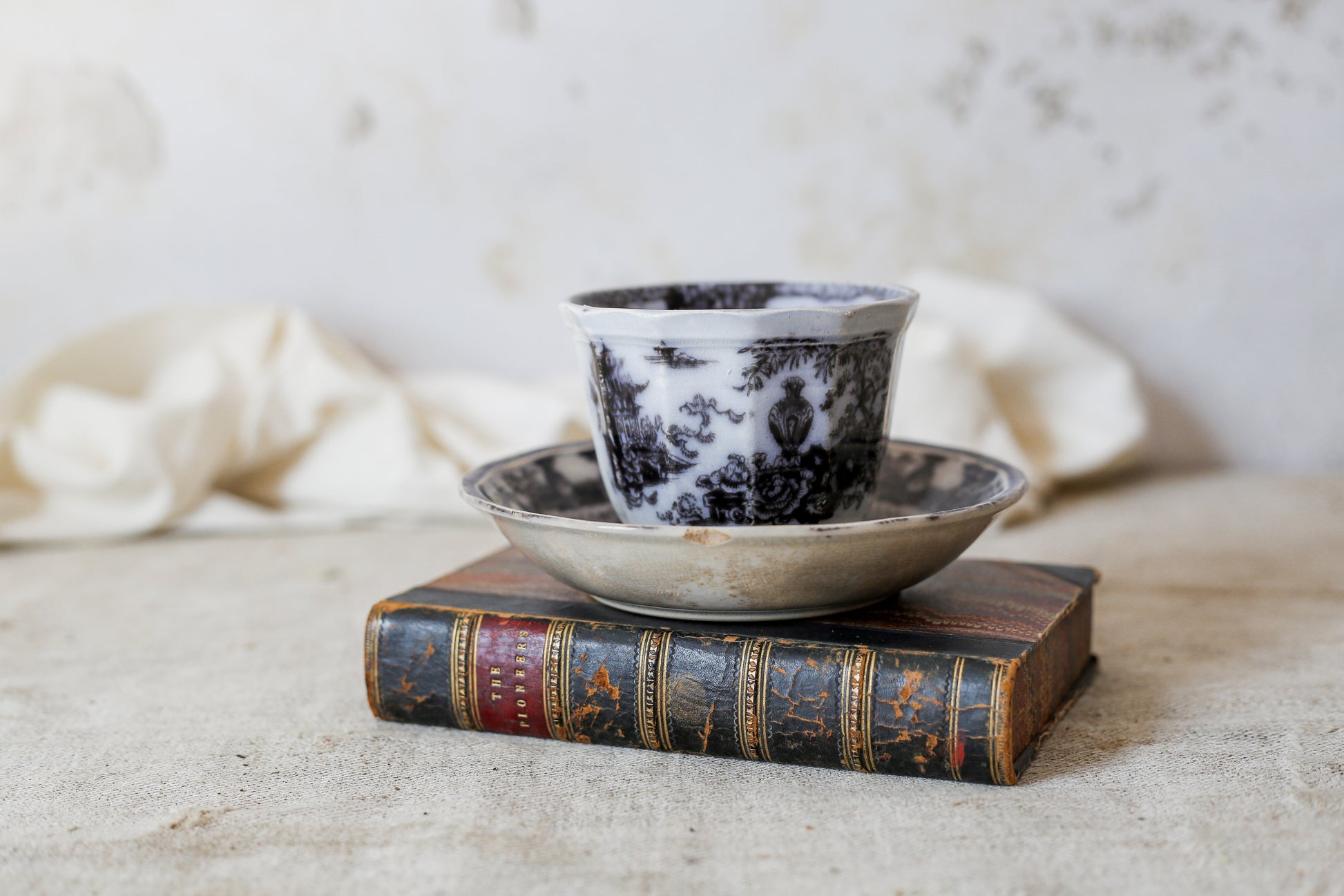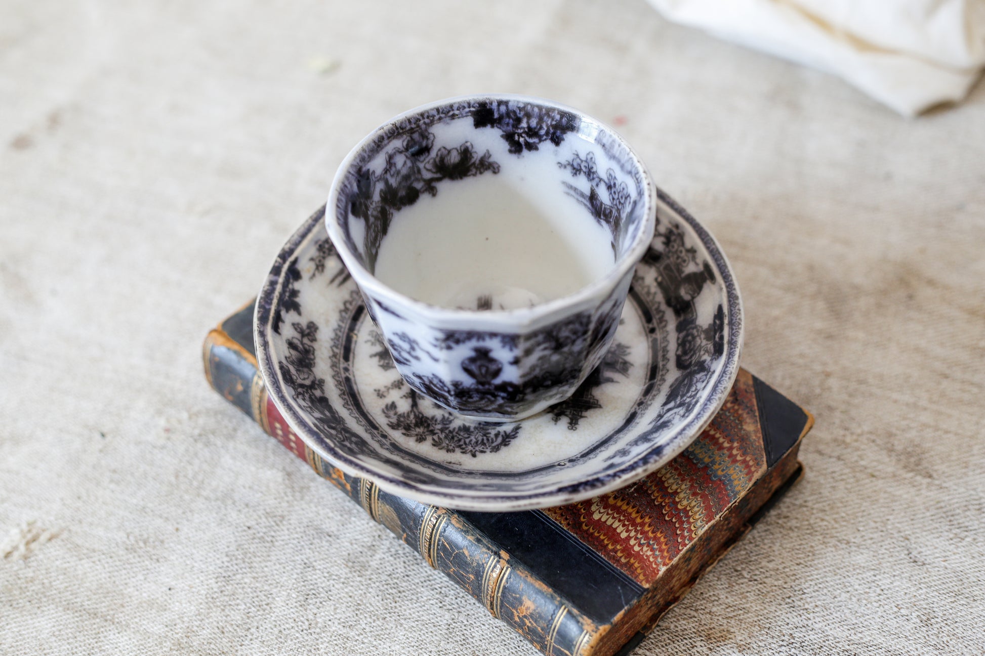 Available is an antique black transferware teacup and saucer set. The chinoiserie pattern shows floral motifs and pagodas with pastoral scenery.