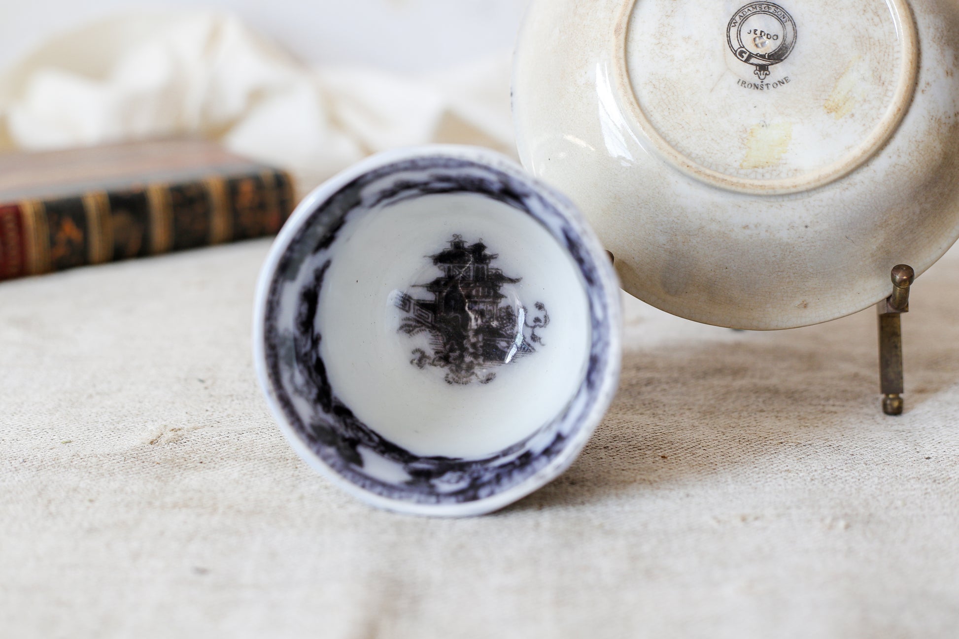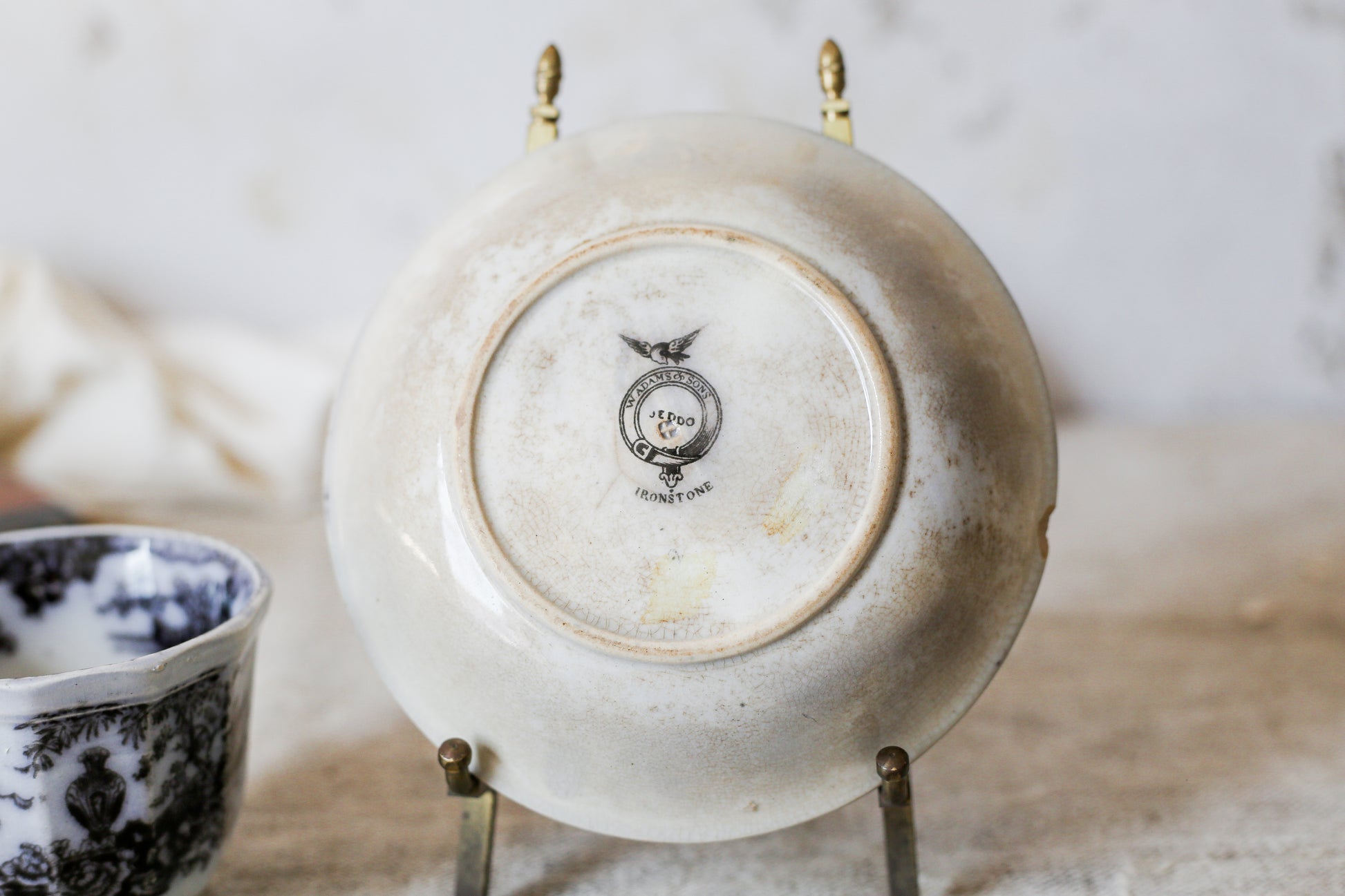 Heavy staining and crazing. Small chip in edge of saucer. The teacup is handleless. Bottom of plate is stamped W. Adams & Sons, Jeddo, Ironstone; dates the set to 1820-1860.