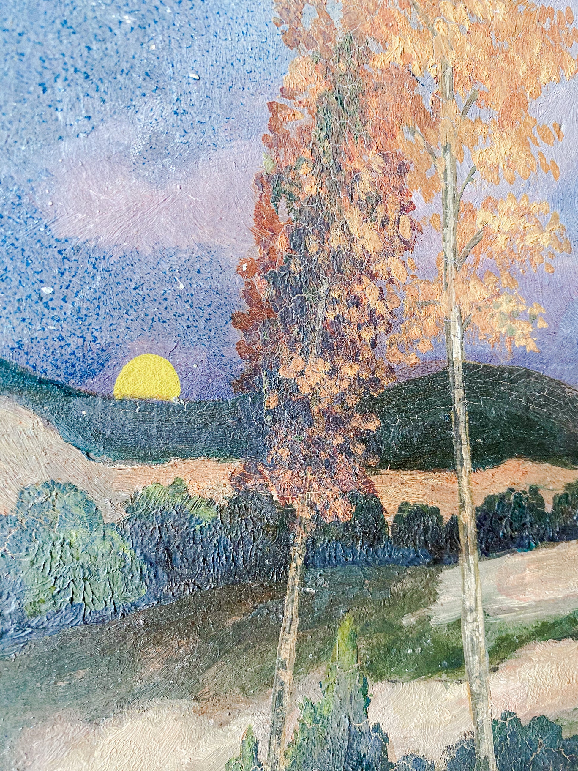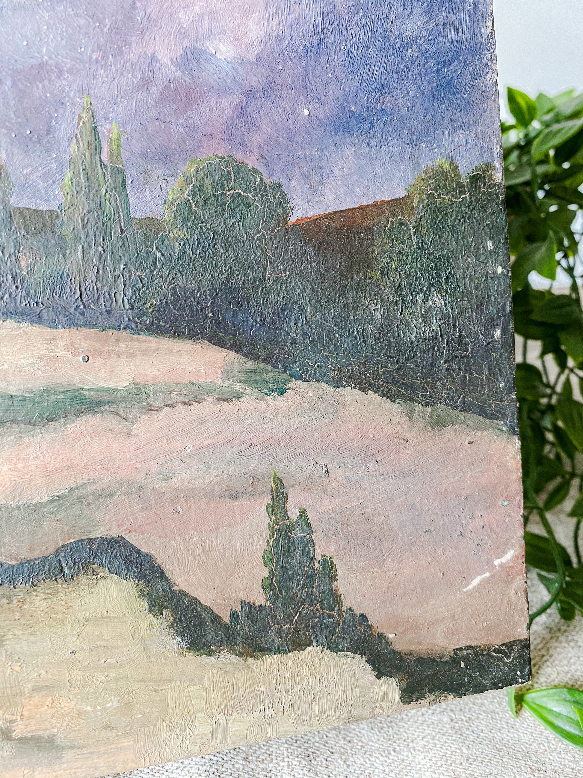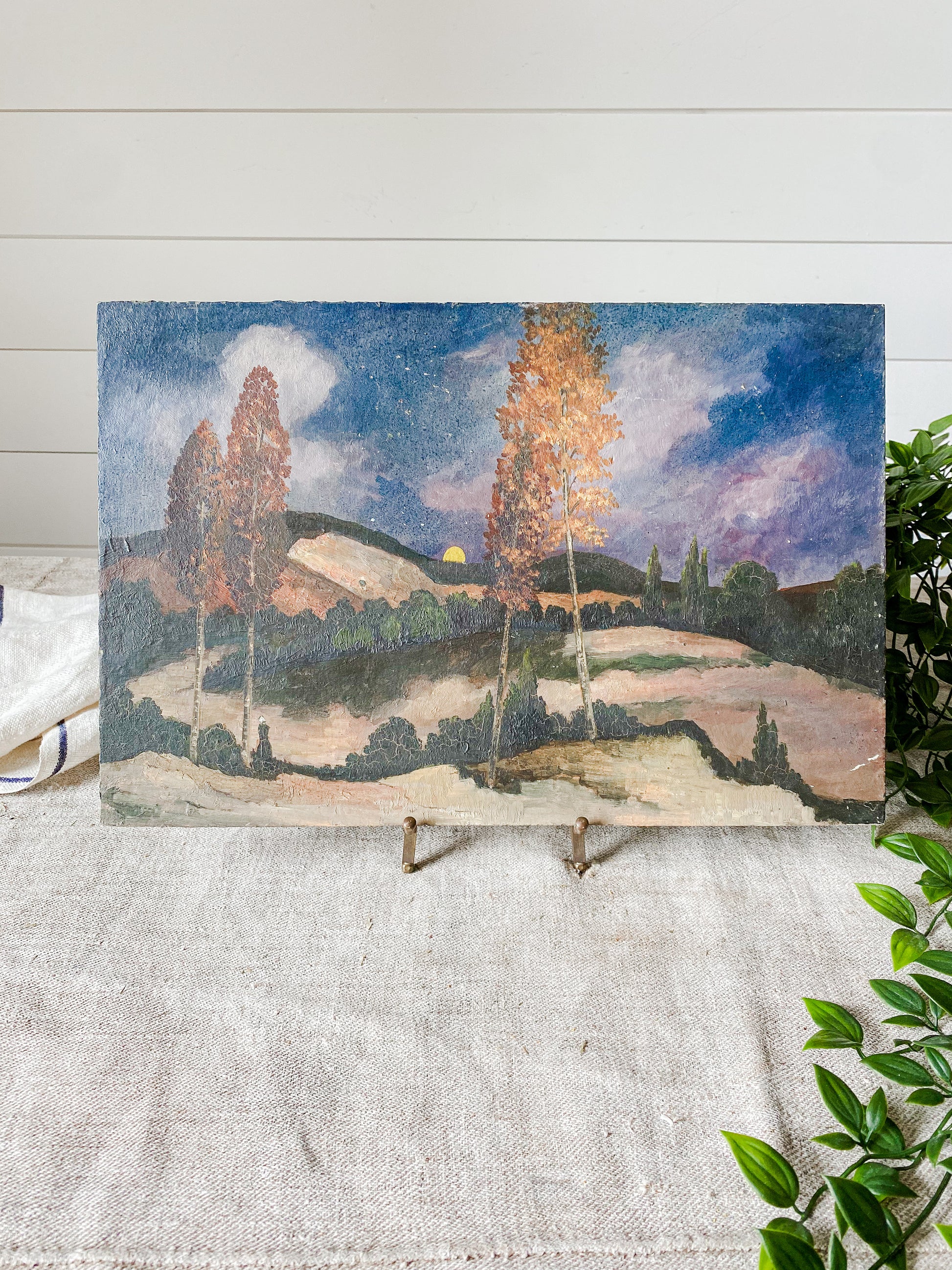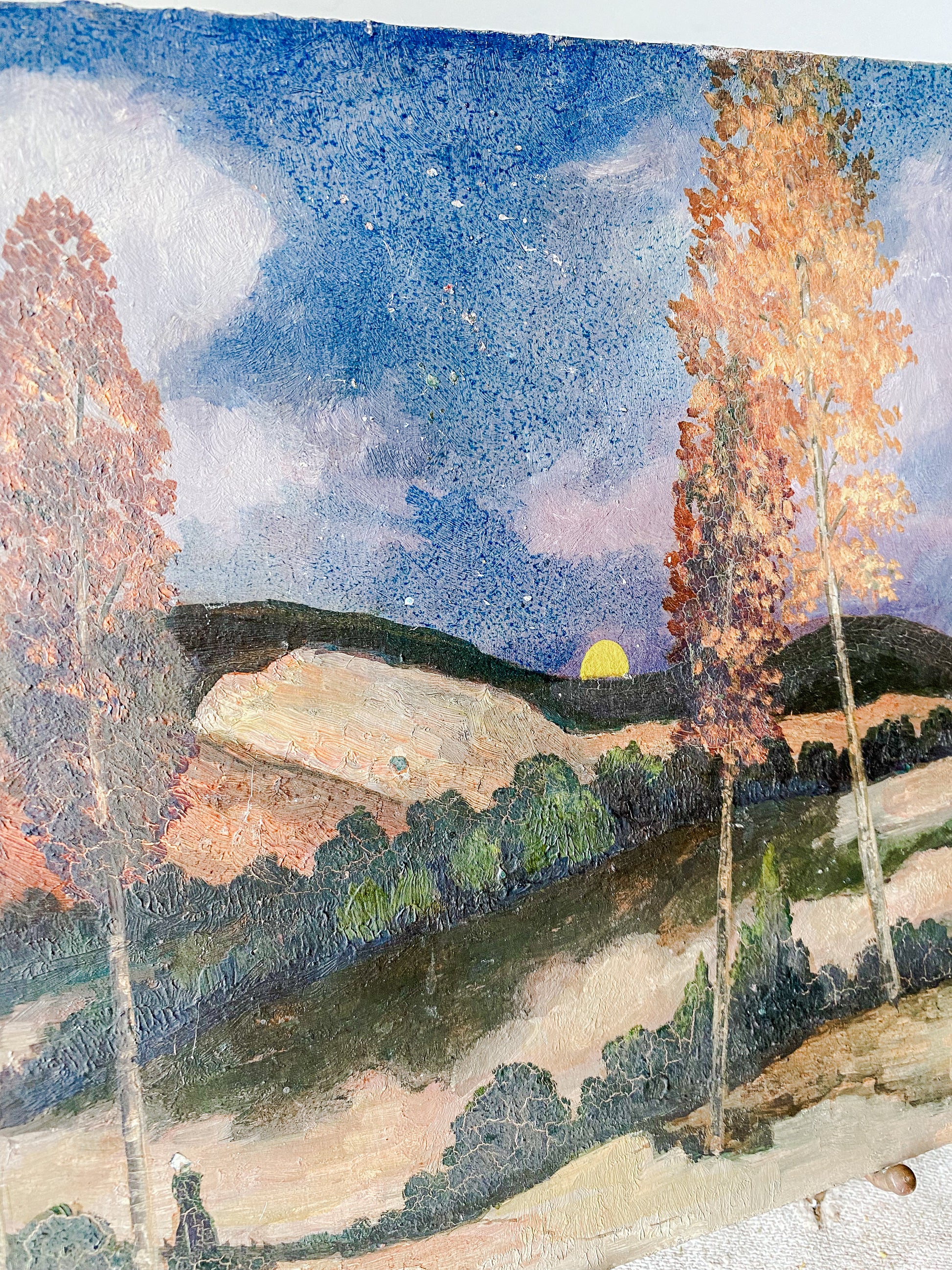 Available is an original antique oil painting featuring a moonlit landscape of dunes and trees. It is painted on board and has a label on the back with the title. The warm tunes of blue, purple and yellow add a moody dark cottagecore vibe to your home decor.